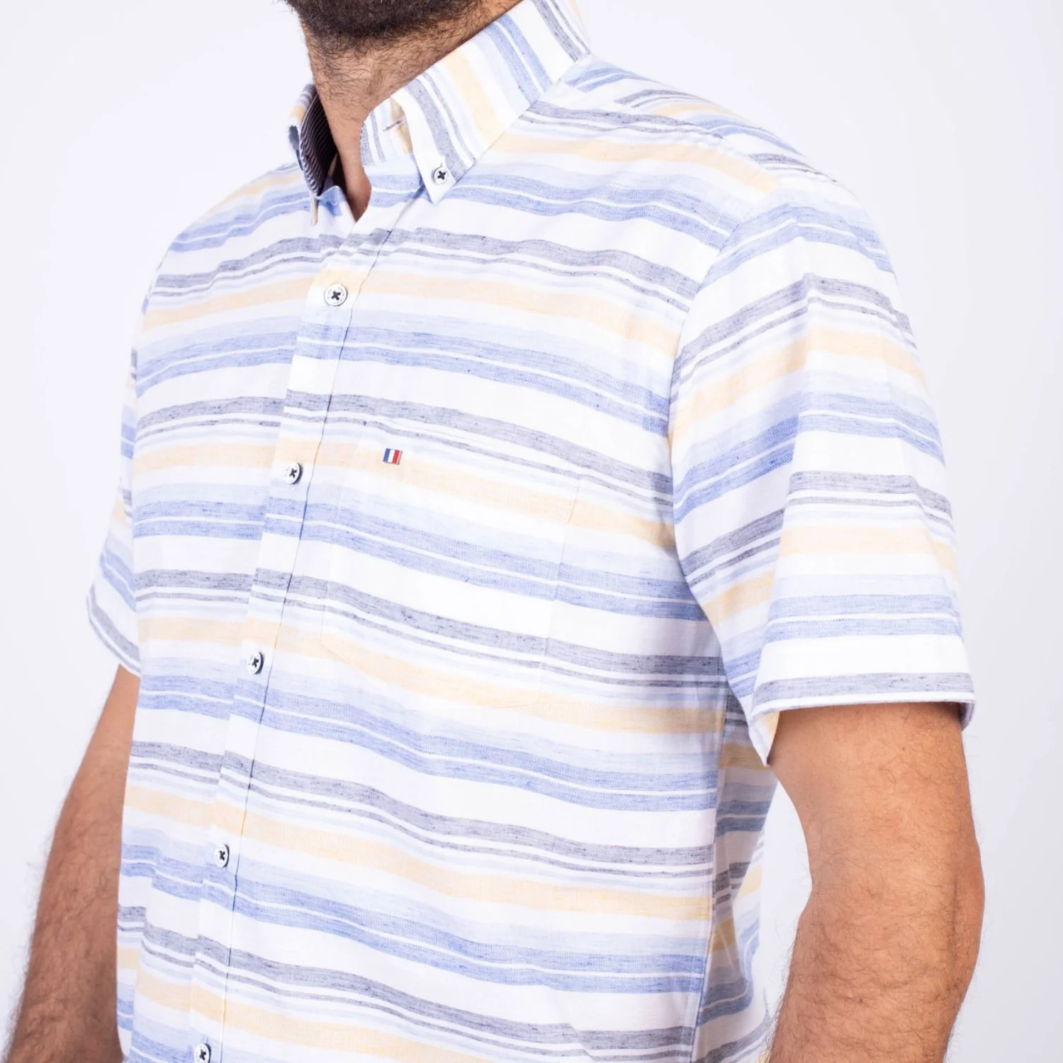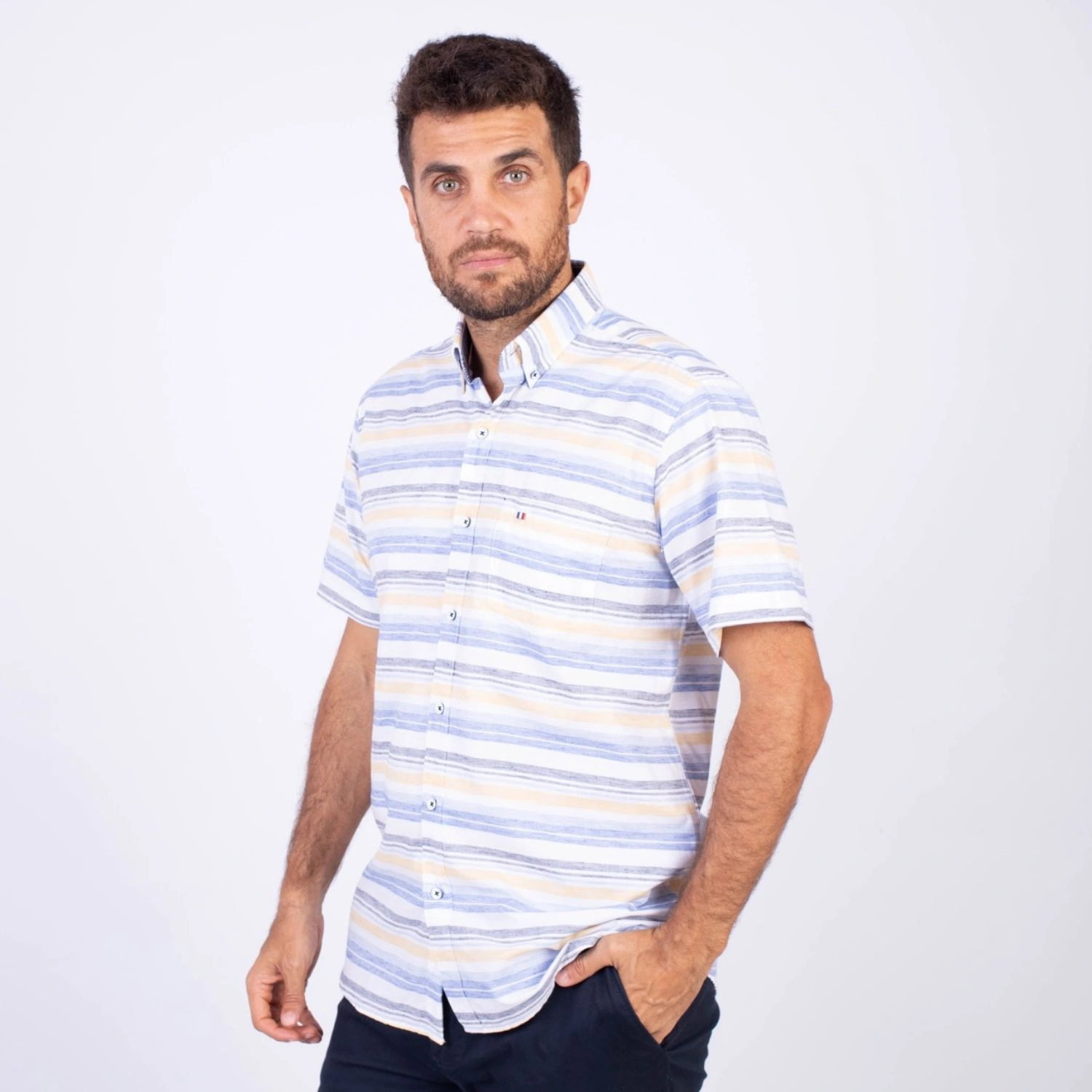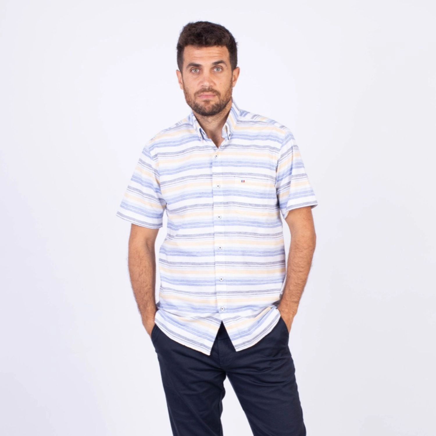 Camisa MC Etiqueta Azul con diseño Francés.| Composición 100% Algodón.| Tela con diseño de rayas horizontales.| Botones personalizados en contraste.| Aplicación de bandera francesa metalica en el bolsillo.| Cuello Buttondown| Aplicación de tela en contraste al interior del cuello.| Aplicación de hilo y tipping Azul Marino en contraste al interior del cuello y botones.