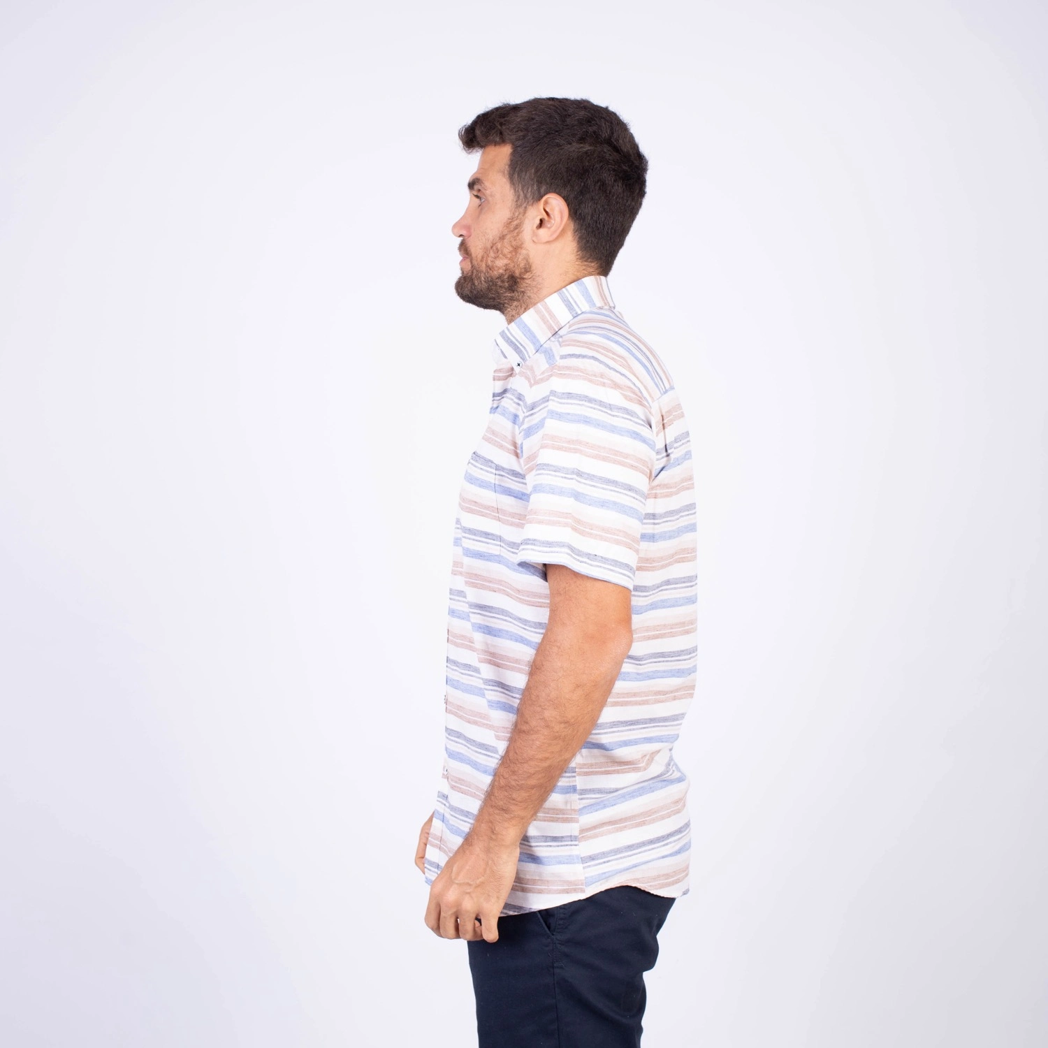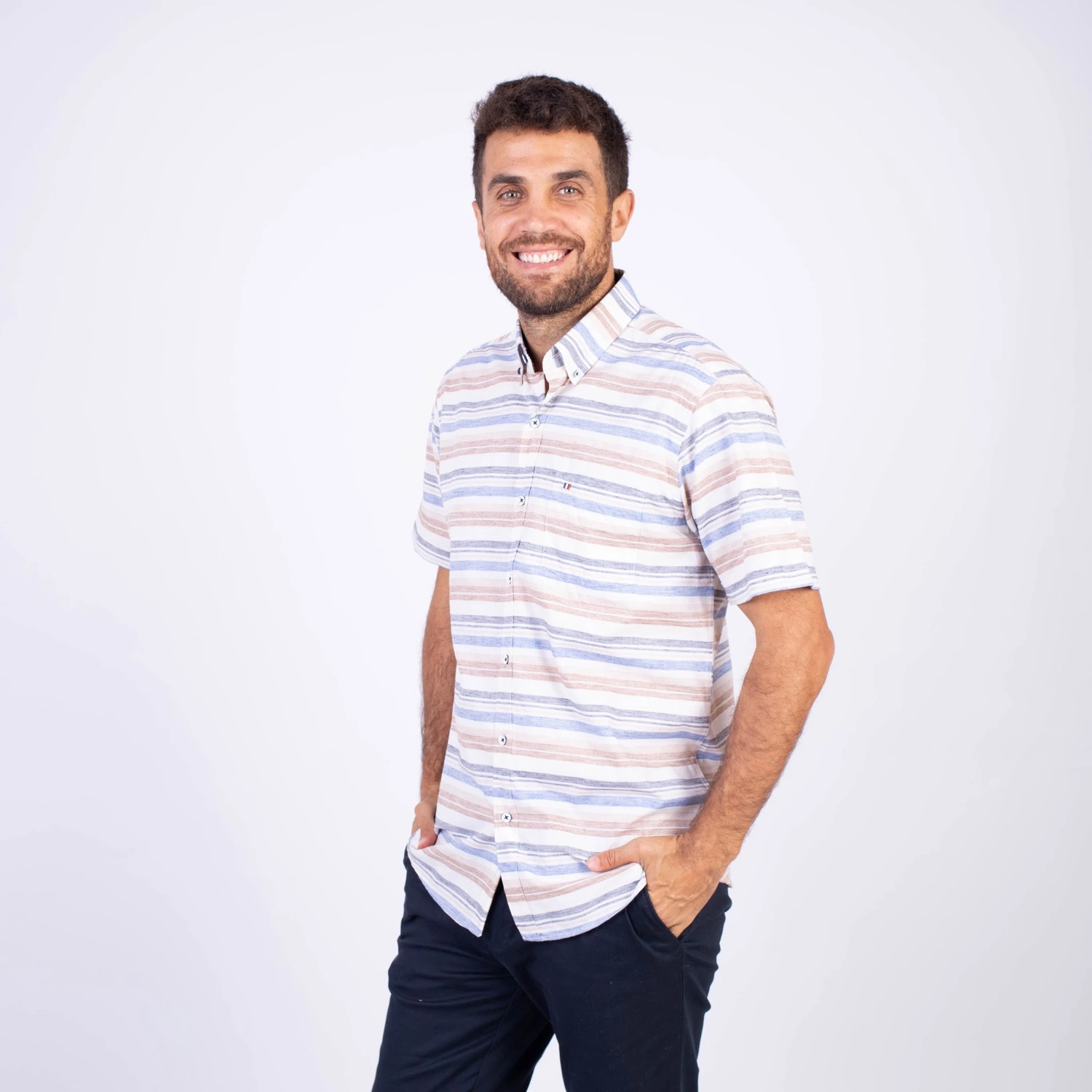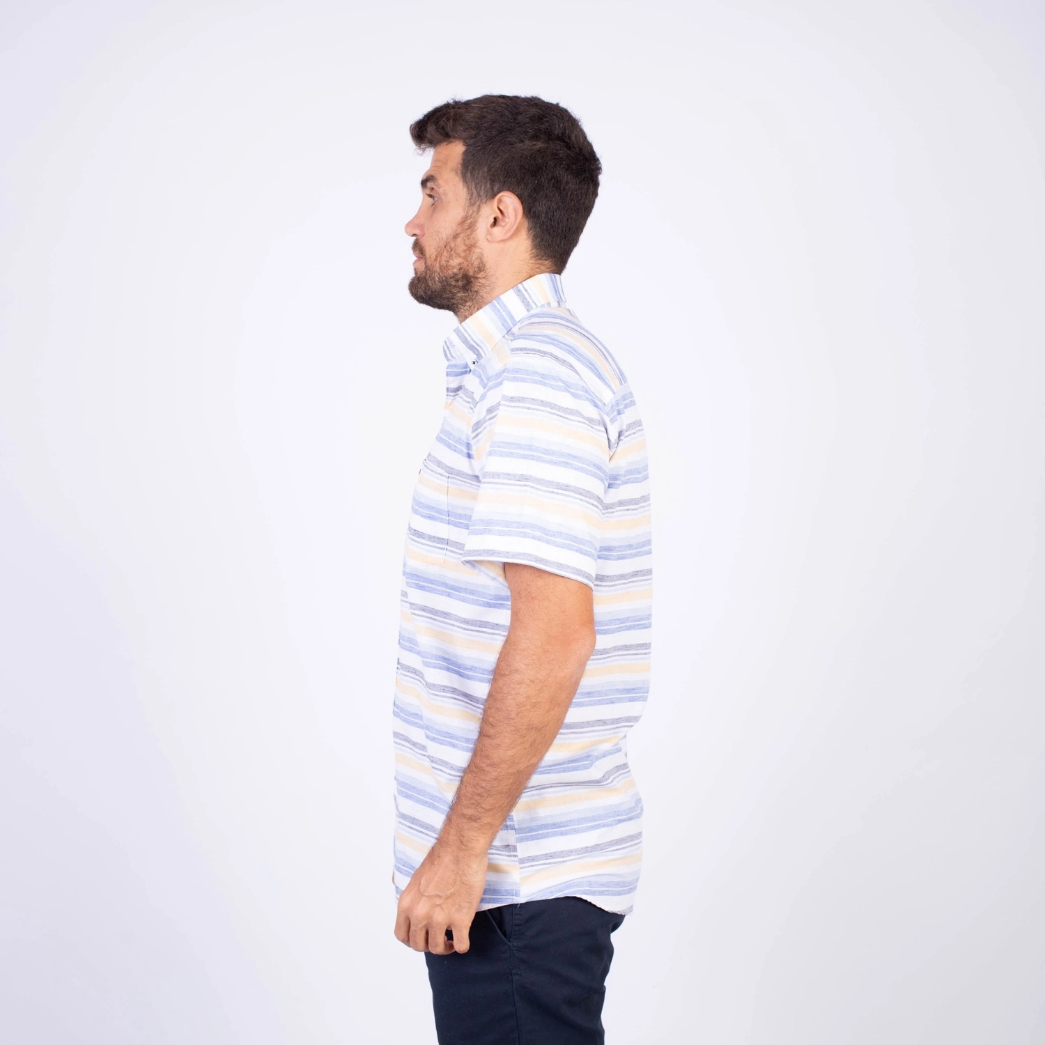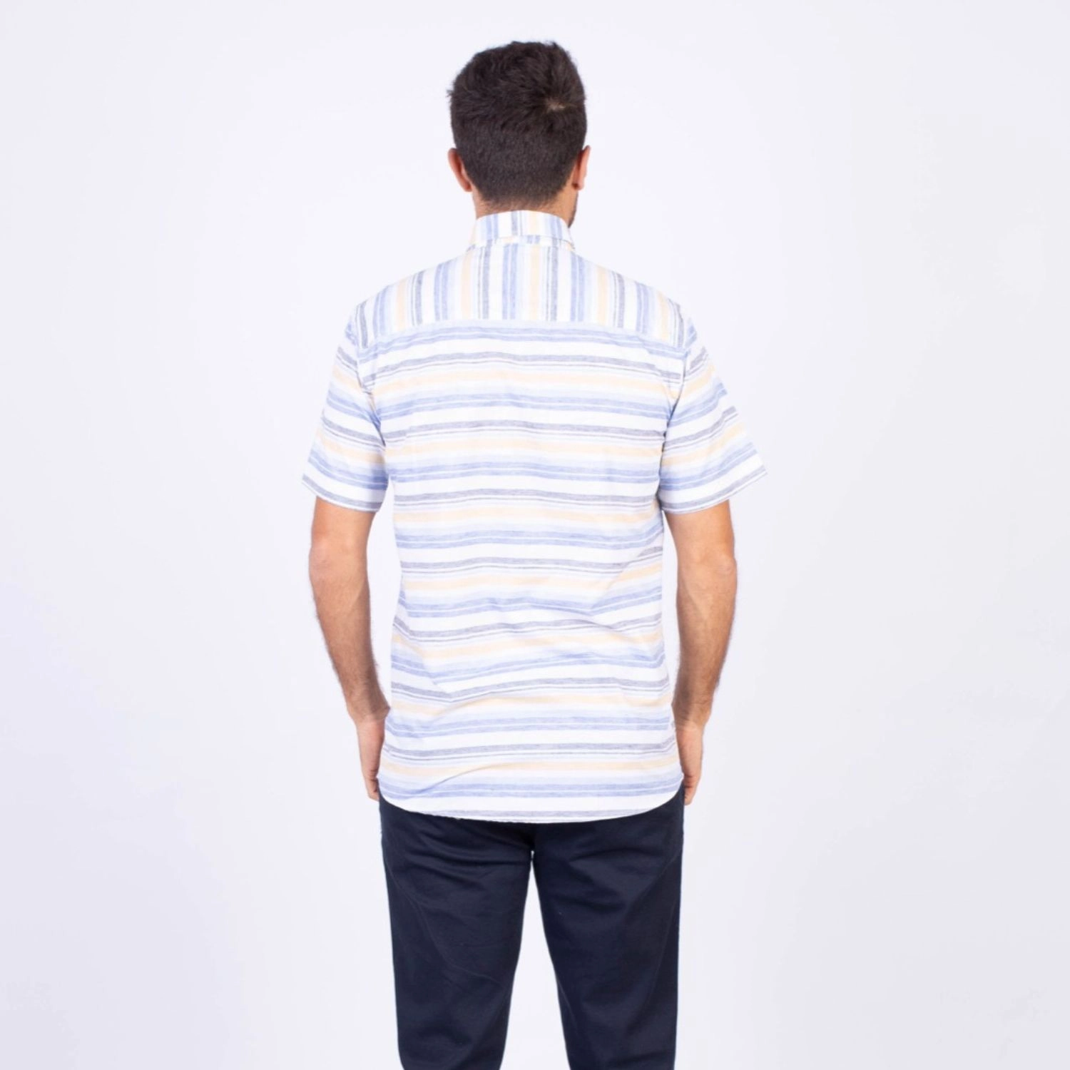 Camisa MC Etiqueta Azul con diseño Francés.| Composición 100% Algodón.| Tela con diseño de rayas horizontales.| Botones personalizados en contraste.| Aplicación de bandera francesa metalica en el bolsillo.| Cuello Buttondown| Aplicación de tela en contraste al interior del cuello.| Aplicación de hilo y tipping Azul Marino en contraste al interior del cuello y botones.