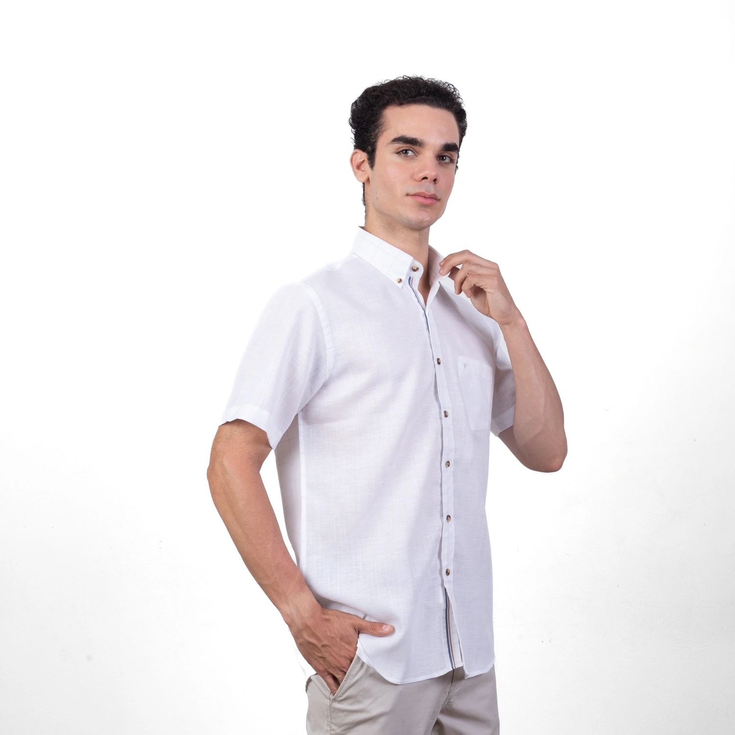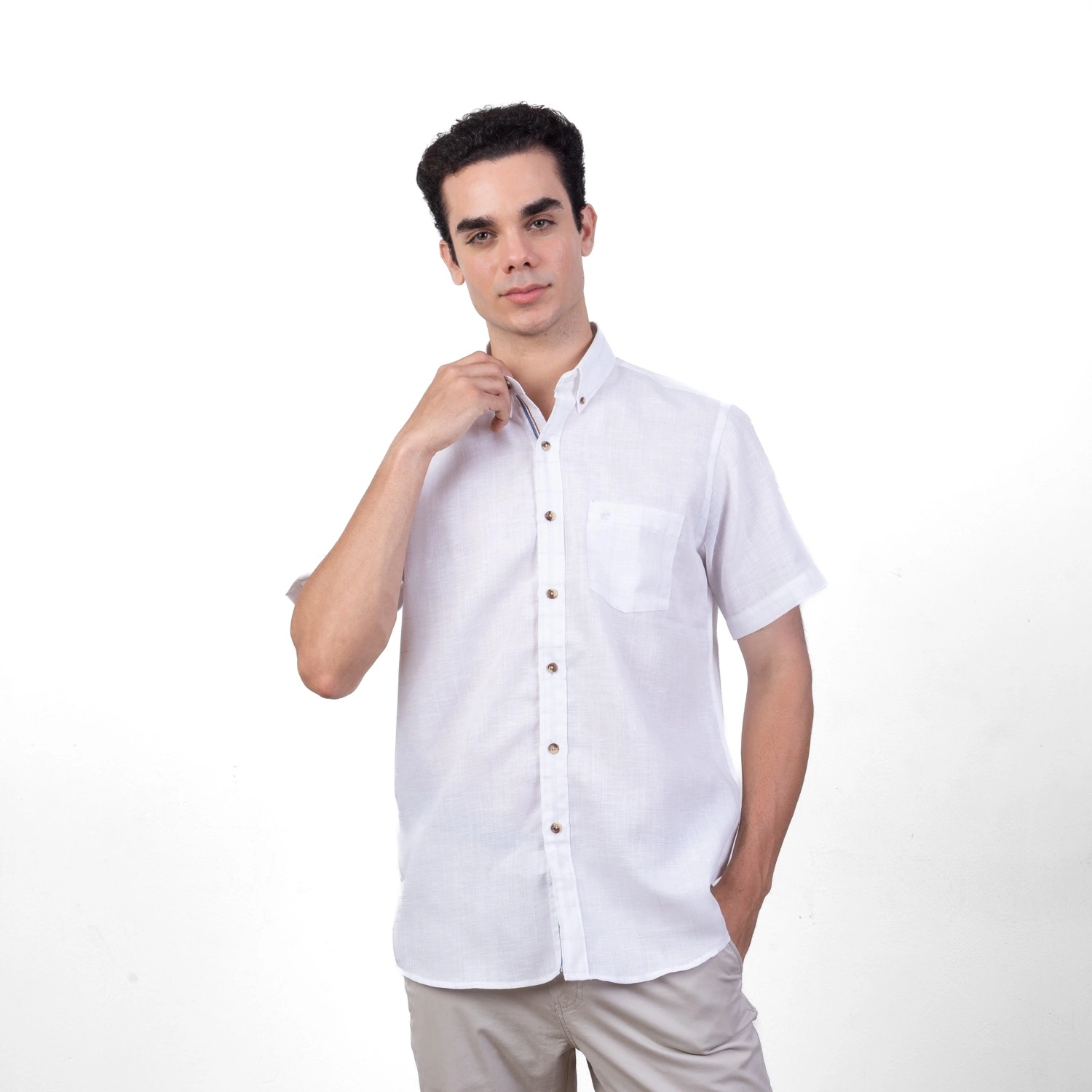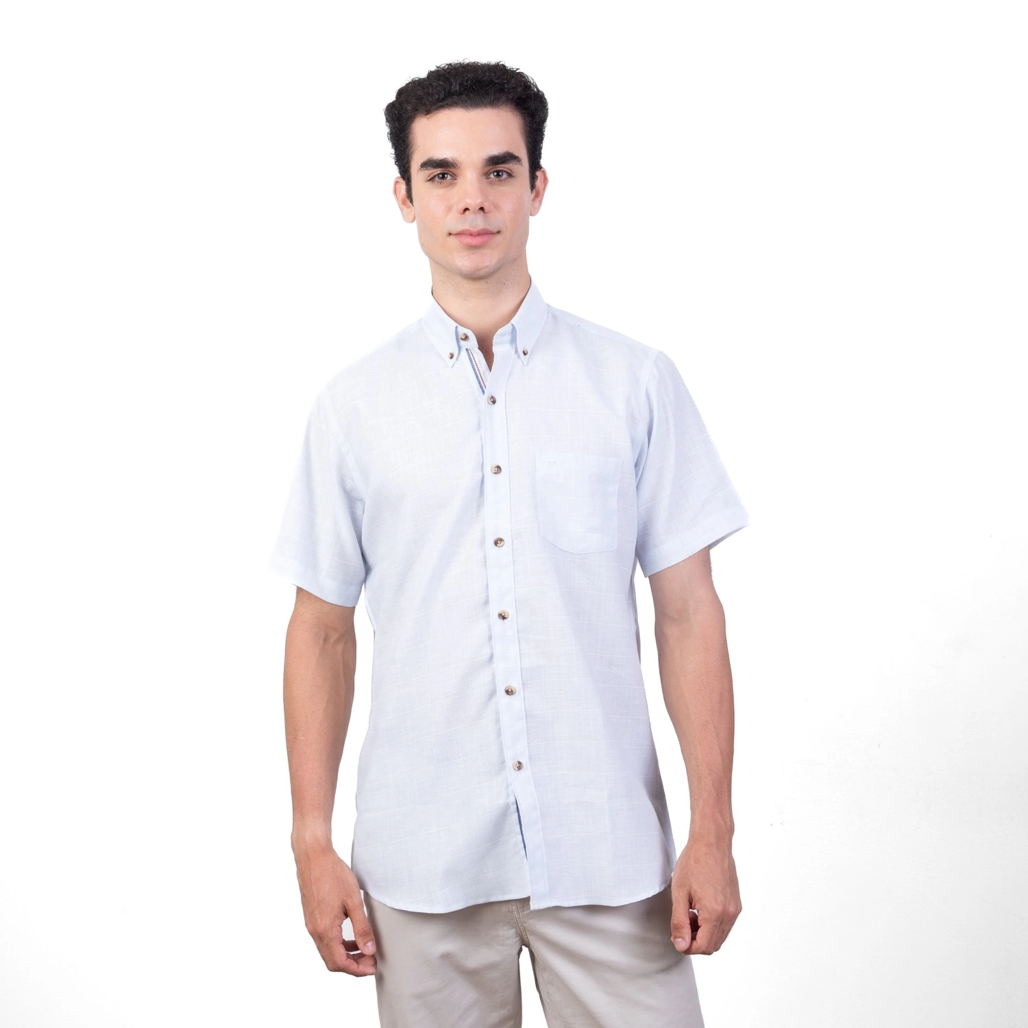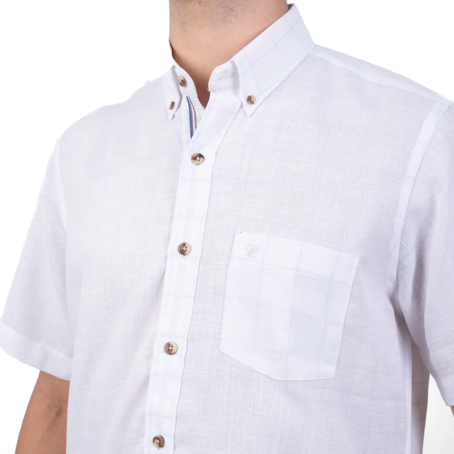 Camisa MC Etiqueta Linen Collection con diseño Francés. | Composición 40% Lino, 40% Algodón, y 20% Poliester. |Aplicación de Logo ¨P¨ bordado al tono en el bolsillo frontal.| Tela con diseño a cuadros. |Cuello Buttondown. |Botones carei en contraste.| Etiqueta cocida en la media luna.| Aplicación de cinta en contraste al interior de la pechera.