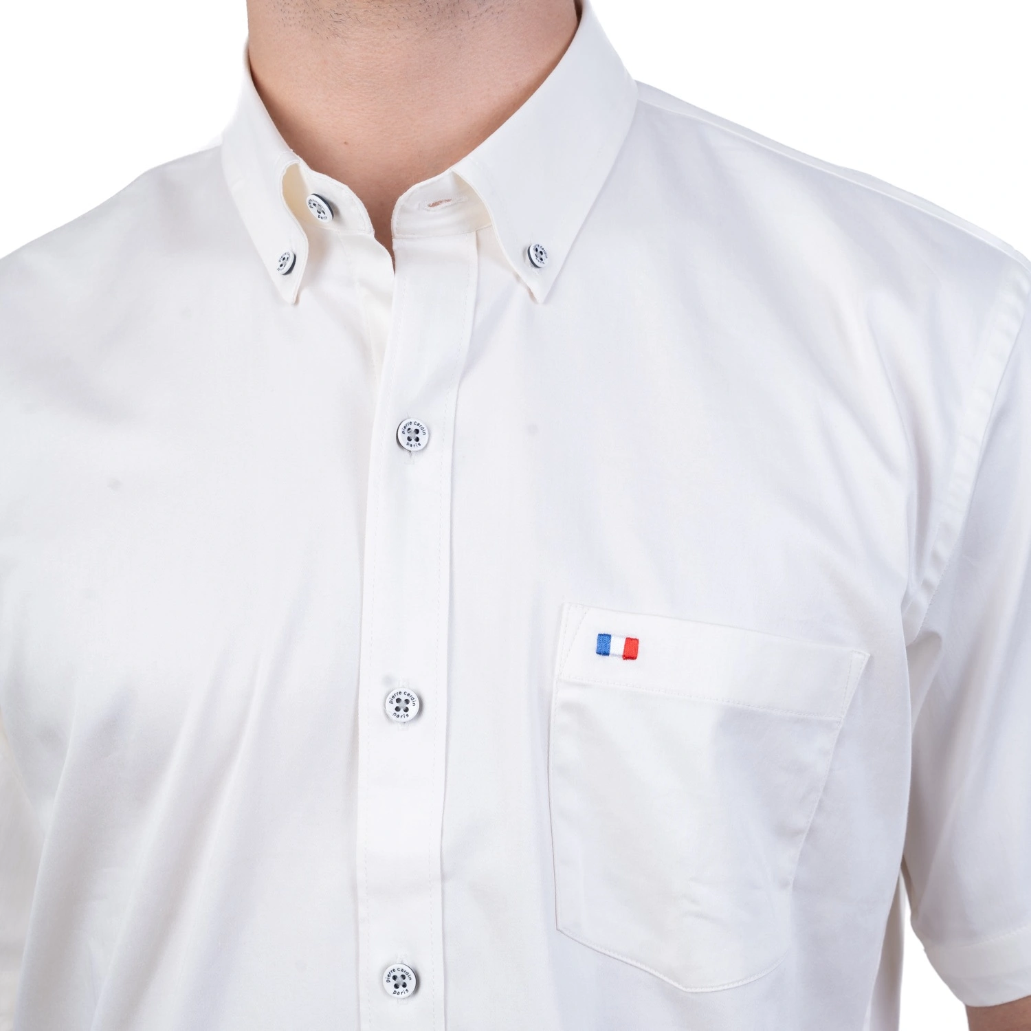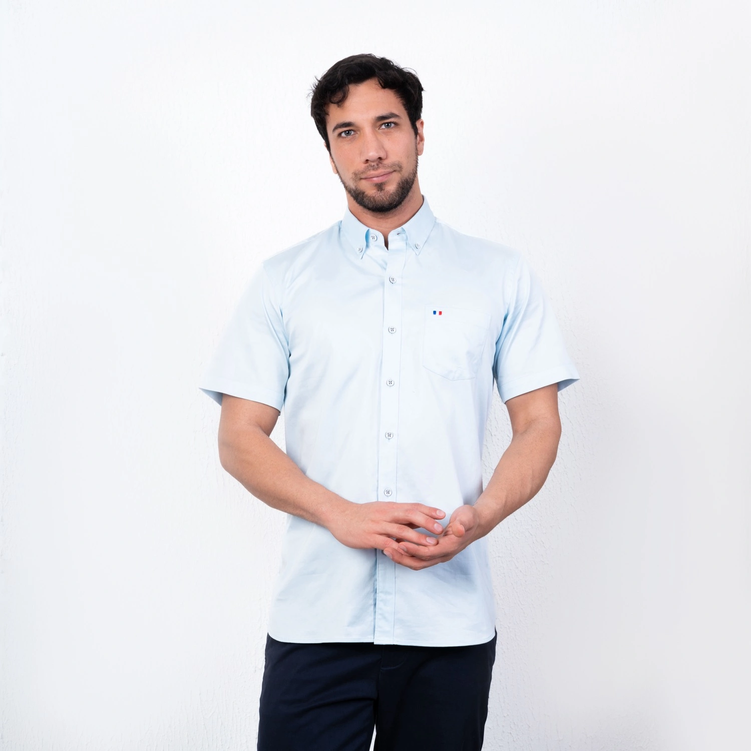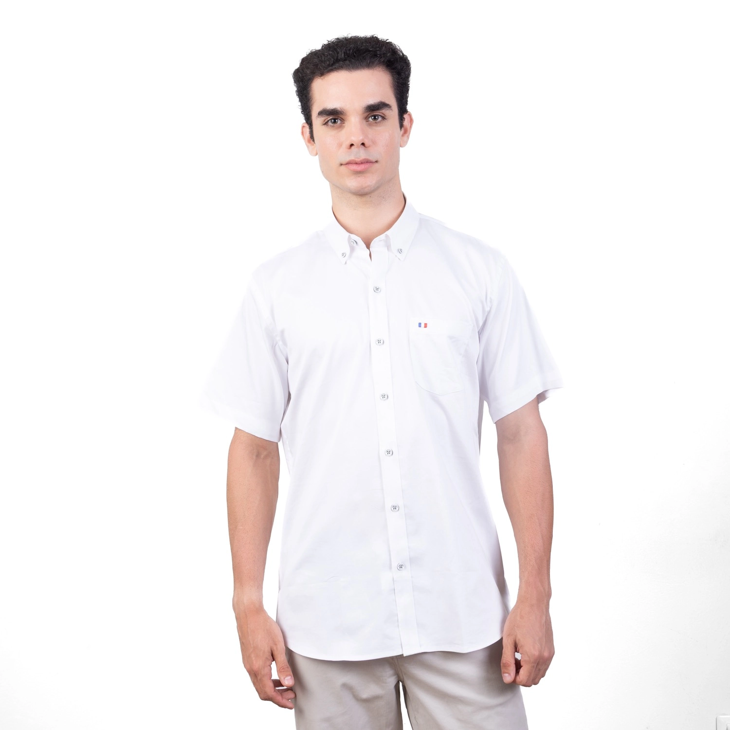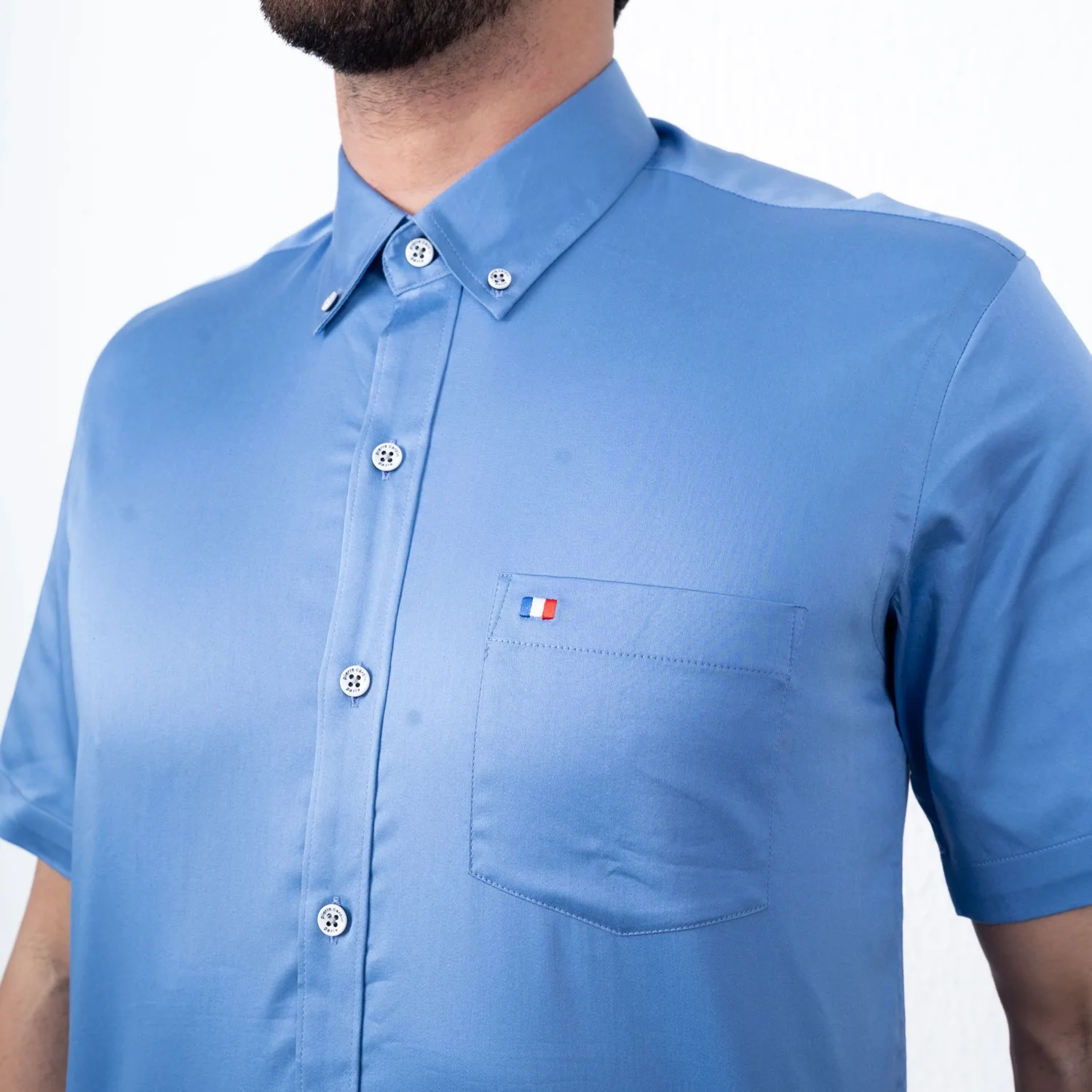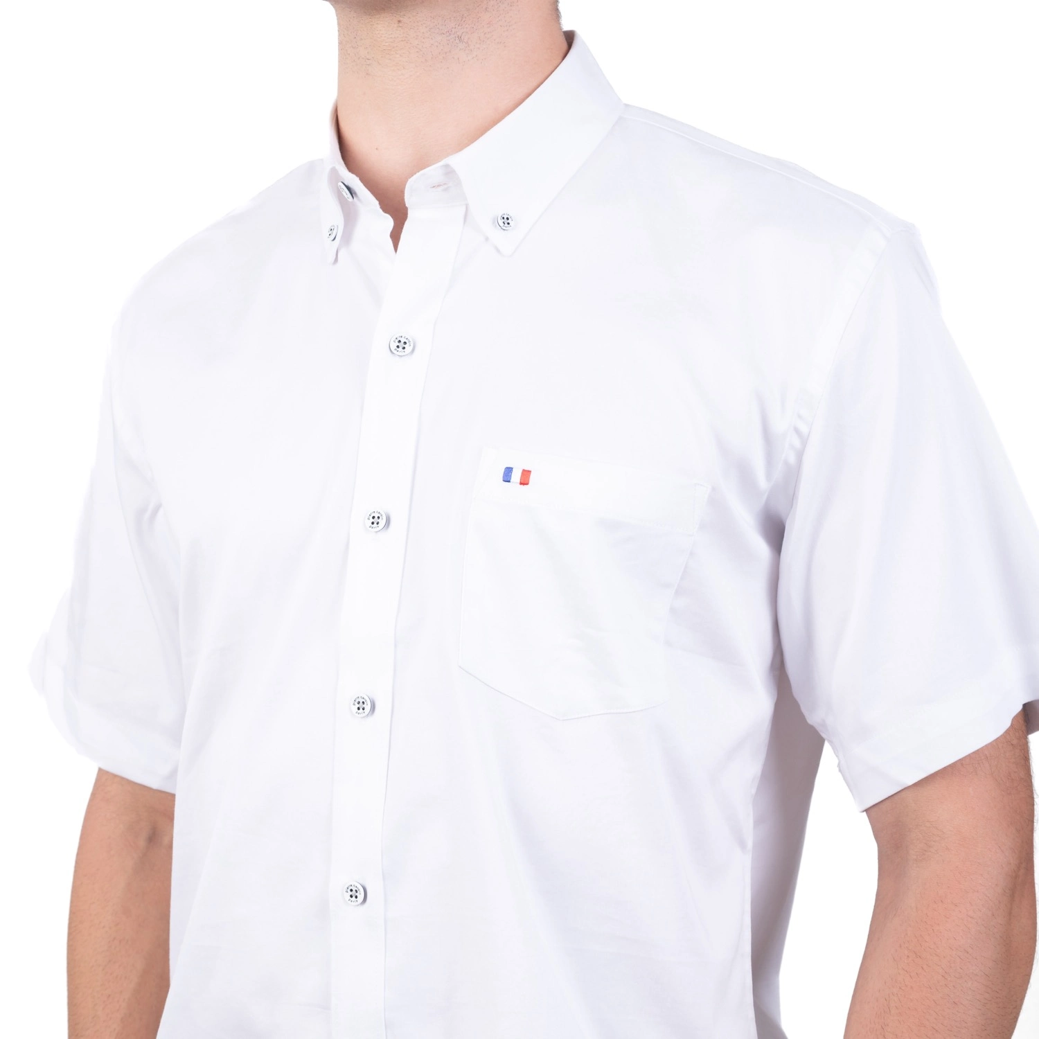 Camisa MC Popelina Stretch Etiqueta Azul con diseño Francés.| Composición 65% Algodón, 32% Poliester, y 3% Elastano.| Tela con diseño color entero.| Botones personalizados en contraste.| Aplicación de bandera francesa bordada en el bolsillo.| Cuello Buttondown| Aplicación de tela mil rayas en contraste al interior de la media luna.| Tela Popelina Stretch Color Entero.| Aplicación de cinta Tipping en contraste en el interior del cuello. |Aplicación de hilo en contraste en los botones.