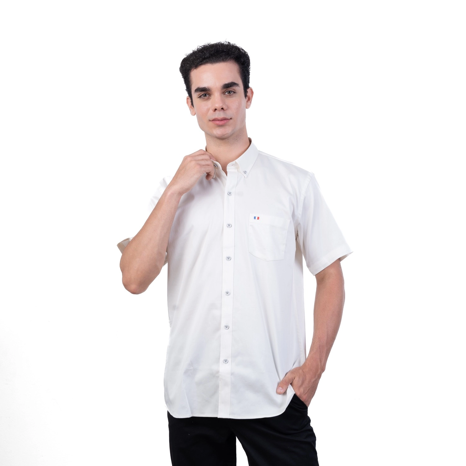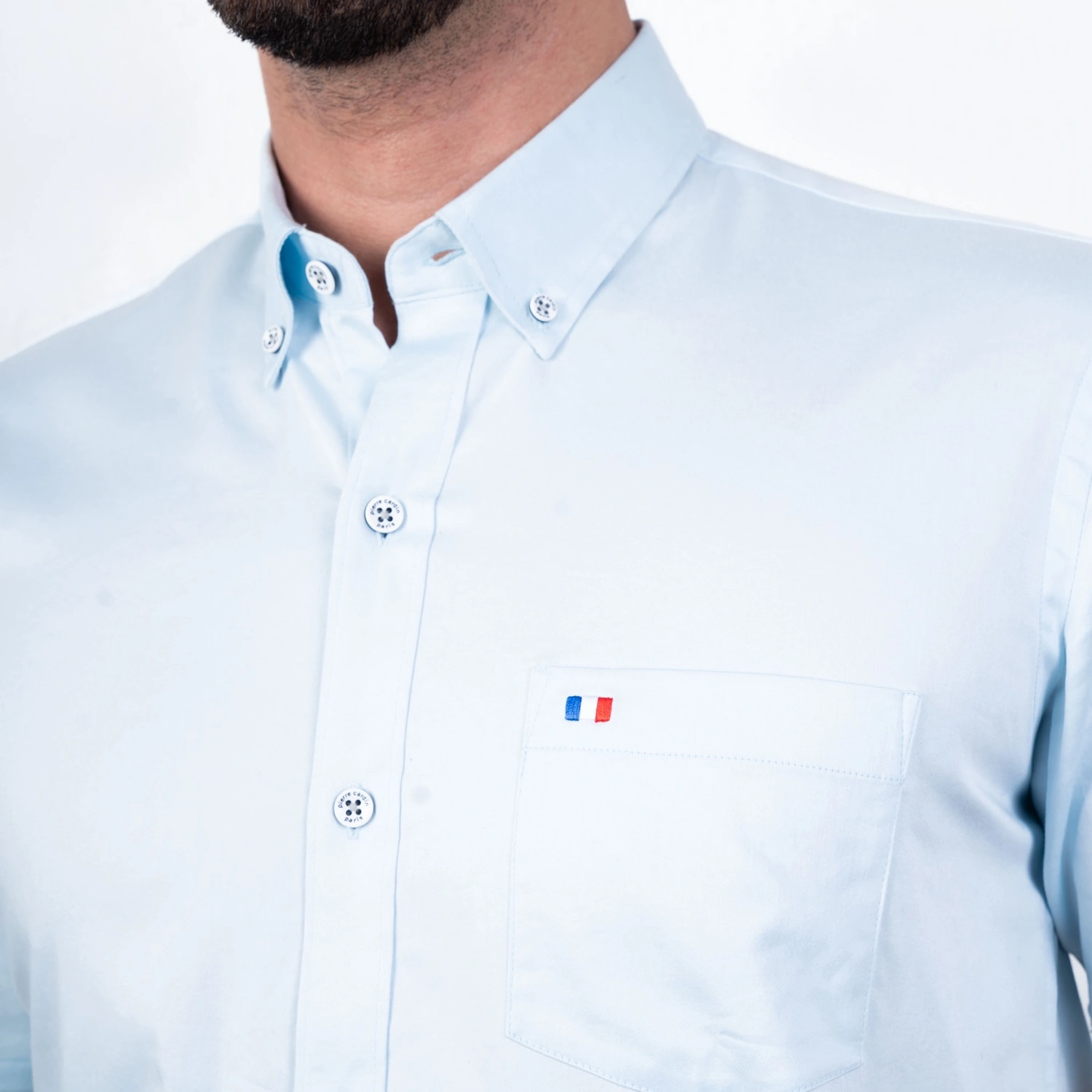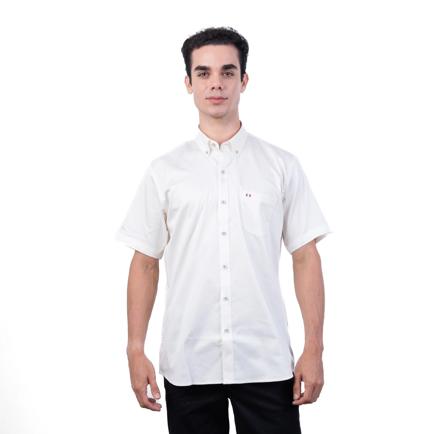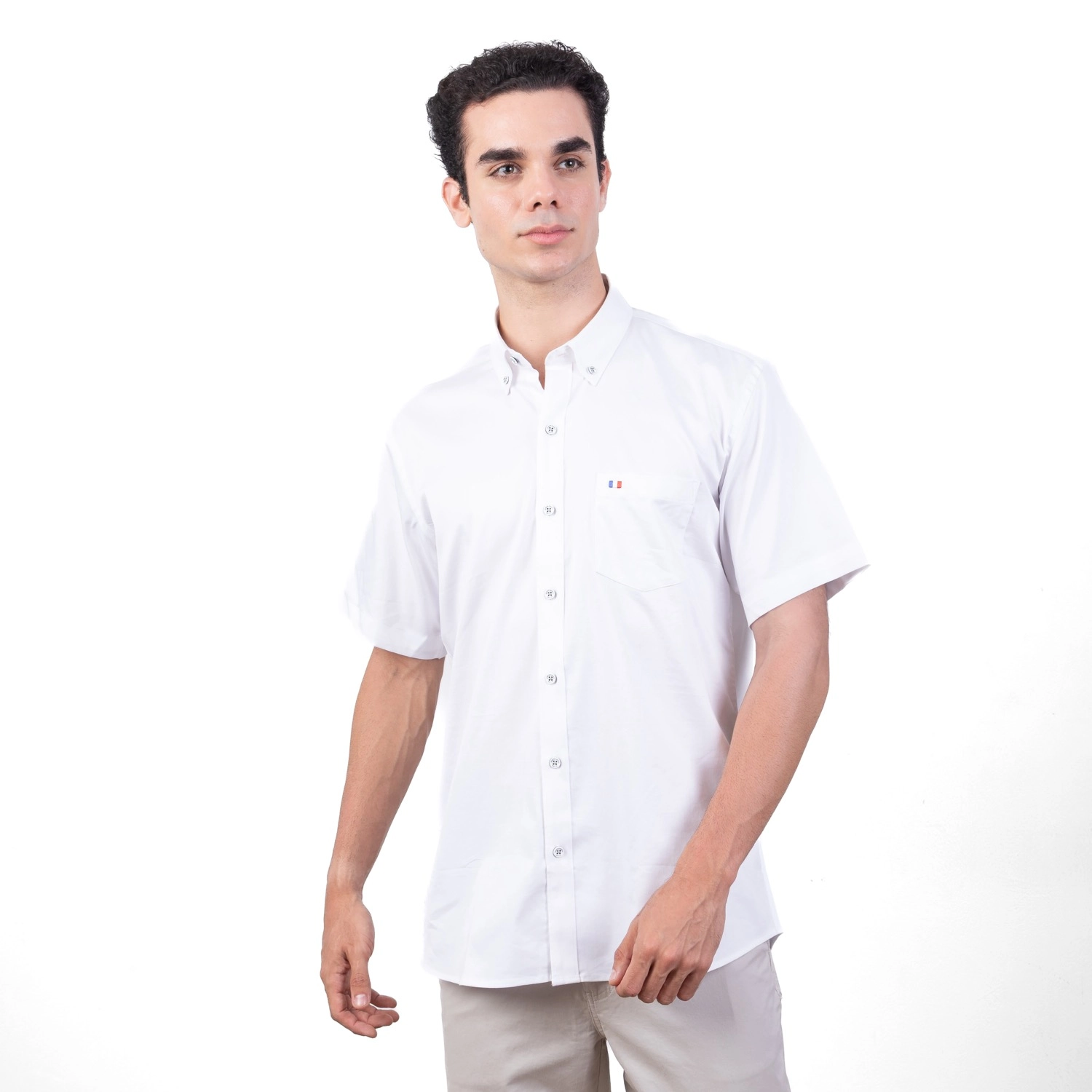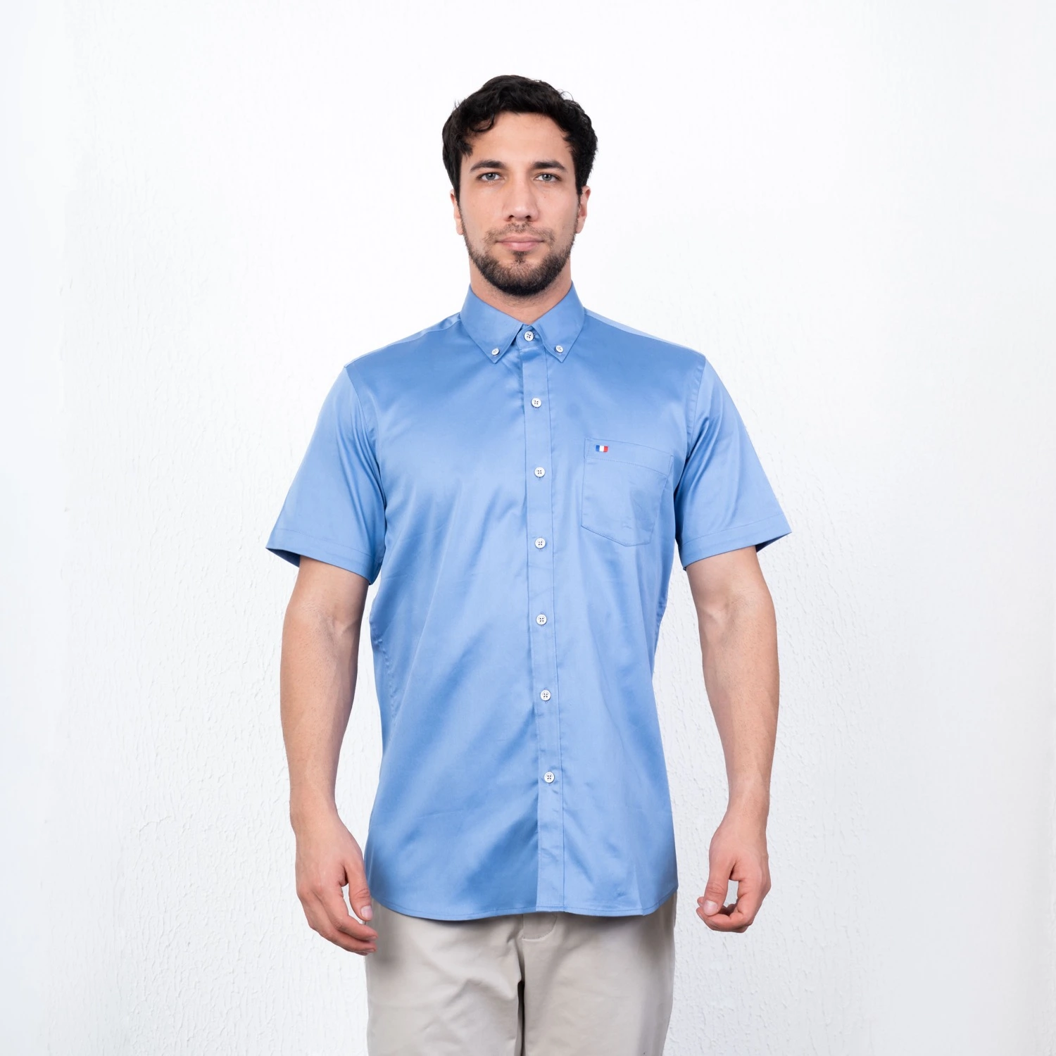Camisa MC Popelina Stretch Etiqueta Azul con diseño Francés.| Composición 65% Algodón, 32% Poliester, y 3% Elastano.| Tela con diseño color entero.| Botones personalizados en contraste.| Aplicación de bandera francesa bordada en el bolsillo.| Cuello Buttondown| Aplicación de tela mil rayas en contraste al interior de la media luna.| Tela Popelina Stretch Color Entero.| Aplicación de cinta Tipping en contraste en el interior del cuello. |Aplicación de hilo en contraste en los botones.
