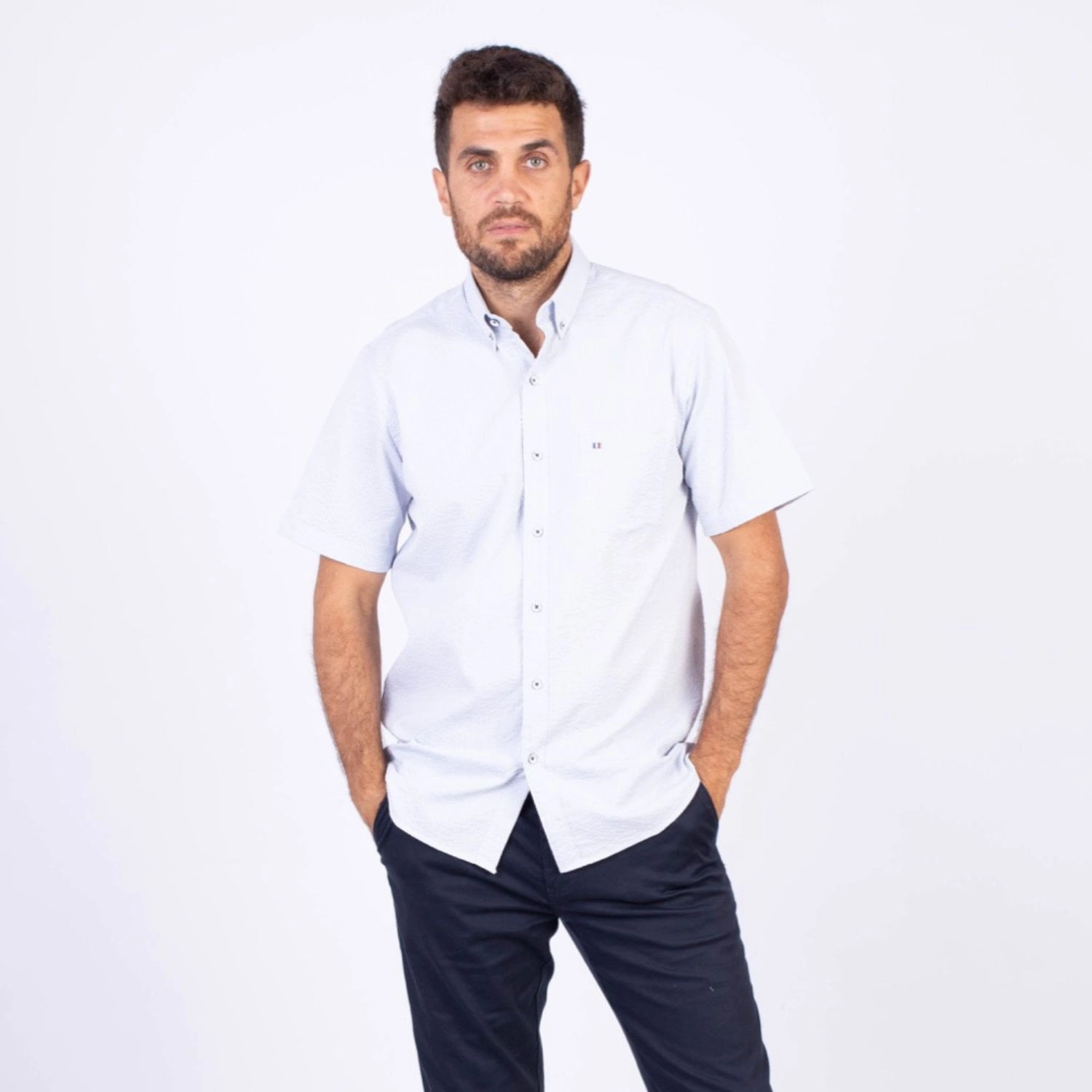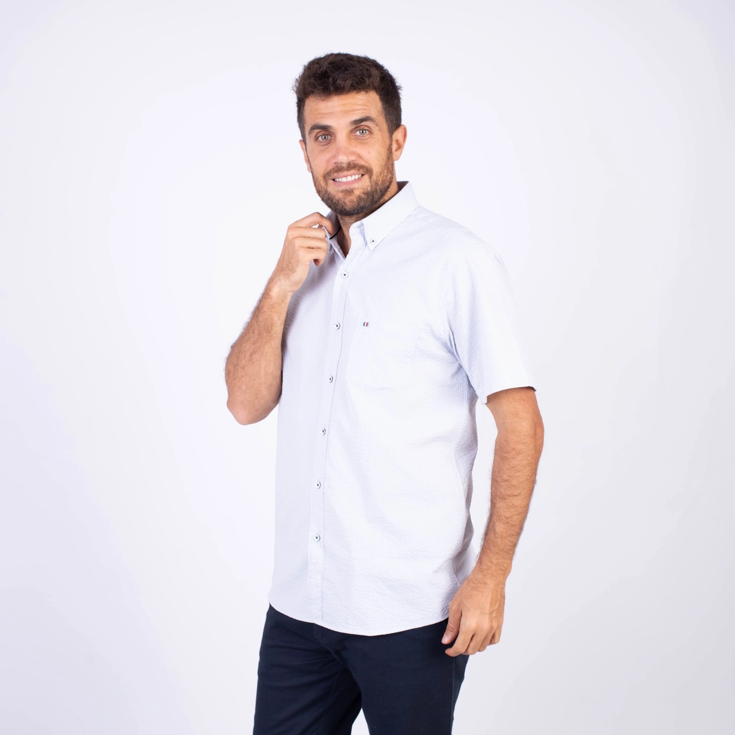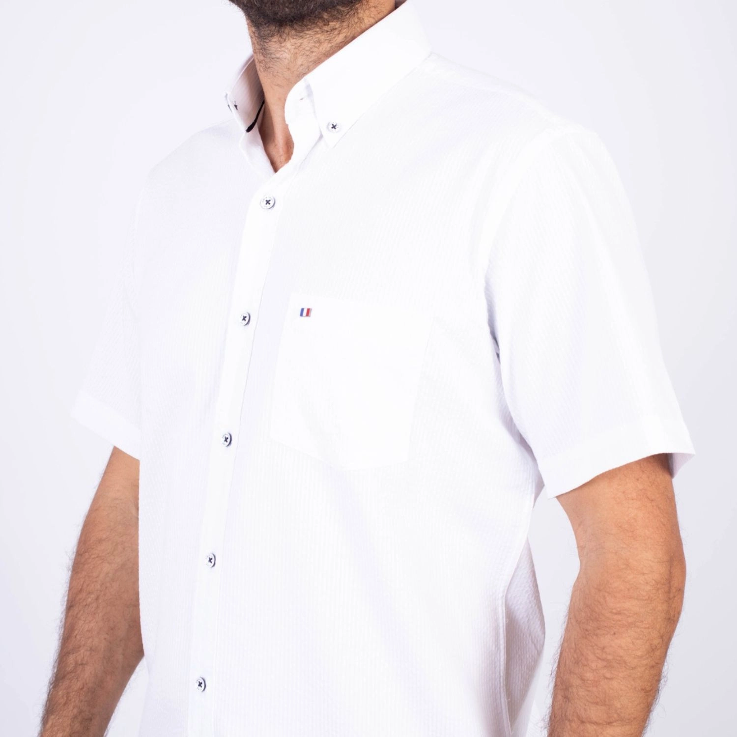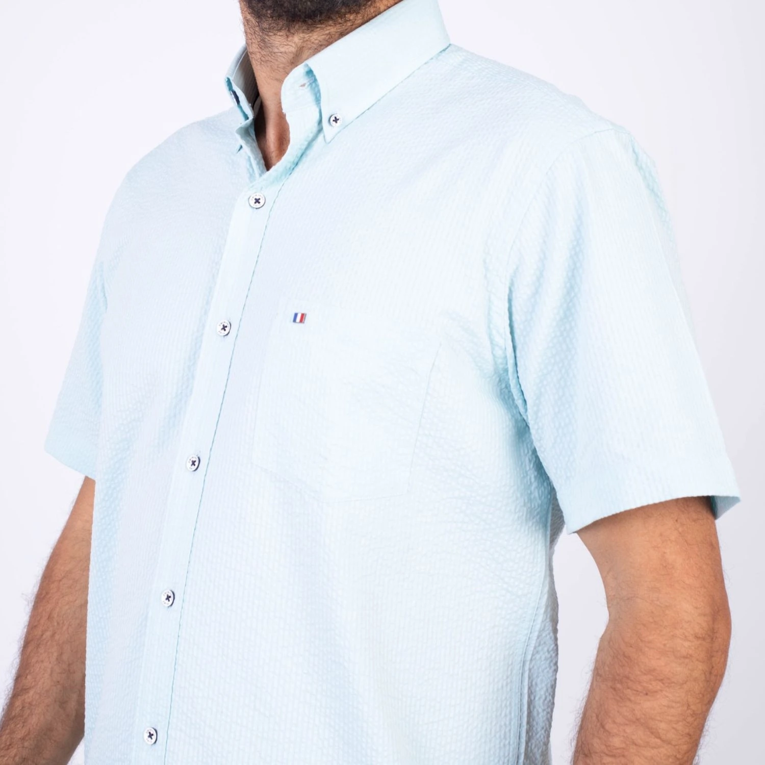 Camisa MC Seersucker Etiqueta Azul con diseño Francés.| Composición 100% Algodón.| Tela con diseño de rayas verticales.| Botones personalizados en contraste.| Aplicación de bandera francesa metalica en el bolsillo.| Cuello Buttondown| Aplicación de tela en contraste al interior de la media luna.| Aplicación de hilo y tipping Azul Marino en contraste al interior del cuello y botones.| Aplicación de bandera francesa bordada en el interior del cuello.