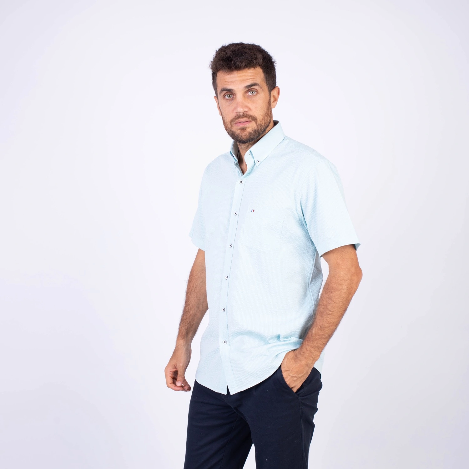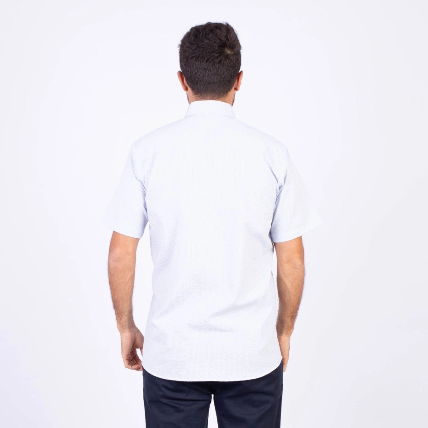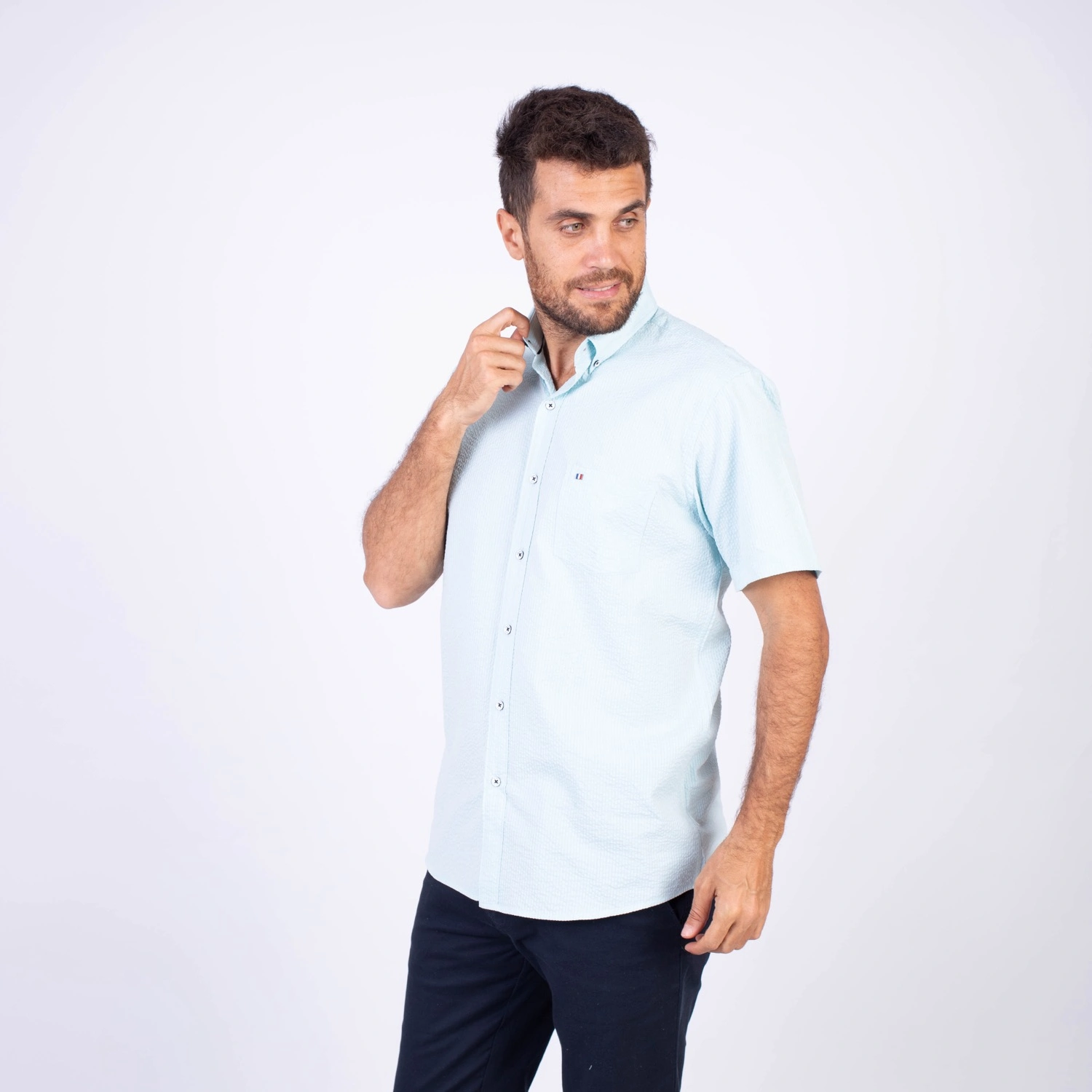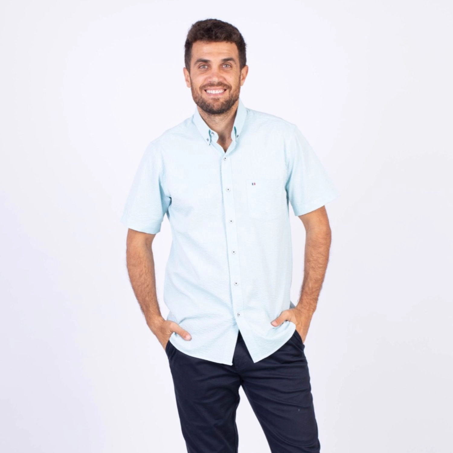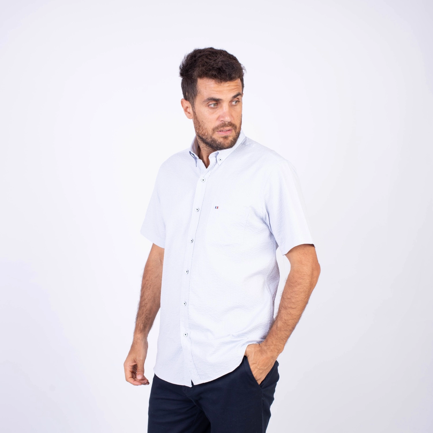 Camisa MC Seersucker Etiqueta Azul con diseño Francés.| Composición 100% Algodón.| Tela con diseño de rayas verticales.| Botones personalizados en contraste.| Aplicación de bandera francesa metalica en el bolsillo.| Cuello Buttondown| Aplicación de tela en contraste al interior de la media luna.| Aplicación de hilo y tipping Azul Marino en contraste al interior del cuello y botones.| Aplicación de bandera francesa bordada en el interior del cuello.
