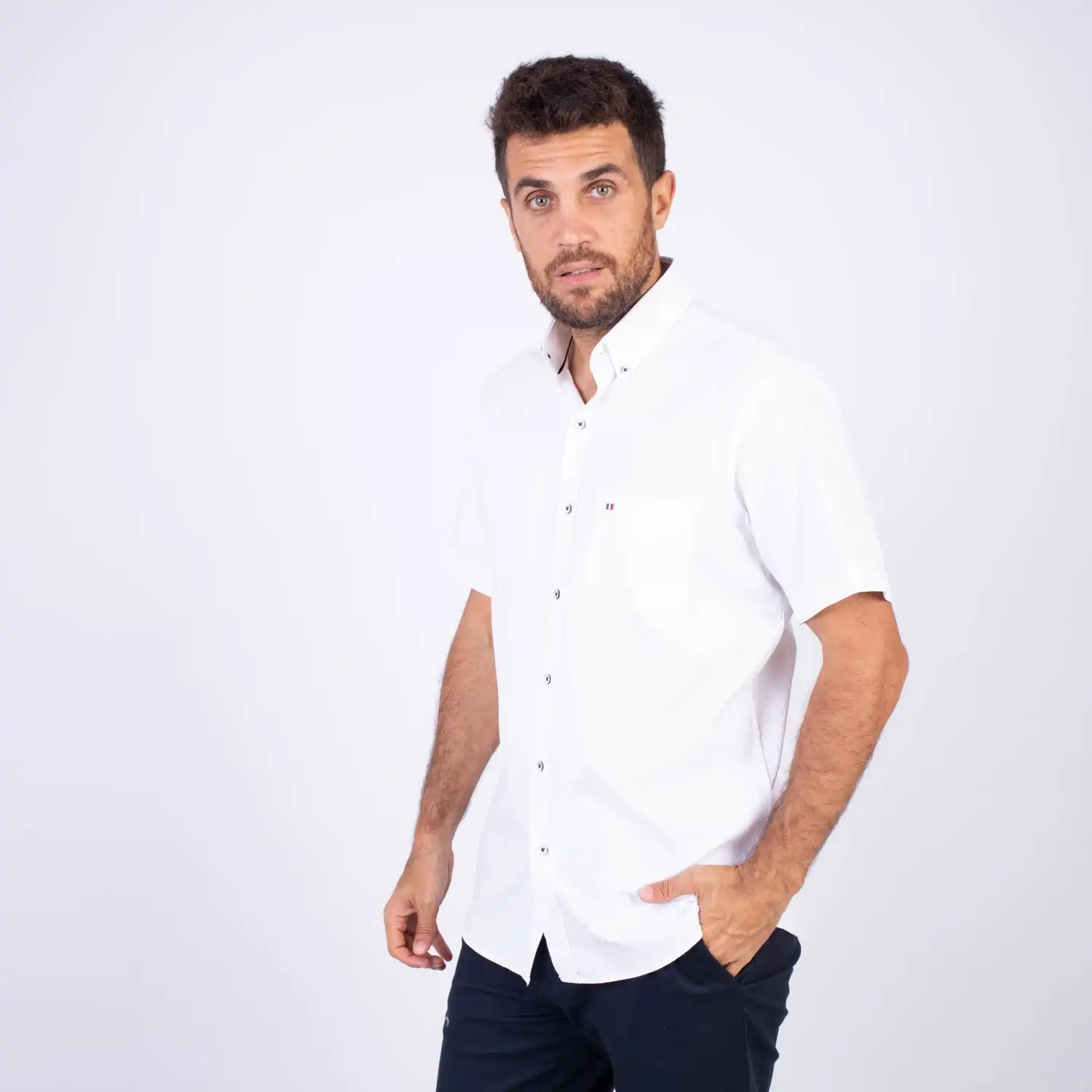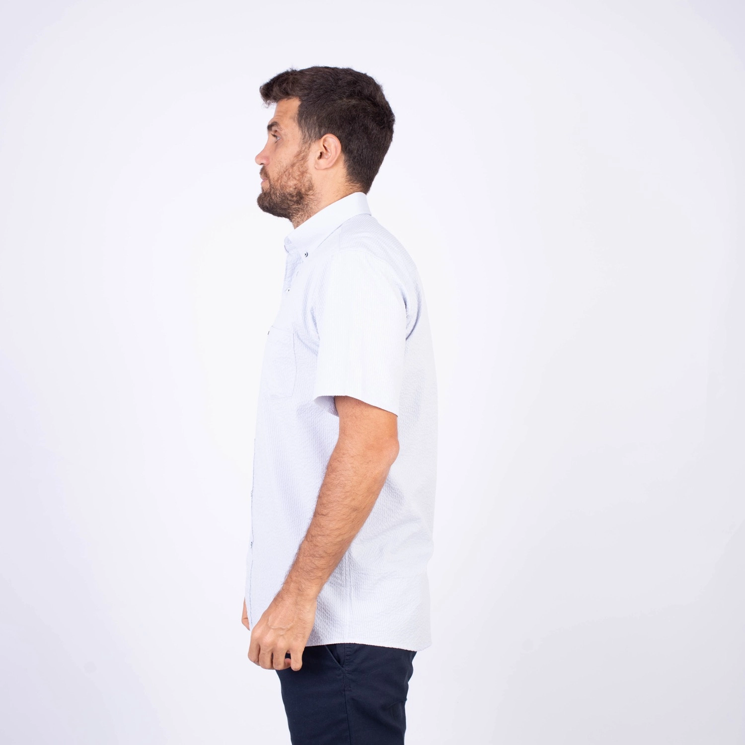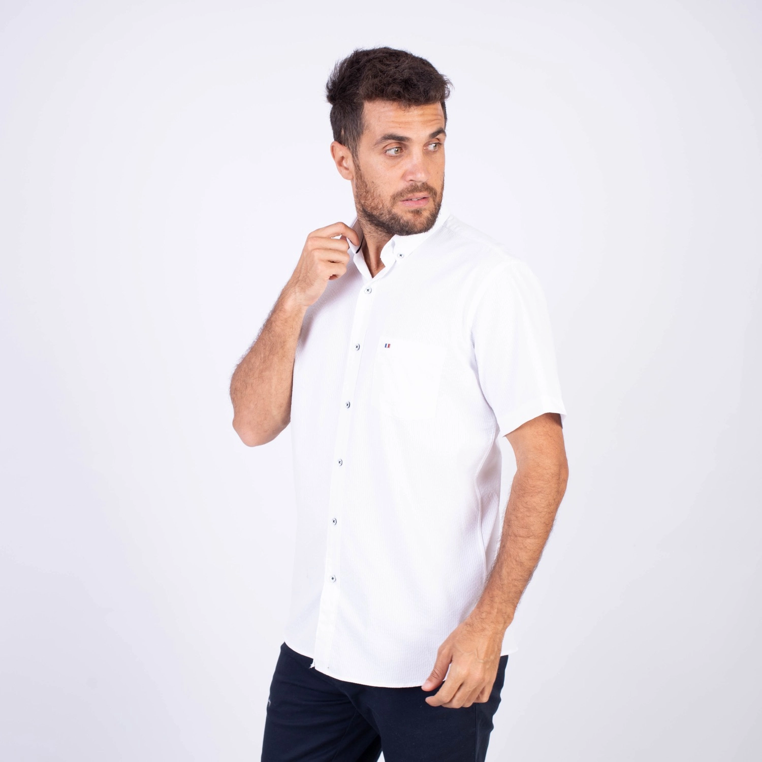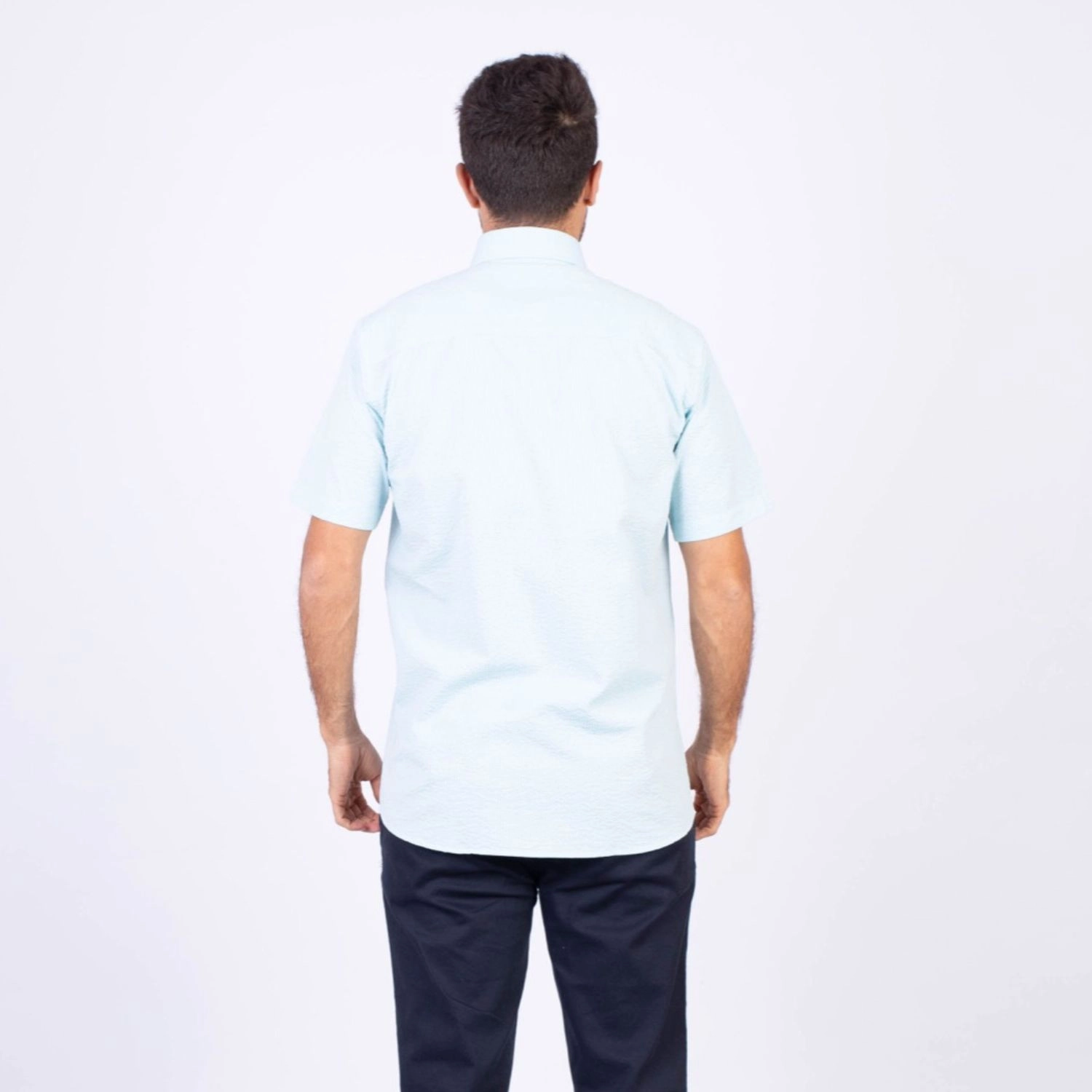 Camisa MC Seersucker Etiqueta Azul con diseño Francés.| Composición 100% Algodón.| Tela con diseño de rayas verticales.| Botones personalizados en contraste.| Aplicación de bandera francesa metalica en el bolsillo.| Cuello Buttondown| Aplicación de tela en contraste al interior de la media luna.| Aplicación de hilo y tipping Azul Marino en contraste al interior del cuello y botones.| Aplicación de bandera francesa bordada en el interior del cuello.