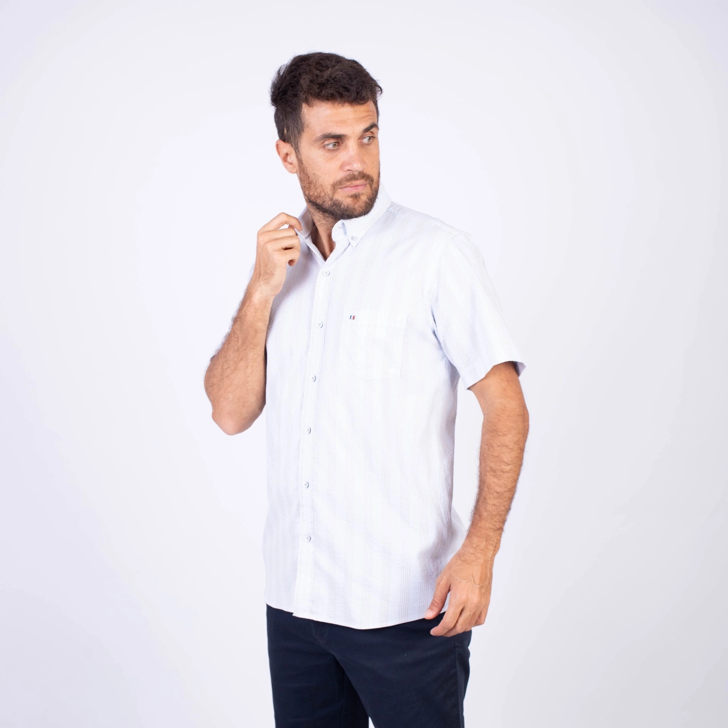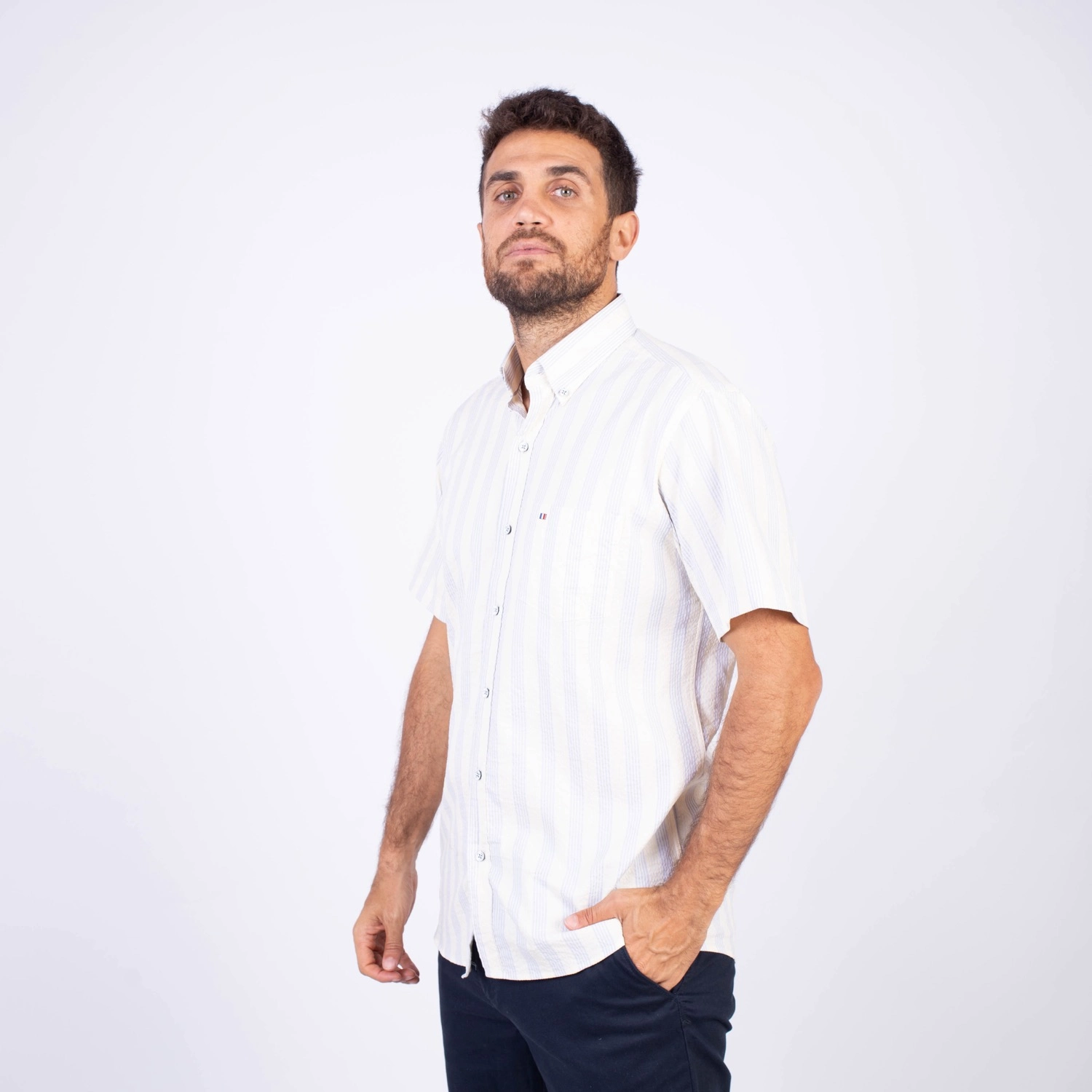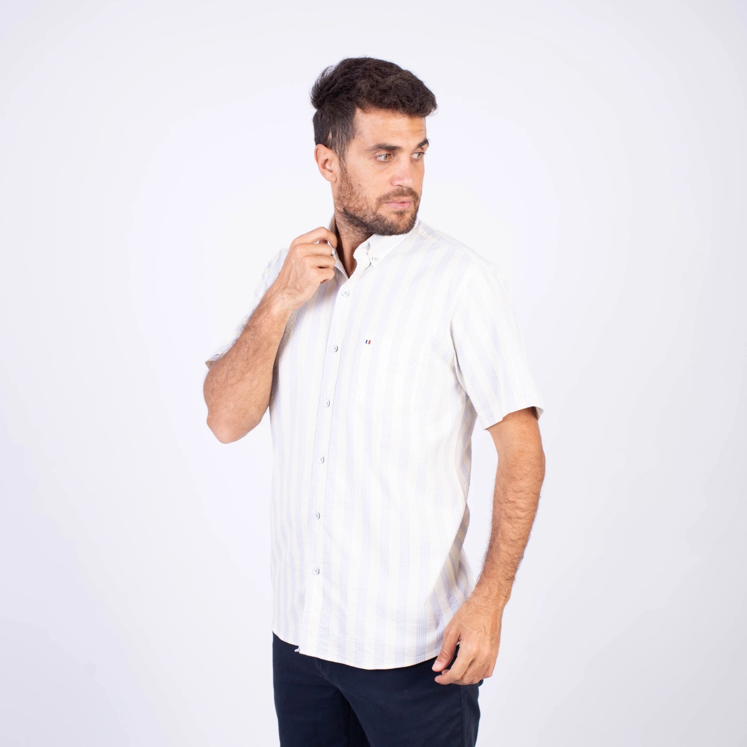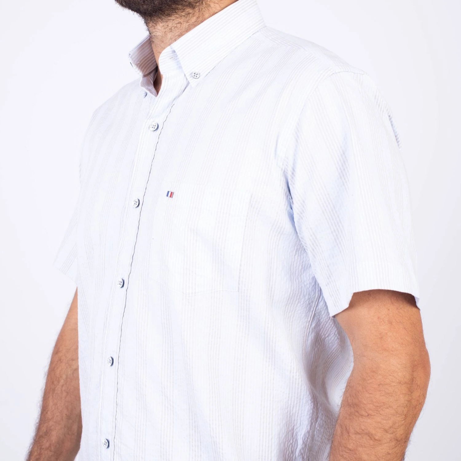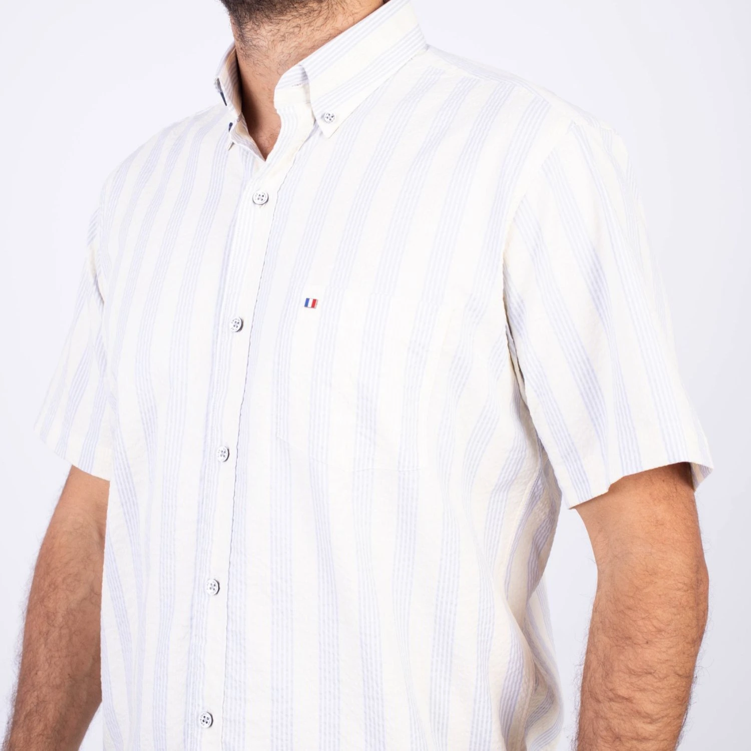 Camisa MC Seersucker Etiqueta Azul con diseño Francés.| Composición 100% Algodón.| Tela con diseño de rayas verticales.| Botones personalizados en contraste.| Aplicación de bandera francesa metalica en el bolsillo.| Cuello Buttondown| Aplicación de tela en contraste al interior de la media luna.| Aplicación de hilo y tipping Gris en contraste al interior del cuello y botones.