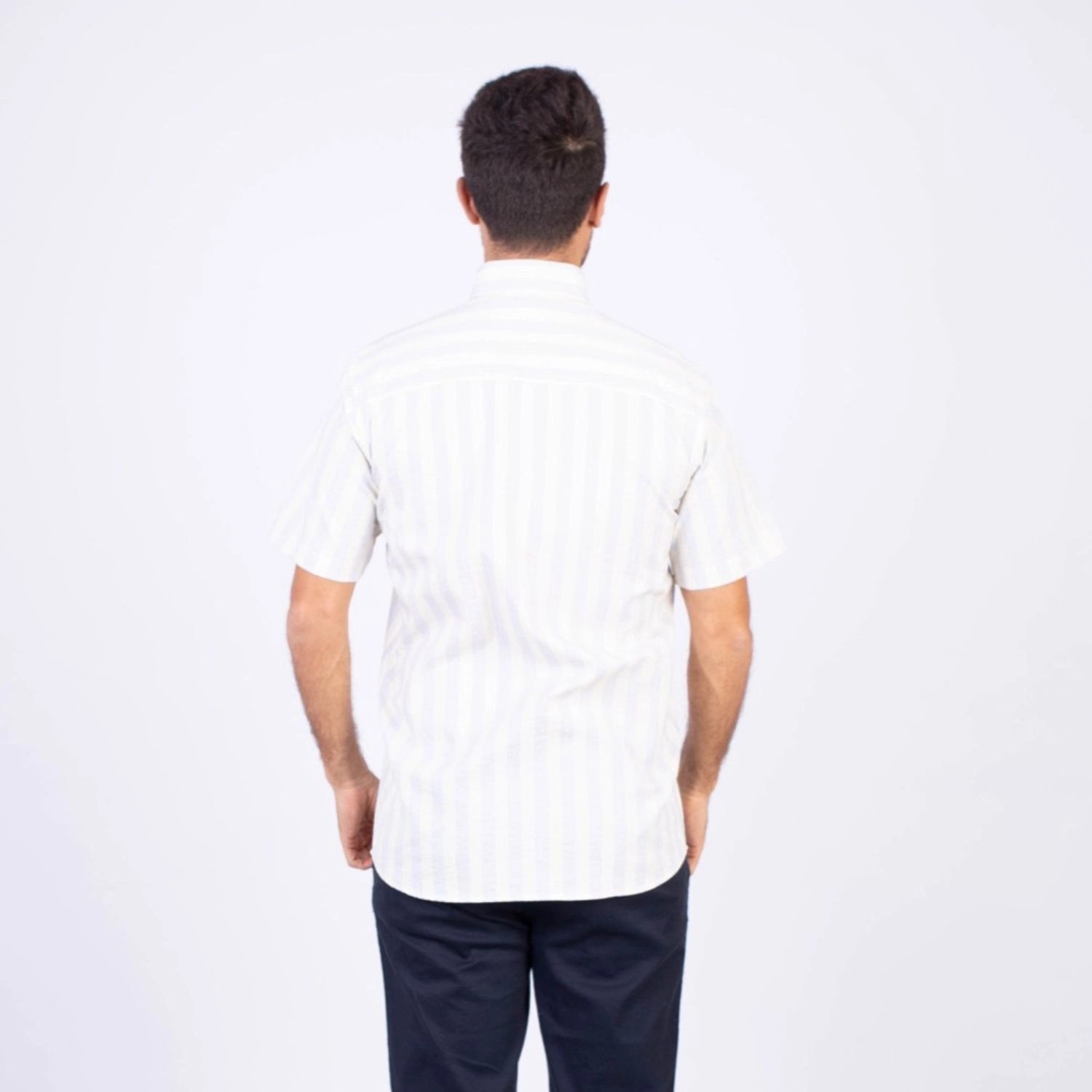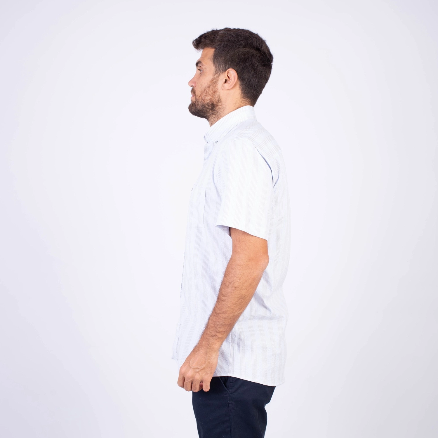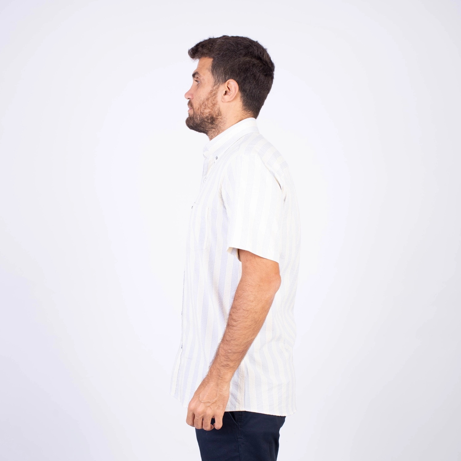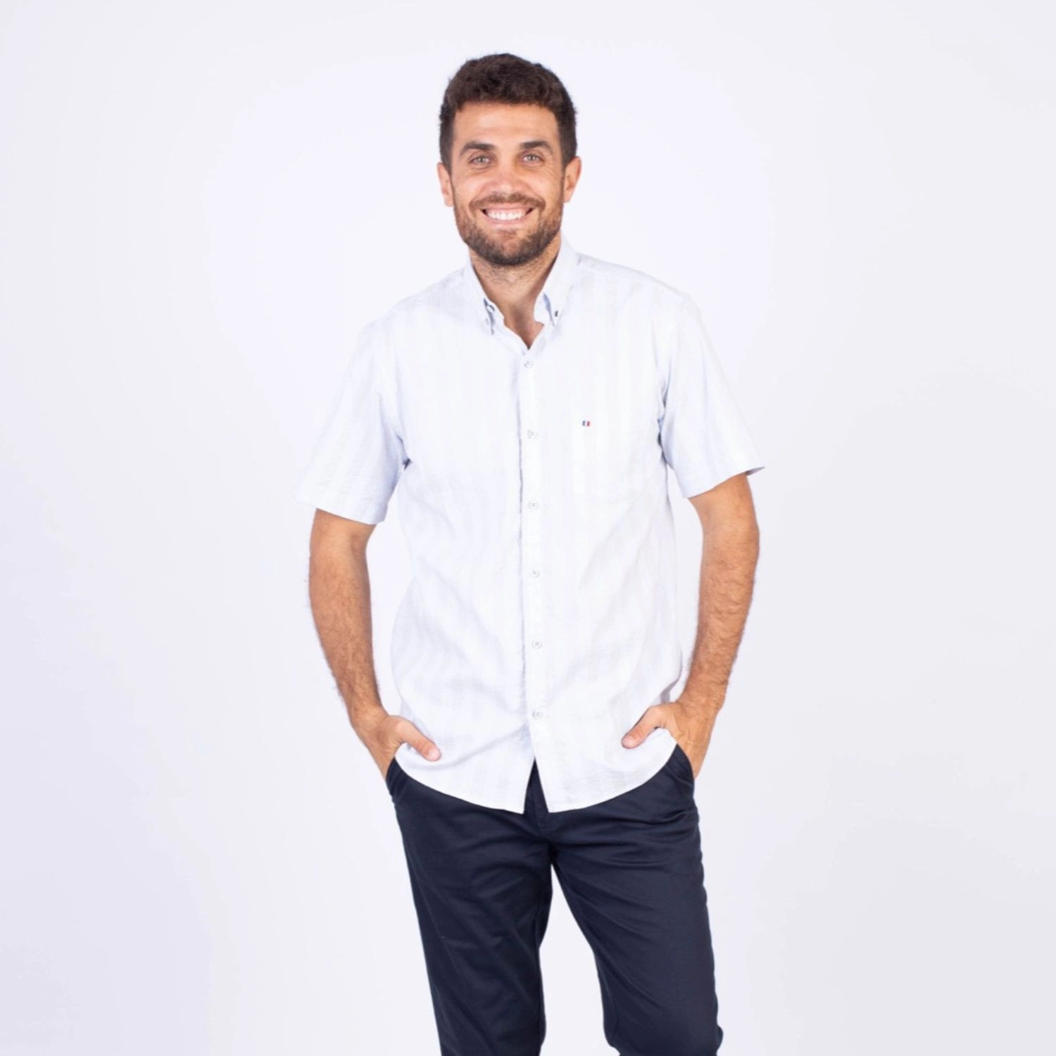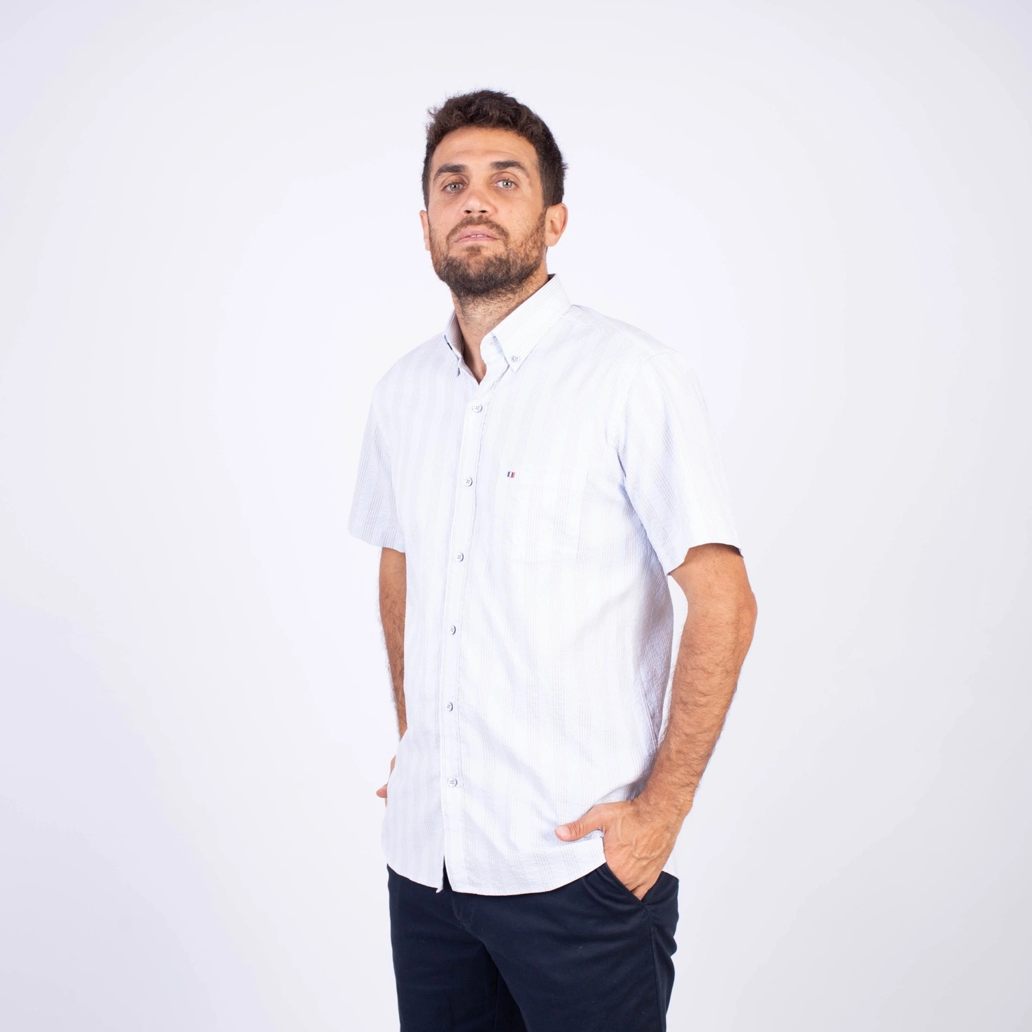 Camisa MC Seersucker Etiqueta Azul con diseño Francés.| Composición 100% Algodón.| Tela con diseño de rayas verticales.| Botones personalizados en contraste.| Aplicación de bandera francesa metalica en el bolsillo.| Cuello Buttondown| Aplicación de tela en contraste al interior de la media luna.| Aplicación de hilo y tipping Gris en contraste al interior del cuello y botones.