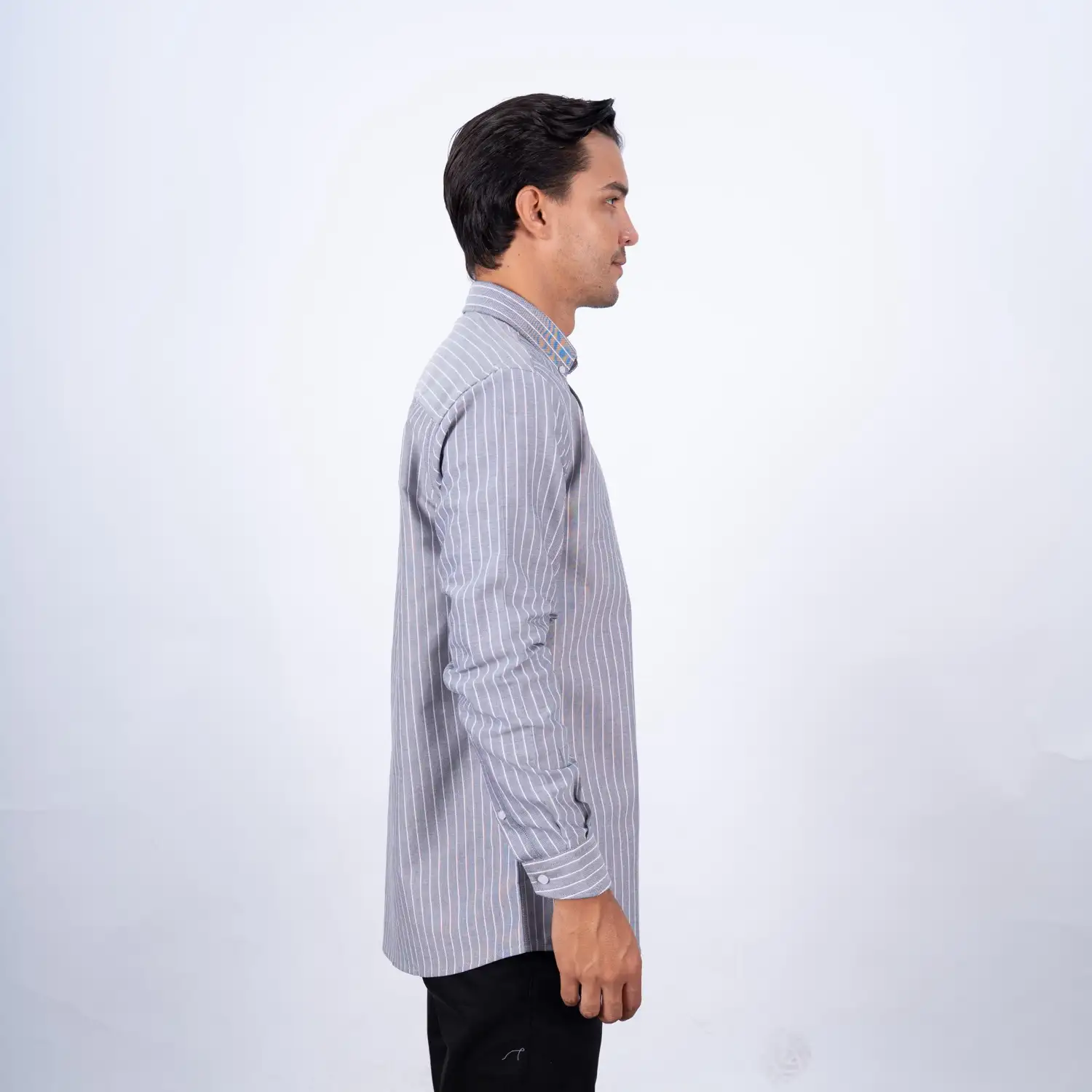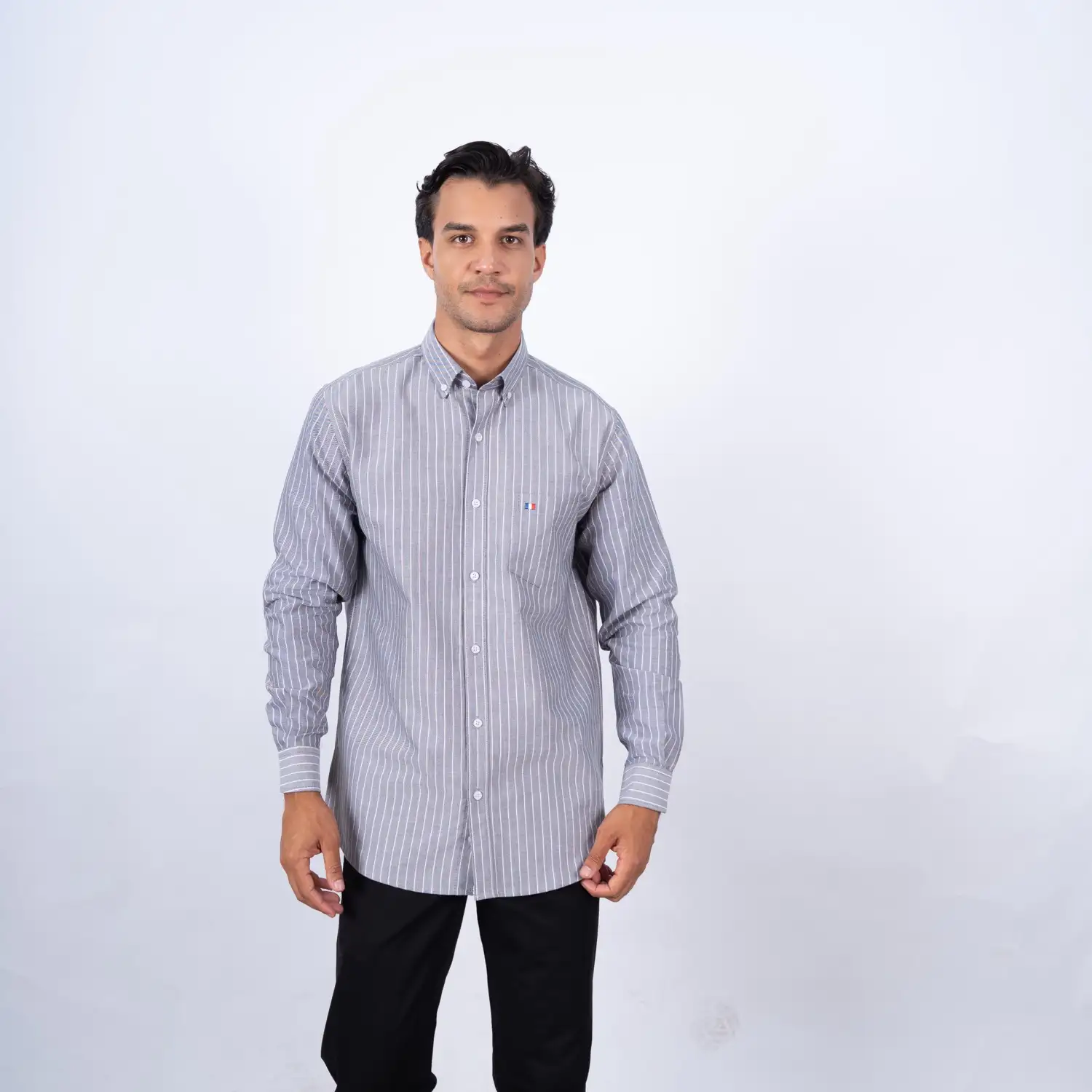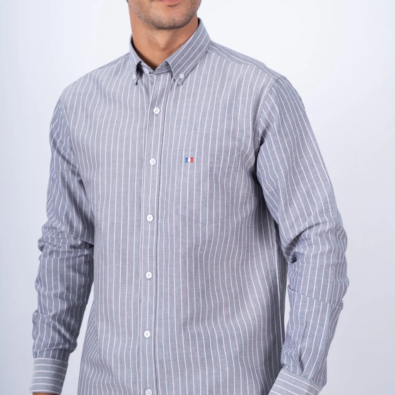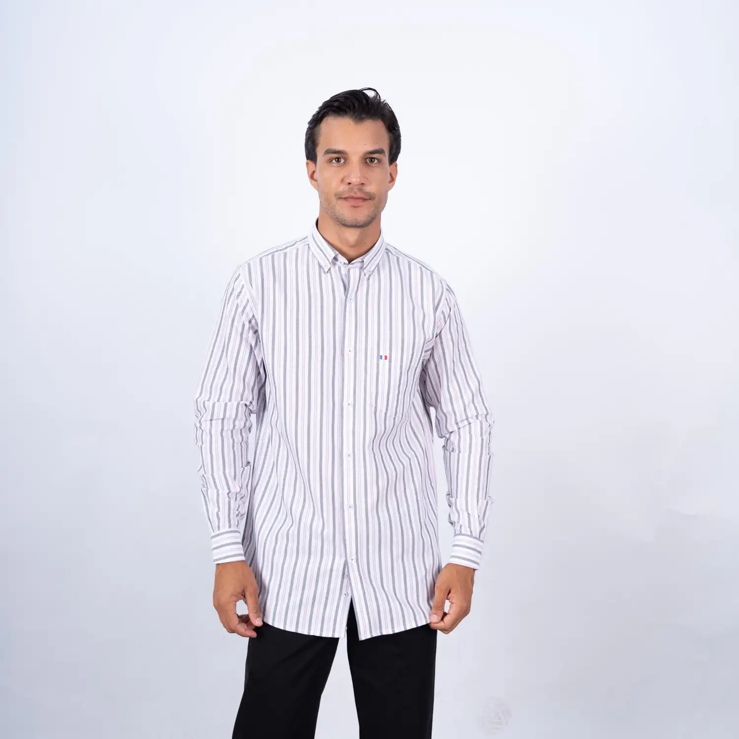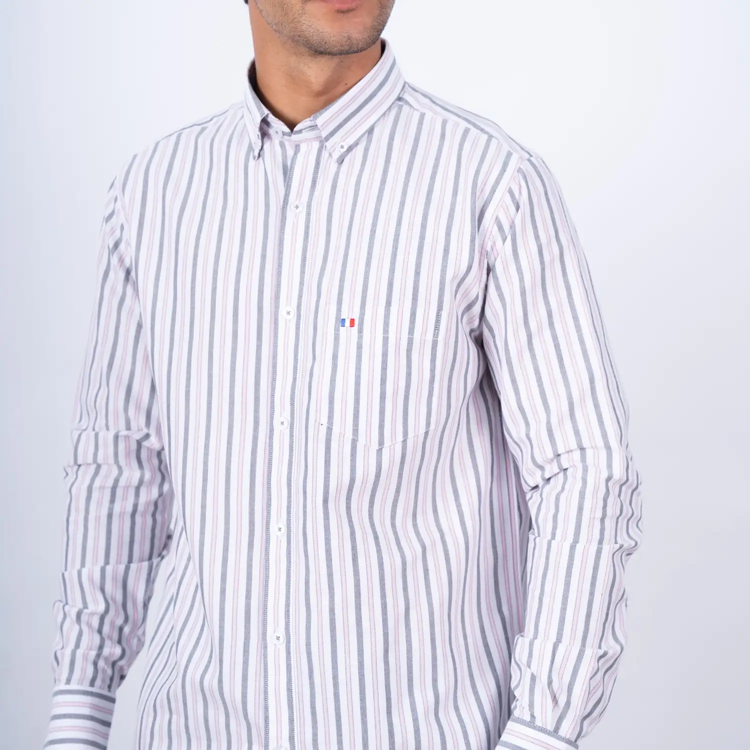 Camisa ML Etiqueta Azul con diseño Francés.| Composición 100% Algodón.| Tela con diseño de rayas verticales.| Aplicación de tela en contraste al interior del cuello, media luna, y puños.| Aplicación de bandera francesa bordada en contraste en el bolsillo.| Cuello Buttondown.| Botones personalizados.| Puño ajustable con apertura de 2 botones. | Aplicación de Hilo Rosado en cruz en contraste en los botones.