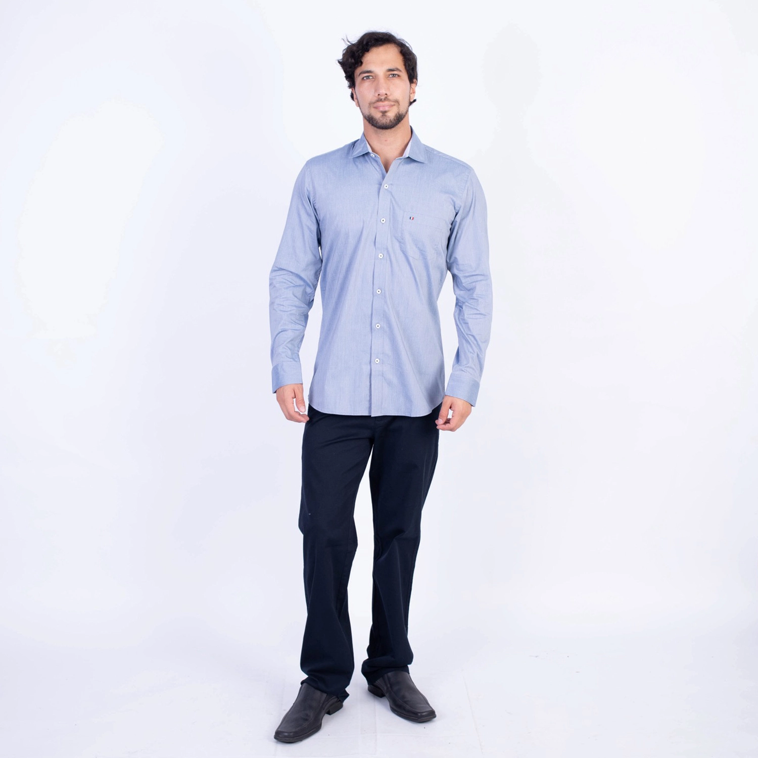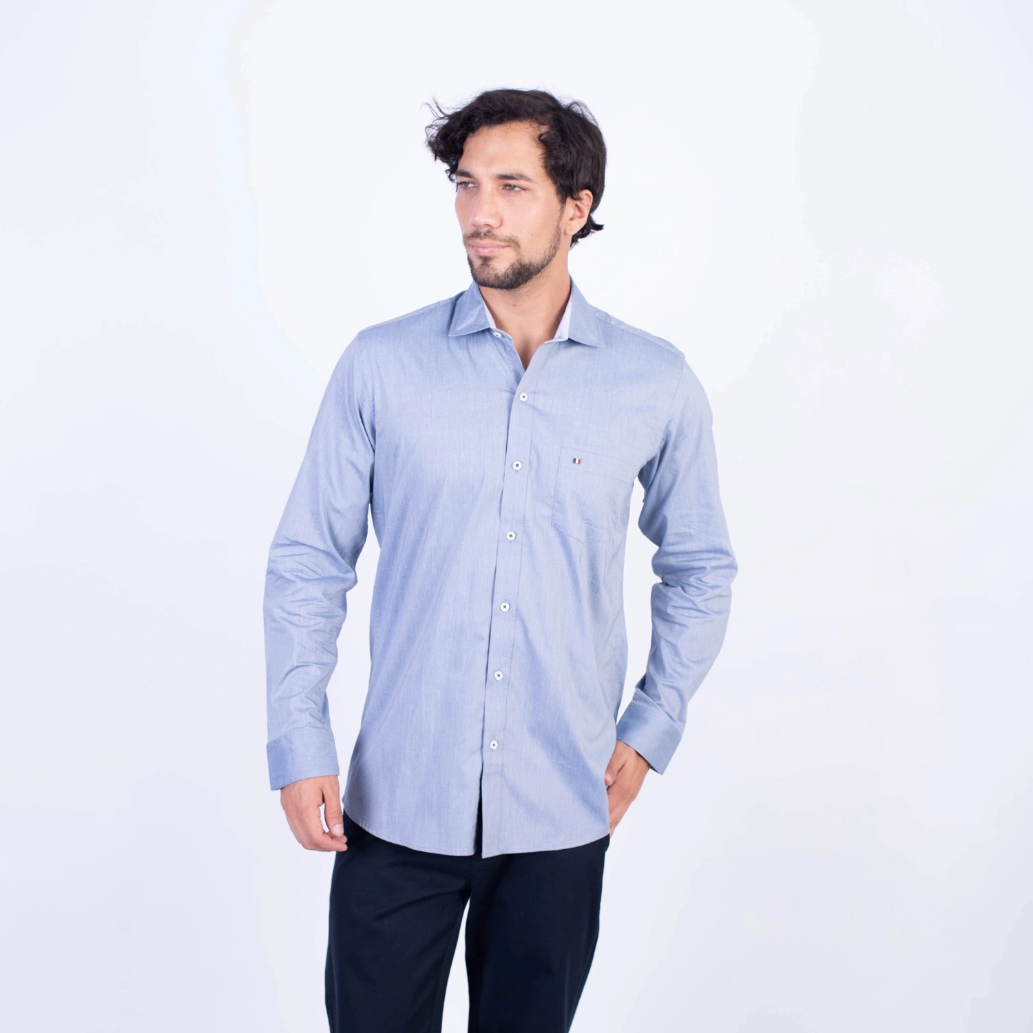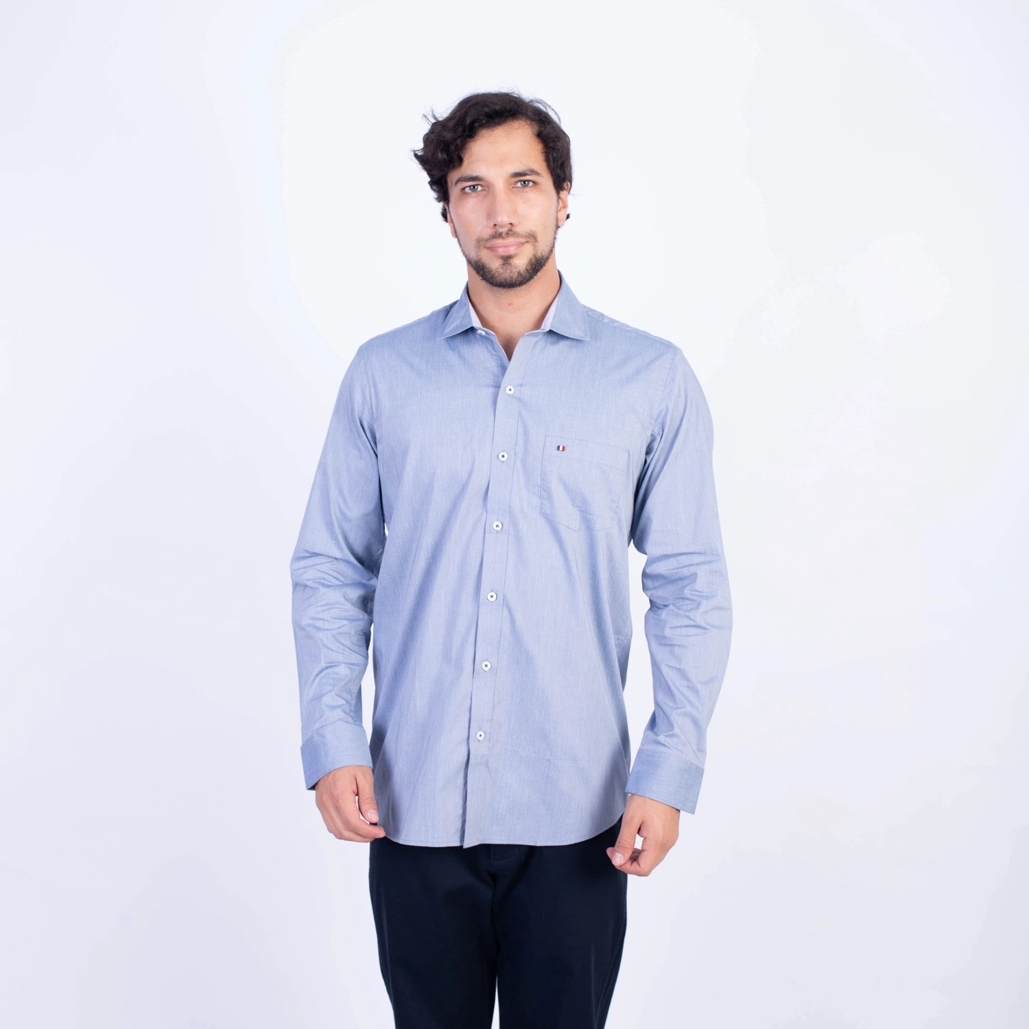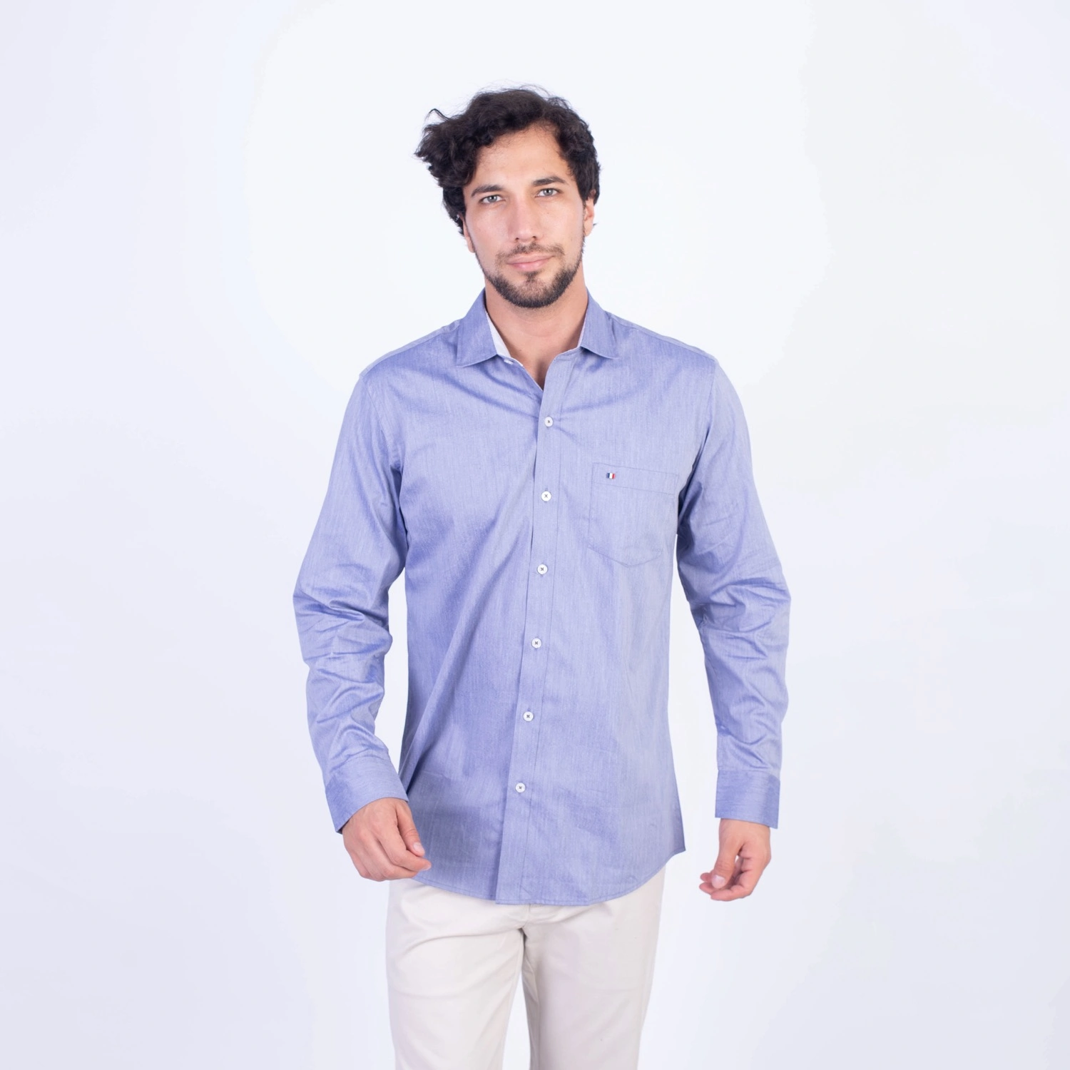 Camisa ML Popelina Etiqueta Azul con diseño frances.| Composición 65% Algodón, 32% Poliester y 3% Elastano.| Tela con diseño Color Entero.| Botones personalizados.|Puño con apertura de 2 boton.| Modelo con Cuello Frances| Aplicación de tipping azul en contraste al interior del cuello.| Aplicación de tela mil rayas en contraste al interior del cuello,puños, y media luna.| Aplicación de hilo azul en contraste en los botones.| Aplicación de bandera francesa metalica en contraste en el bolsillo. |Modelo con tela Stretch.