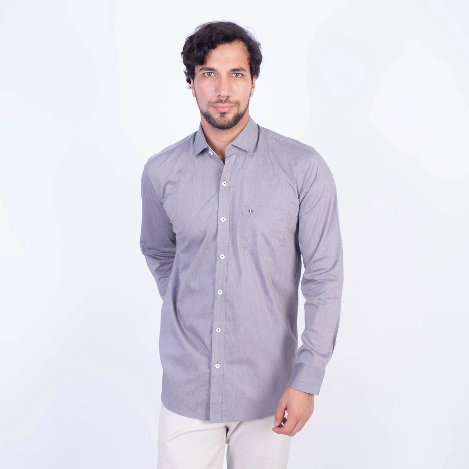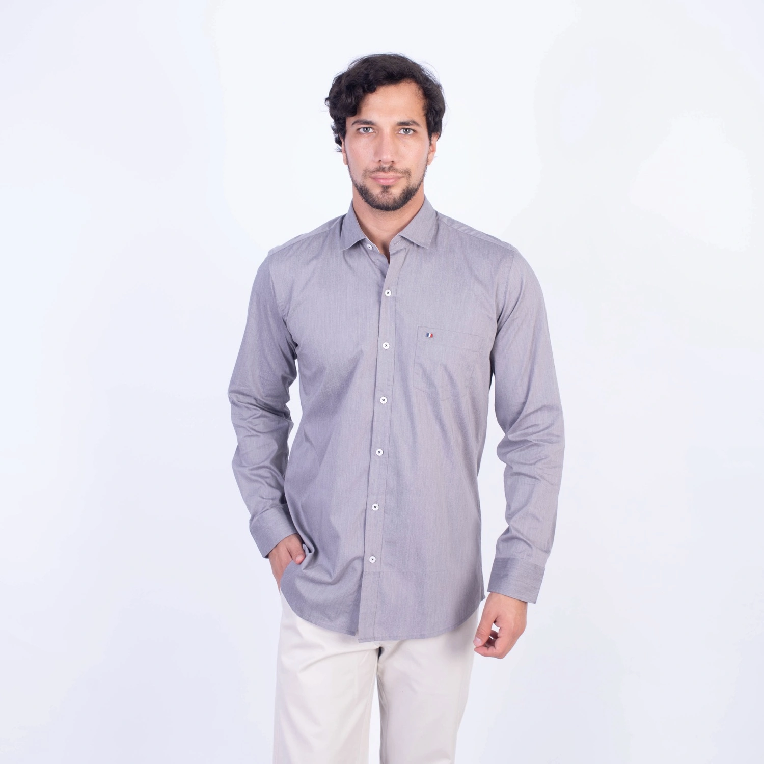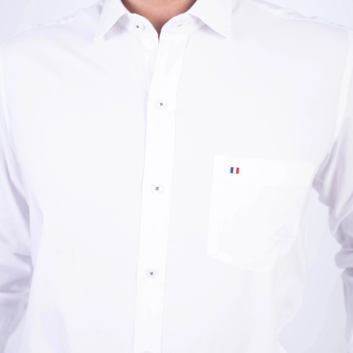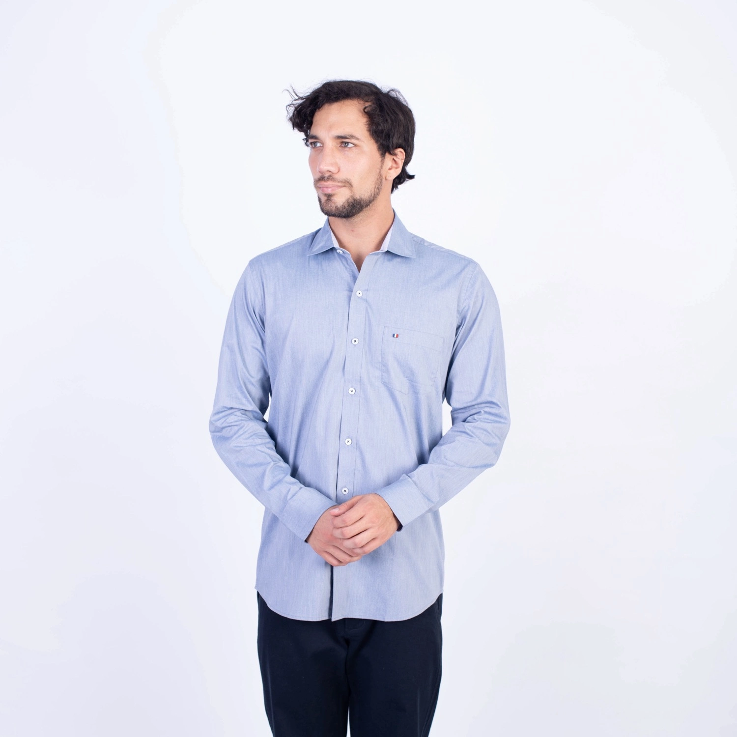 Camisa ML Popelina Etiqueta Azul con diseño frances.| Composición 65% Algodón, 32% Poliester y 3% Elastano.| Tela con diseño Color Entero.| Botones personalizados.|Puño con apertura de 2 boton.| Modelo con Cuello Frances| Aplicación de tipping azul en contraste al interior del cuello.| Aplicación de tela mil rayas en contraste al interior del cuello,puños, y media luna.| Aplicación de hilo azul en contraste en los botones.| Aplicación de bandera francesa metalica en contraste en el bolsillo. |Modelo con tela Stretch.