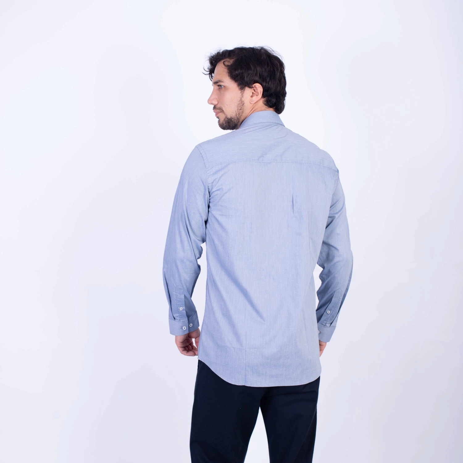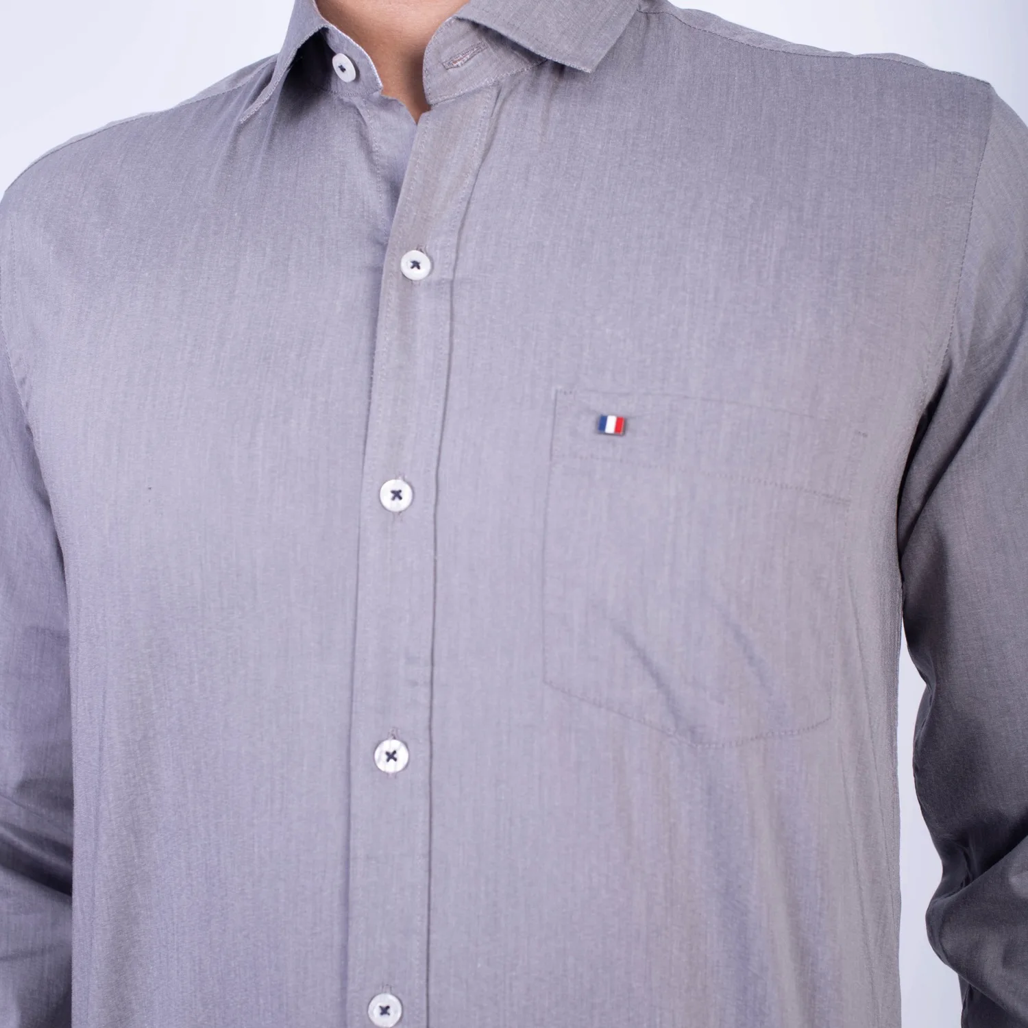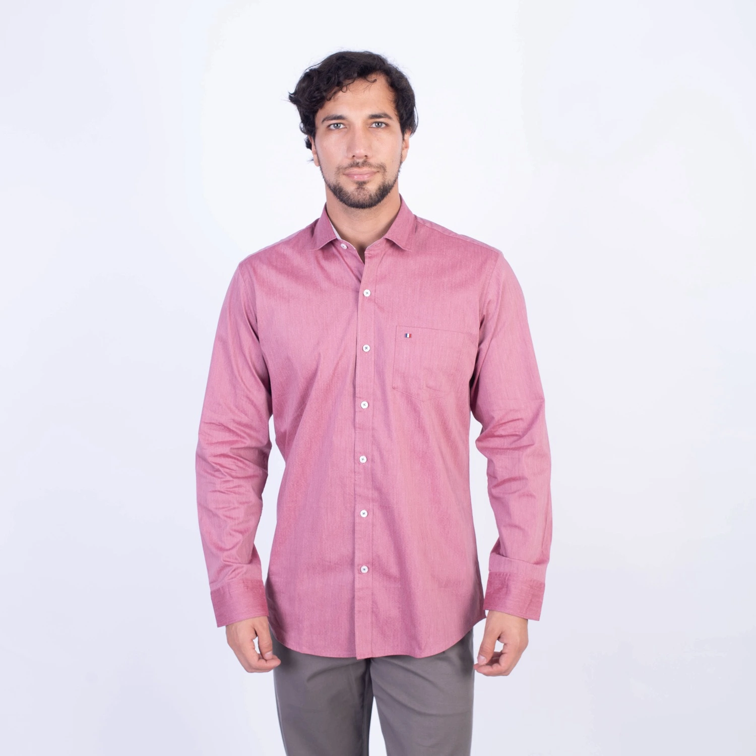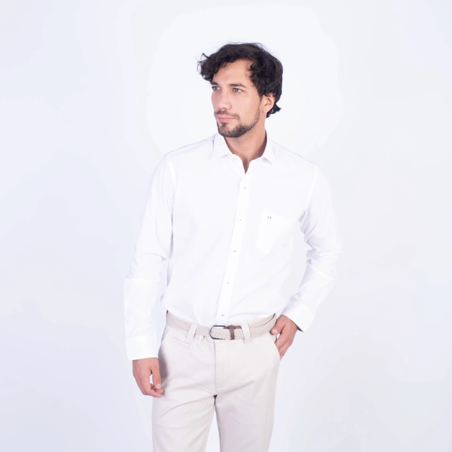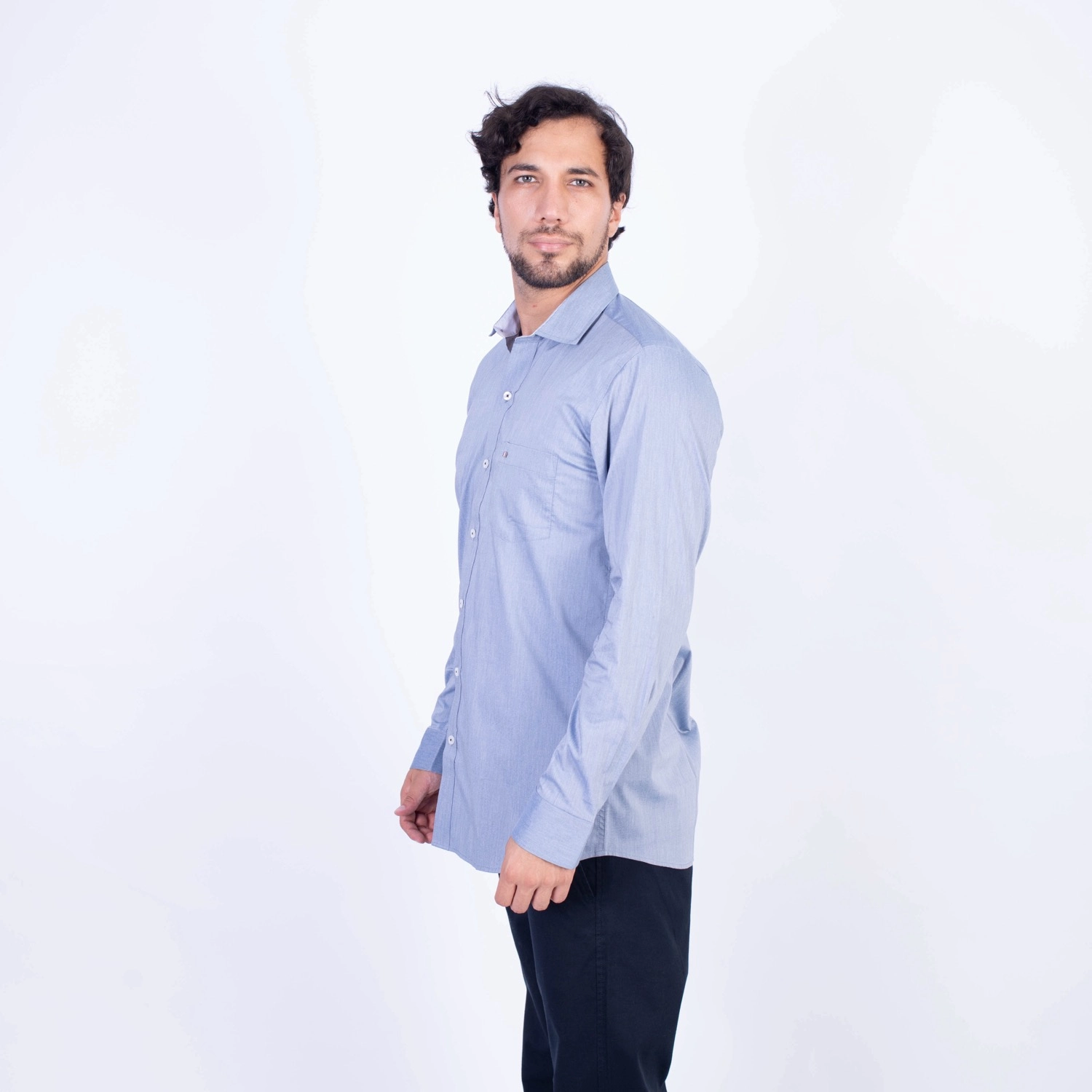Camisa ML Popelina Etiqueta Azul con diseño frances.| Composición 65% Algodón, 32% Poliester y 3% Elastano.| Tela con diseño Color Entero.| Botones personalizados.|Puño con apertura de 2 boton.| Modelo con Cuello Frances| Aplicación de tipping azul en contraste al interior del cuello.| Aplicación de tela mil rayas en contraste al interior del cuello,puños, y media luna.| Aplicación de hilo azul en contraste en los botones.| Aplicación de bandera francesa metalica en contraste en el bolsillo. |Modelo con tela Stretch.