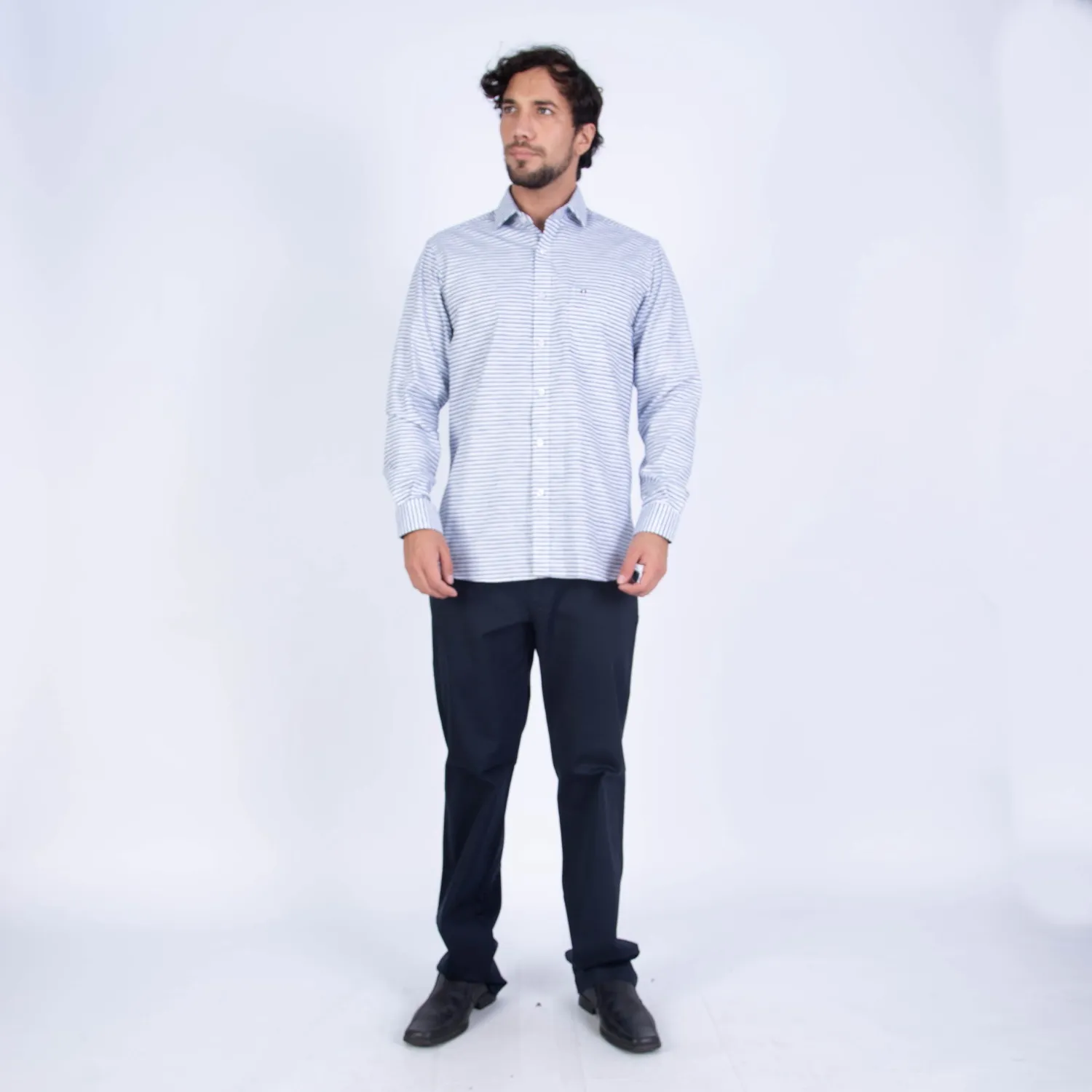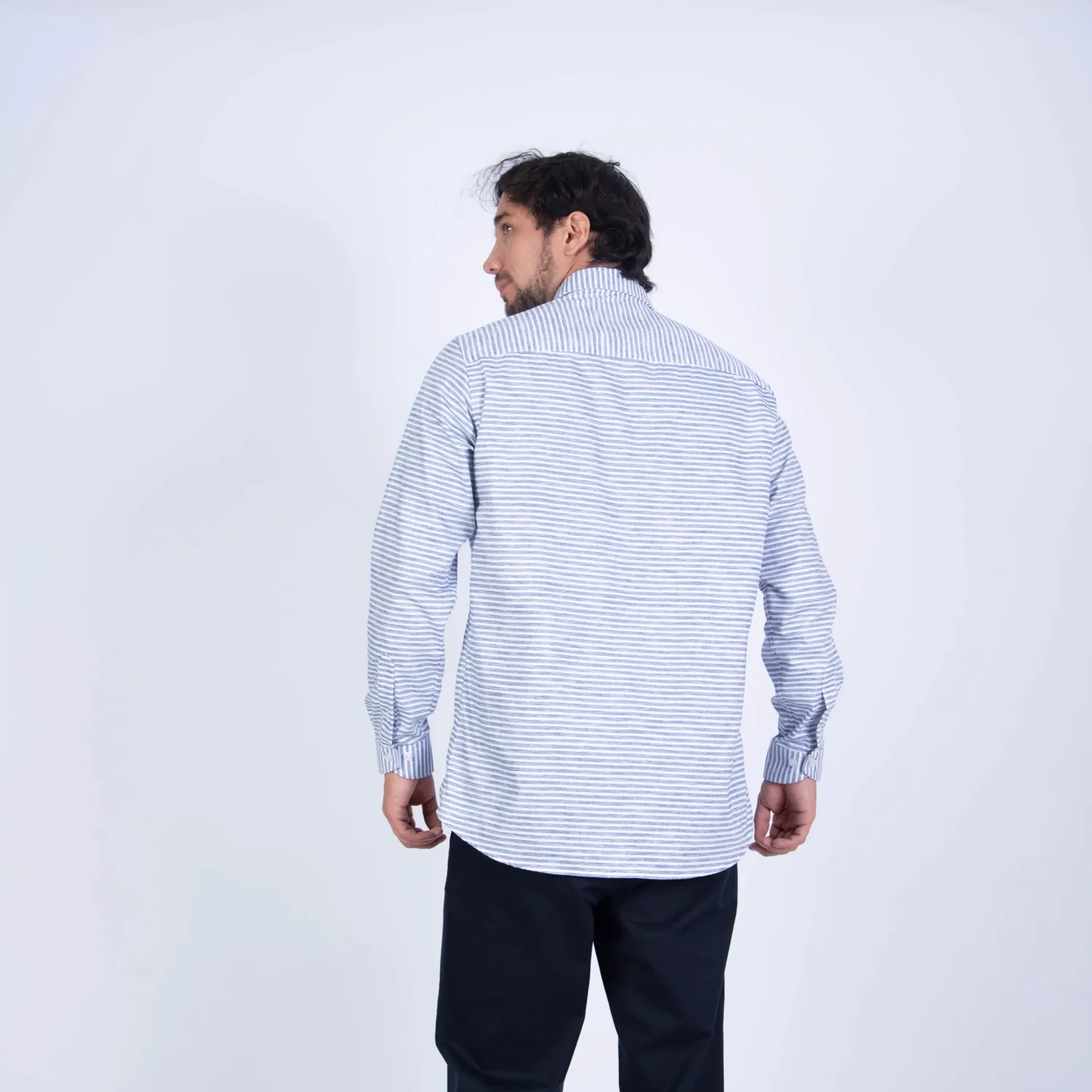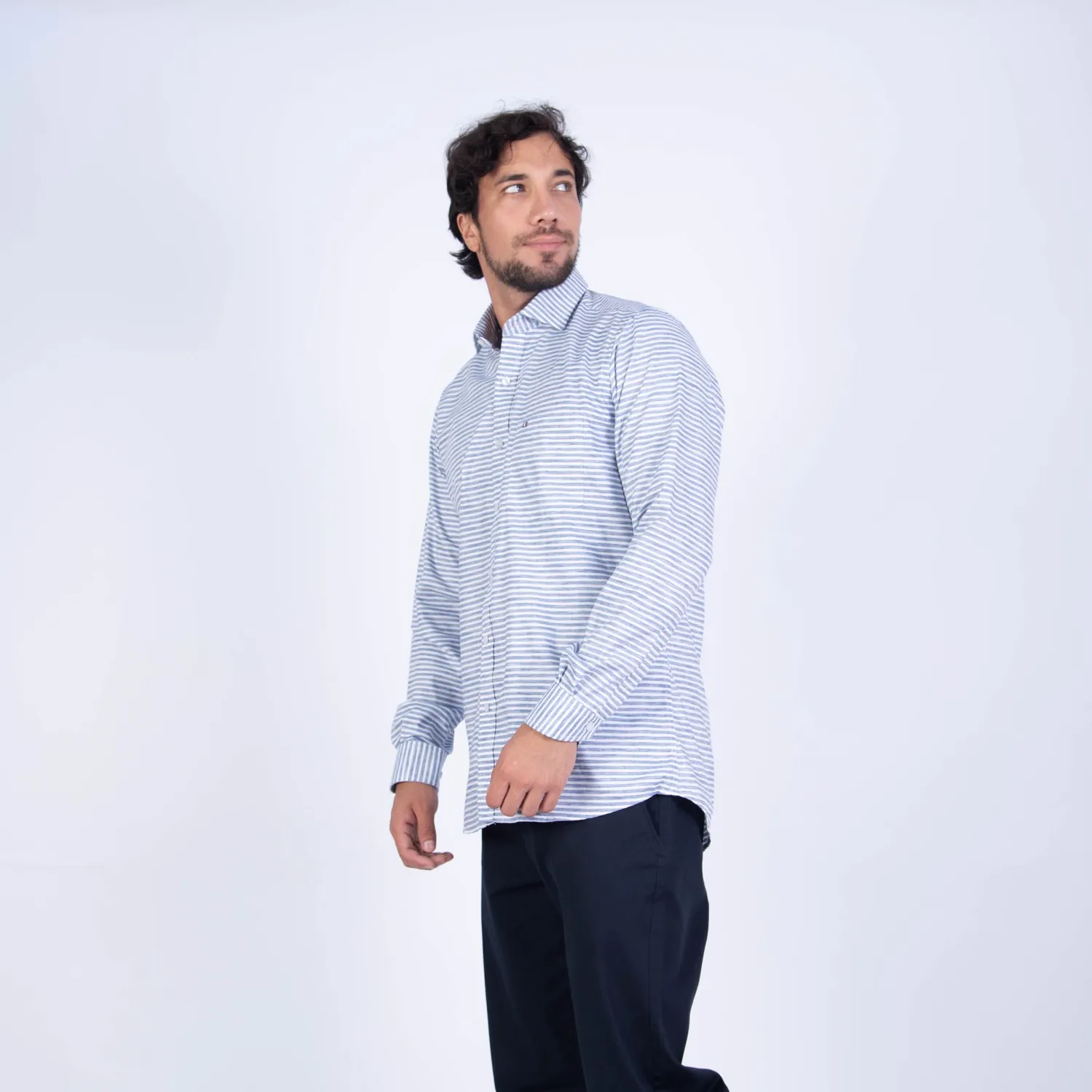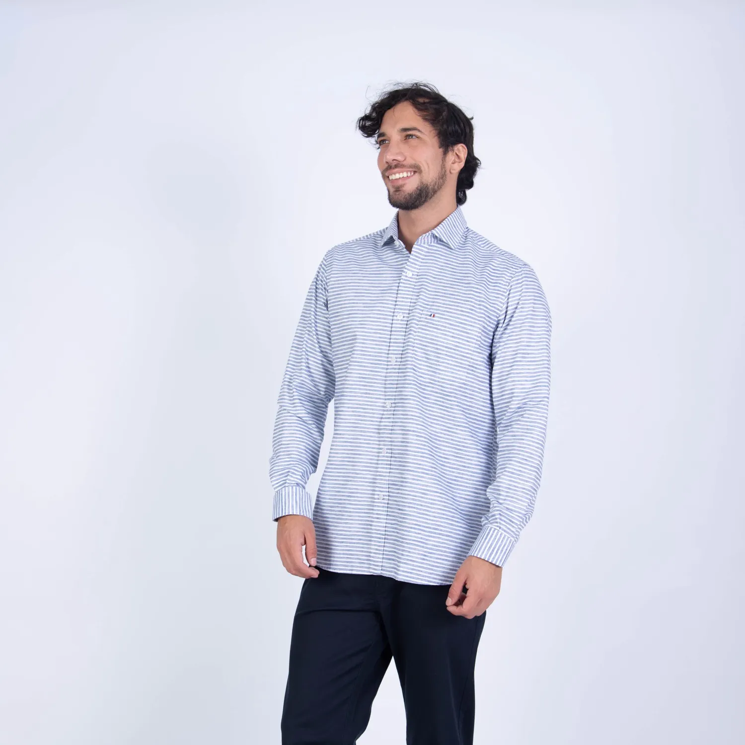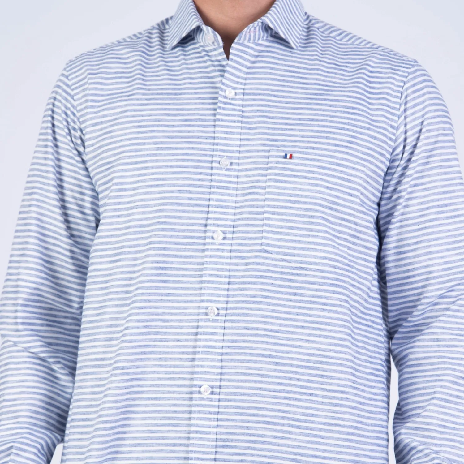 Camisa ML Sport con Cuello Frances Etiqueta Puro Lino Italy.| Composición 100% Lino.| Tela con diseño de rayas horizontales.| Etiqueta Puro Lino Italy.| Camisa Sport Manga Larga.| Modelo con Cuello Frances.| Bolsillo en la pechera de la camisa.| Aplicación de bandera francesa metallica en el bolsillo.| Botones personalizados.| Aplicación de hilo rosado en contraste en los botones. |Aplicación de ojal principal bordado con hilo rosado. | Puño con cierre de dos botones.