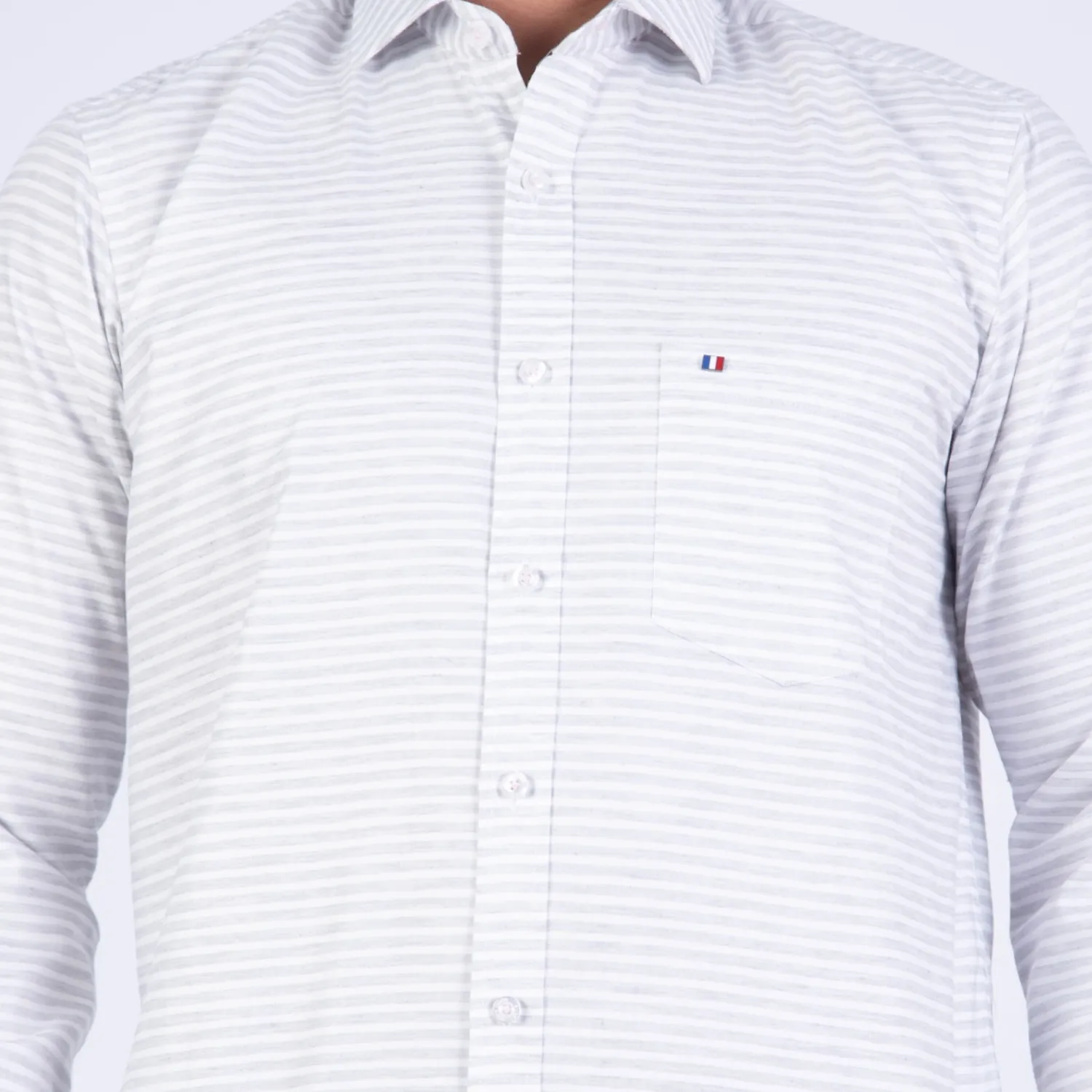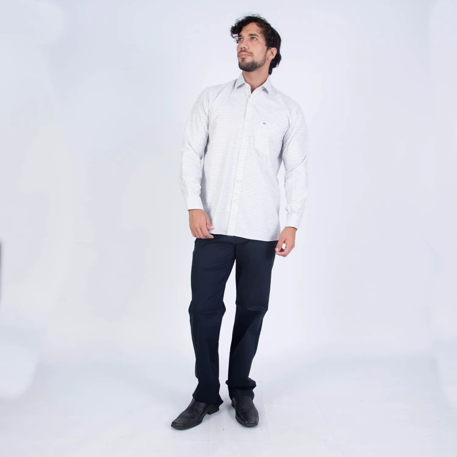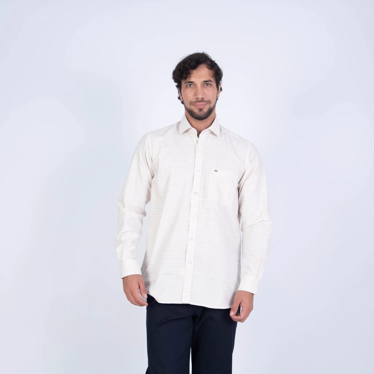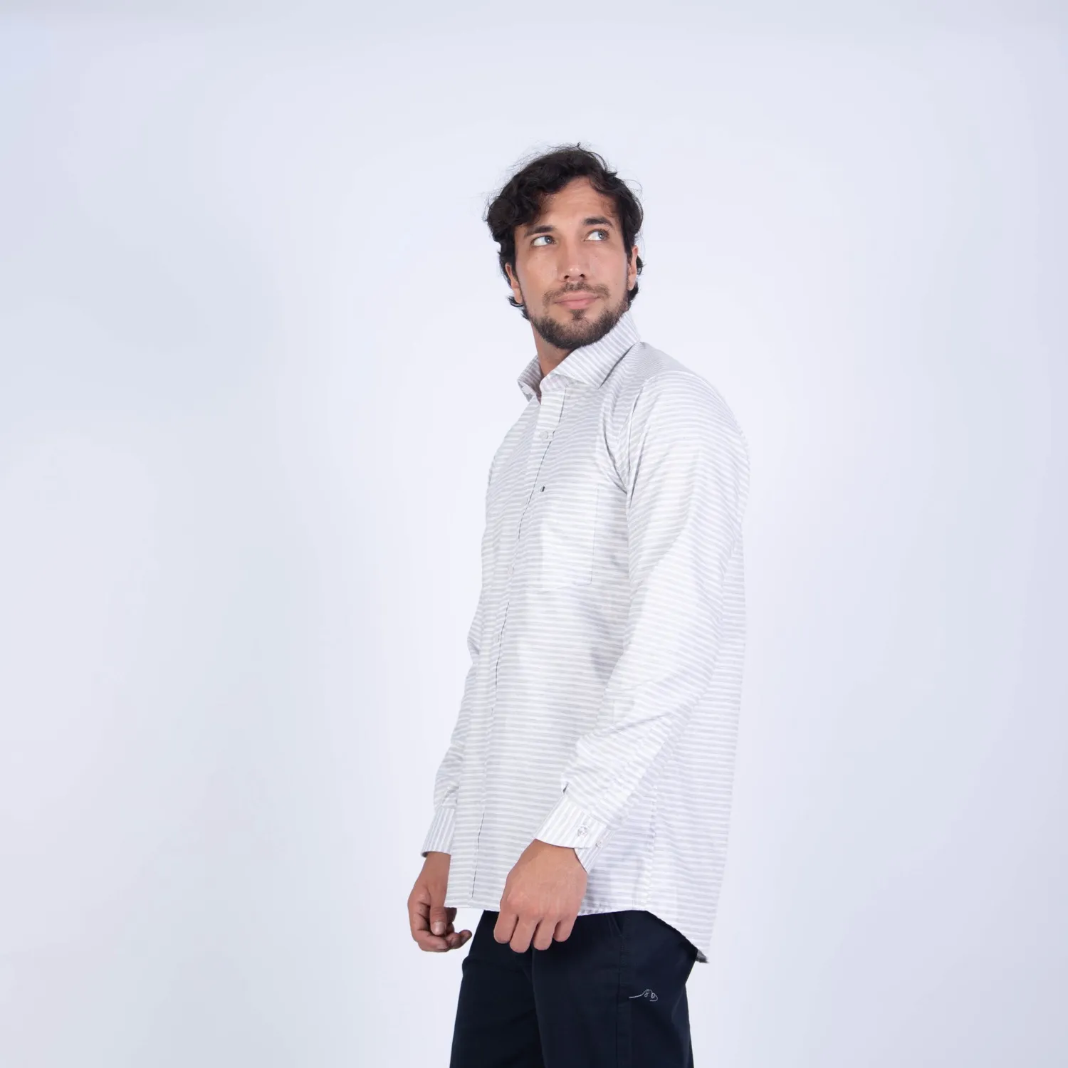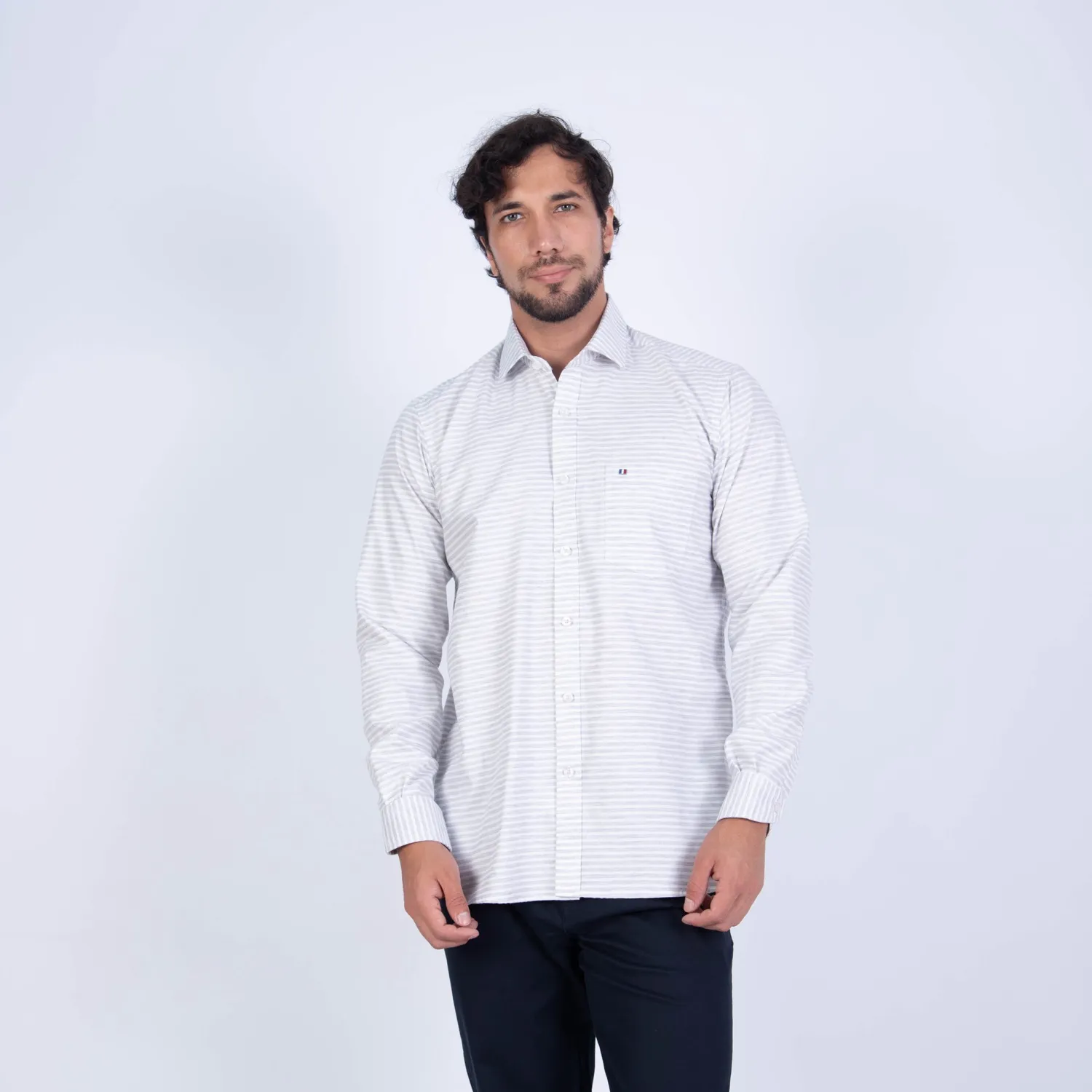 Camisa ML Sport con Cuello Frances Etiqueta Puro Lino Italy.| Composición 100% Lino.| Tela con diseño de rayas horizontales.| Etiqueta Puro Lino Italy.| Camisa Sport Manga Larga.| Modelo con Cuello Frances.| Bolsillo en la pechera de la camisa.| Aplicación de bandera francesa metallica en el bolsillo.| Botones personalizados.| Aplicación de hilo rosado en contraste en los botones. |Aplicación de ojal principal bordado con hilo rosado. | Puño con cierre de dos botones.