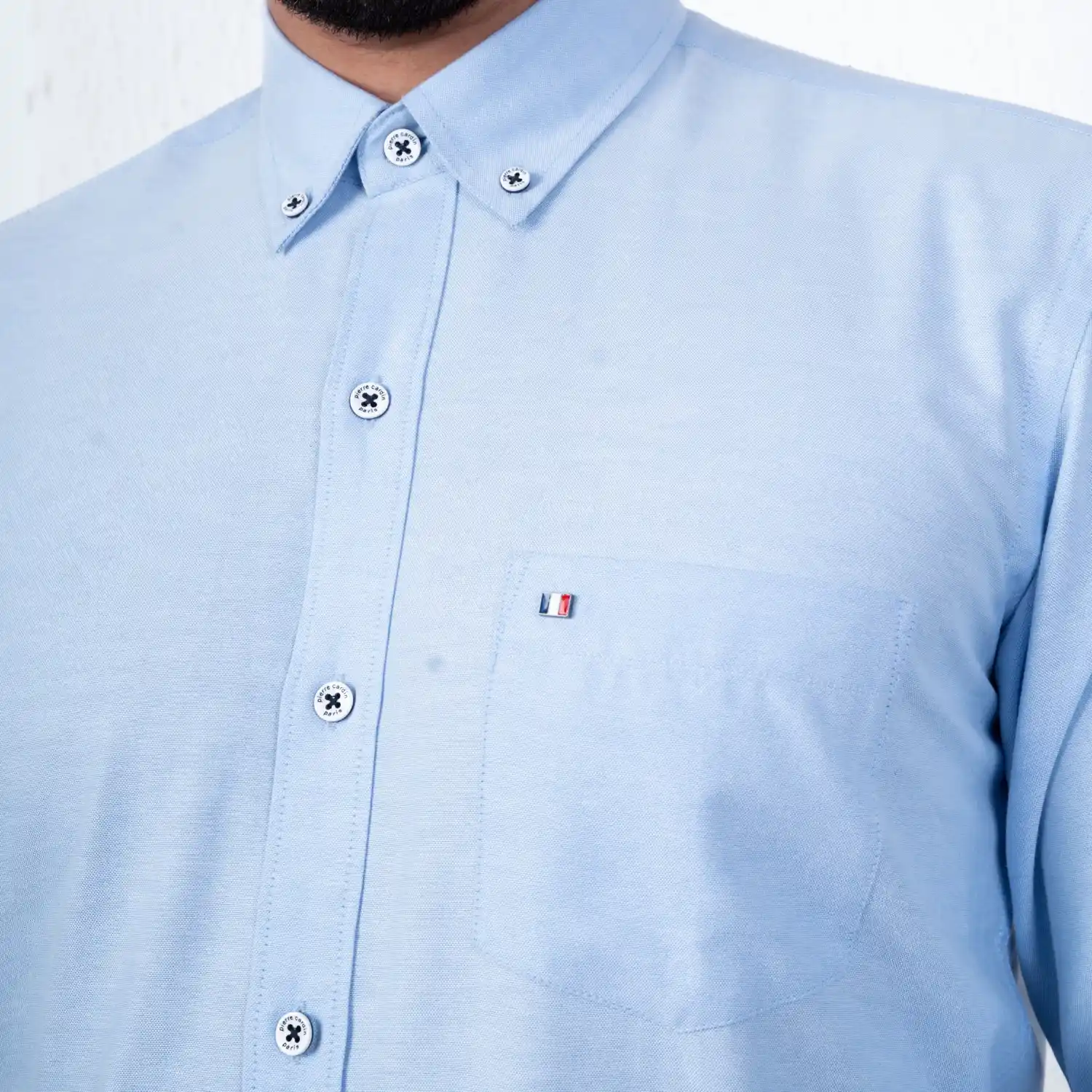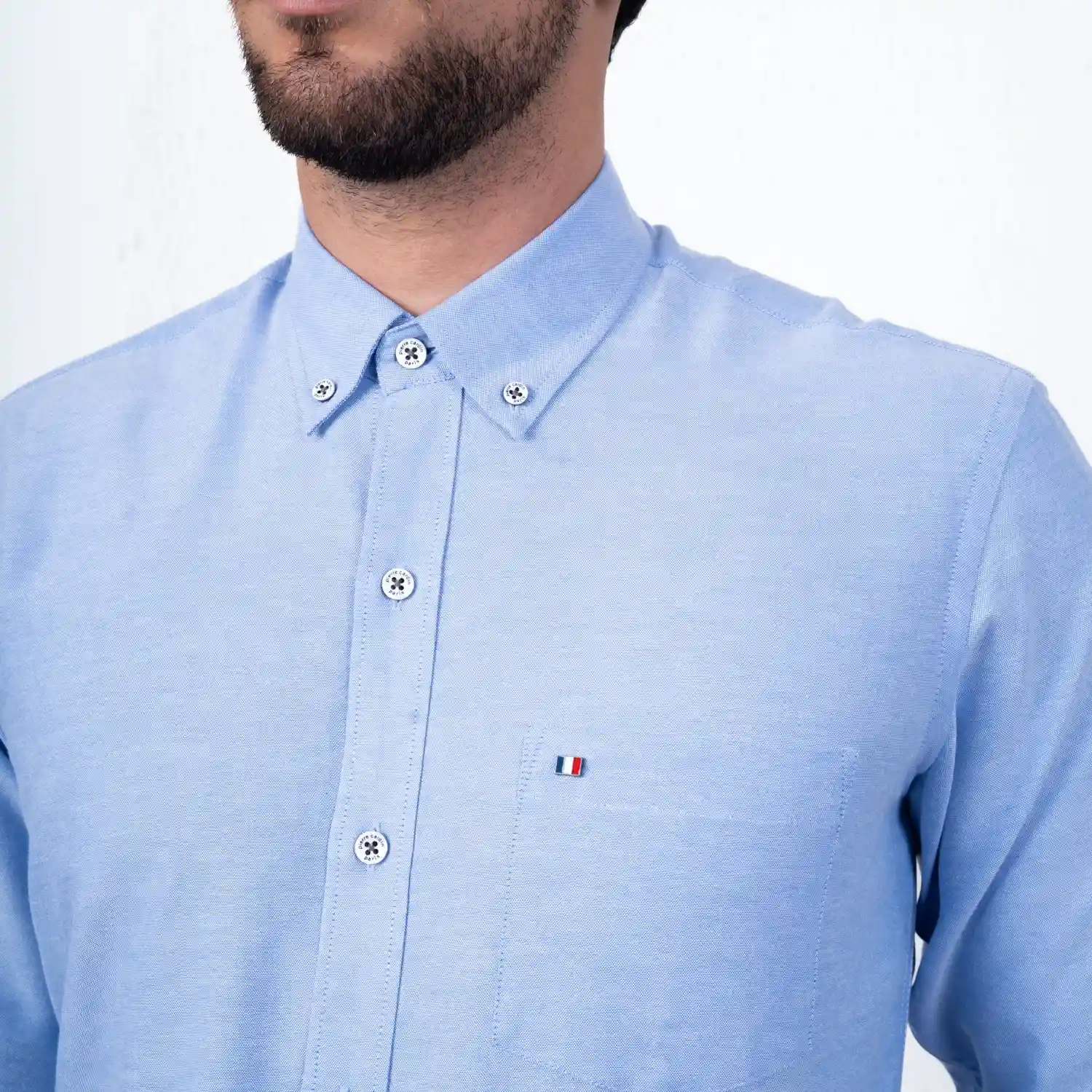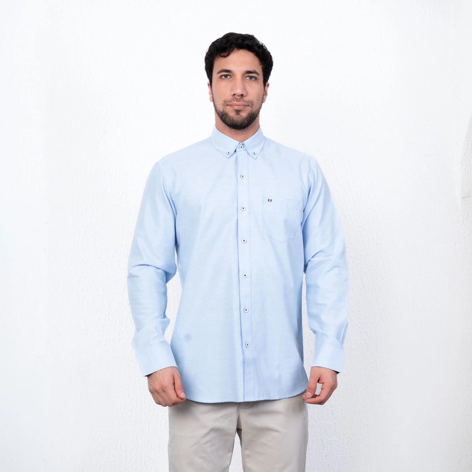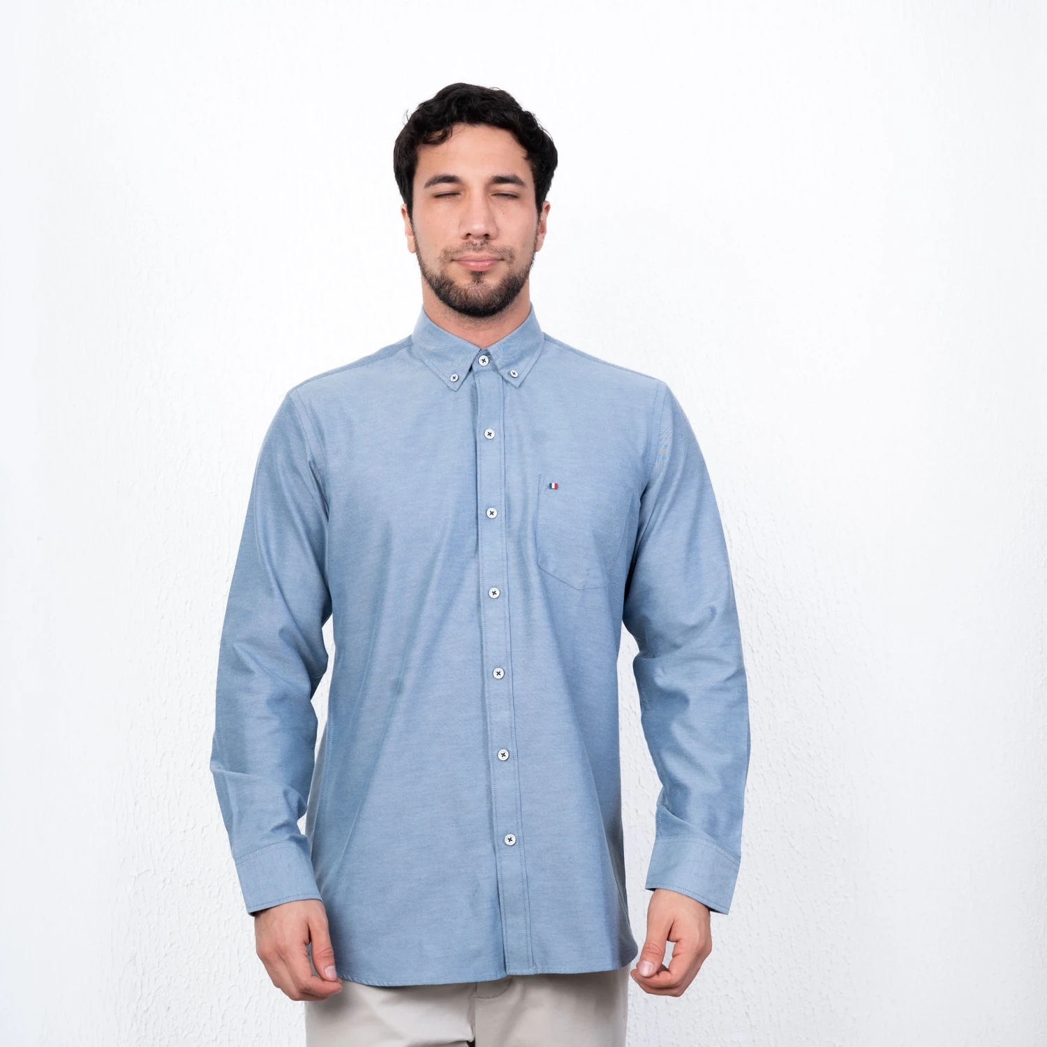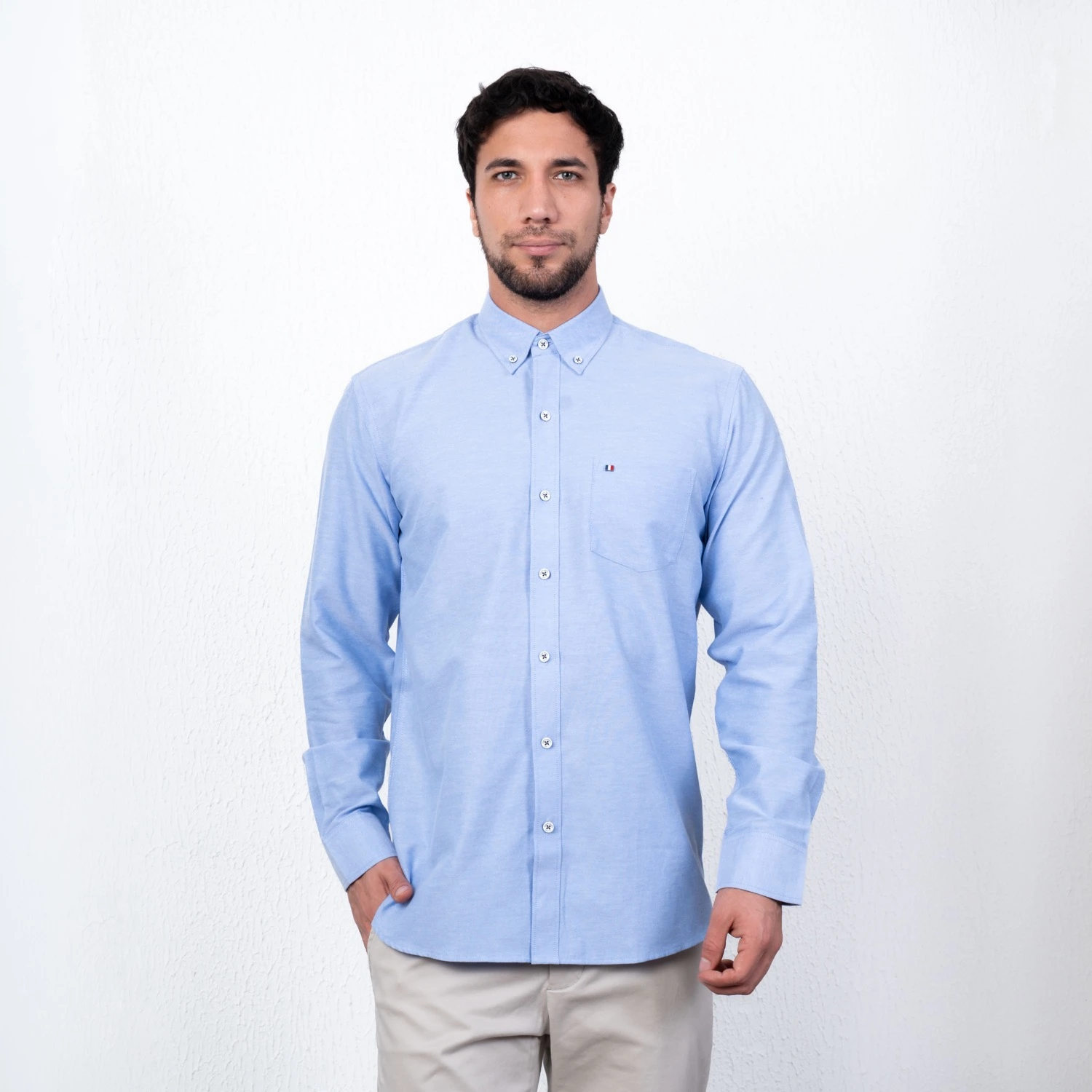 Camisa Oxford ML Color Entero Etiqueta Azul con diseño Francés.| Composición 62% Algodón y 38% Poliester.| Tela con diseño color entero.| Botones personalizados en contraste.| Aplicación de bandera francesa metalica en el bolsillo.| Cuello Buttondown| Aplicación de tela mil rayas en contraste al interior de la media luna y los puños.| Tela Oxord.| Apertura de puños con 2 botones.| Aplicación de cinta Tipping en el cuello en contraste.| Aplicación de hilo en contraste en los botones.