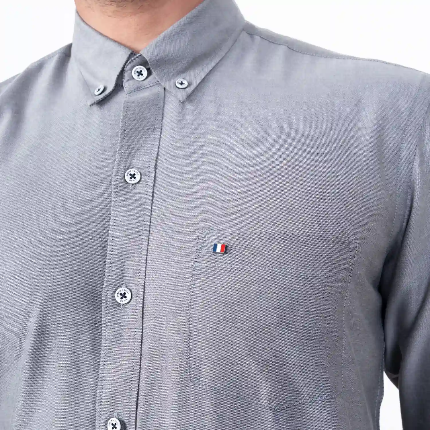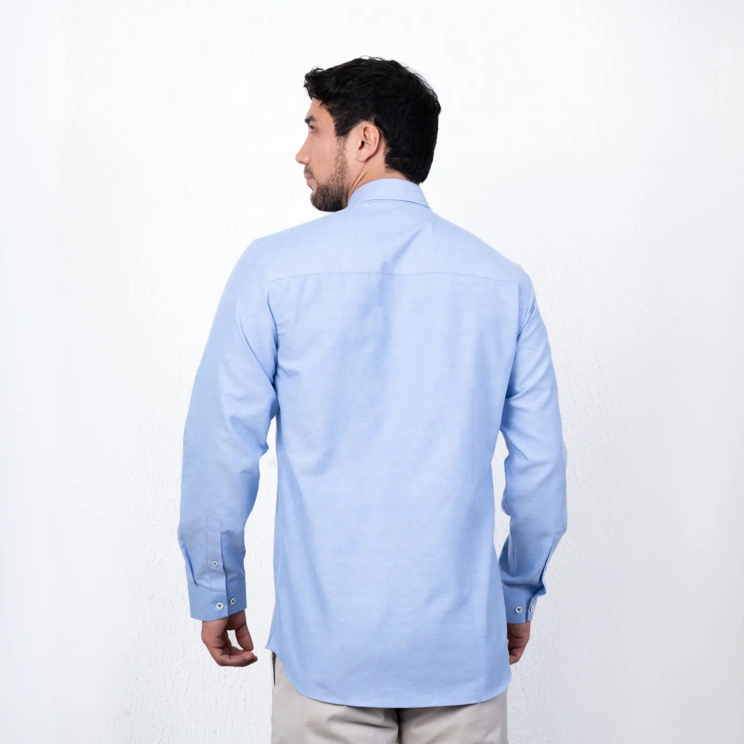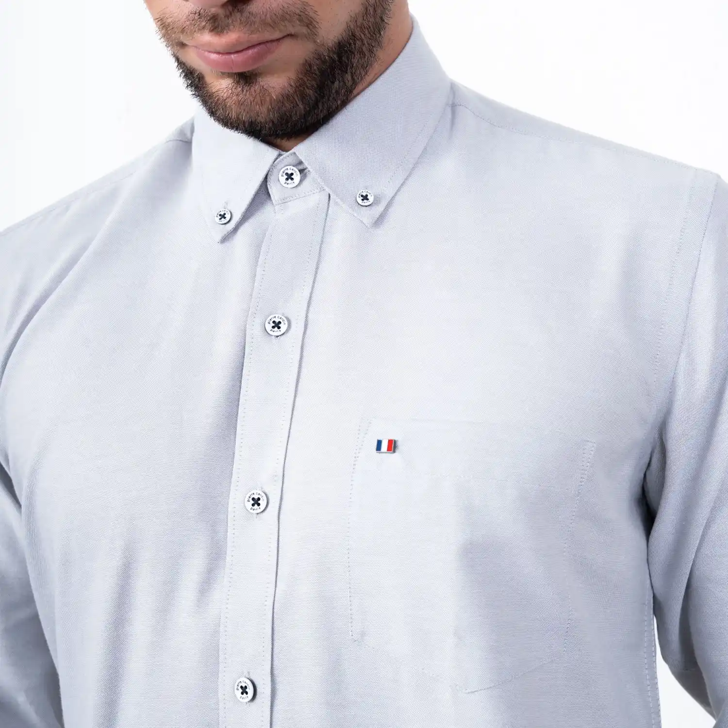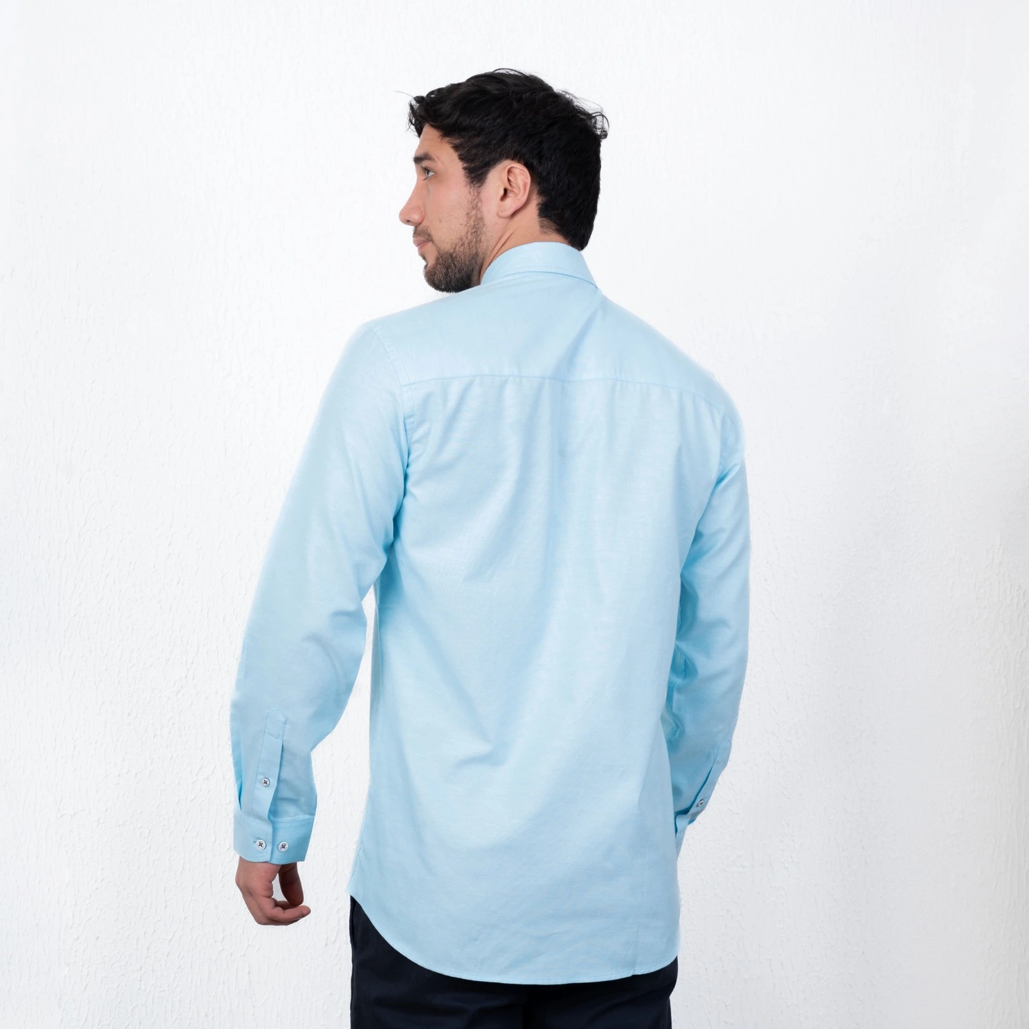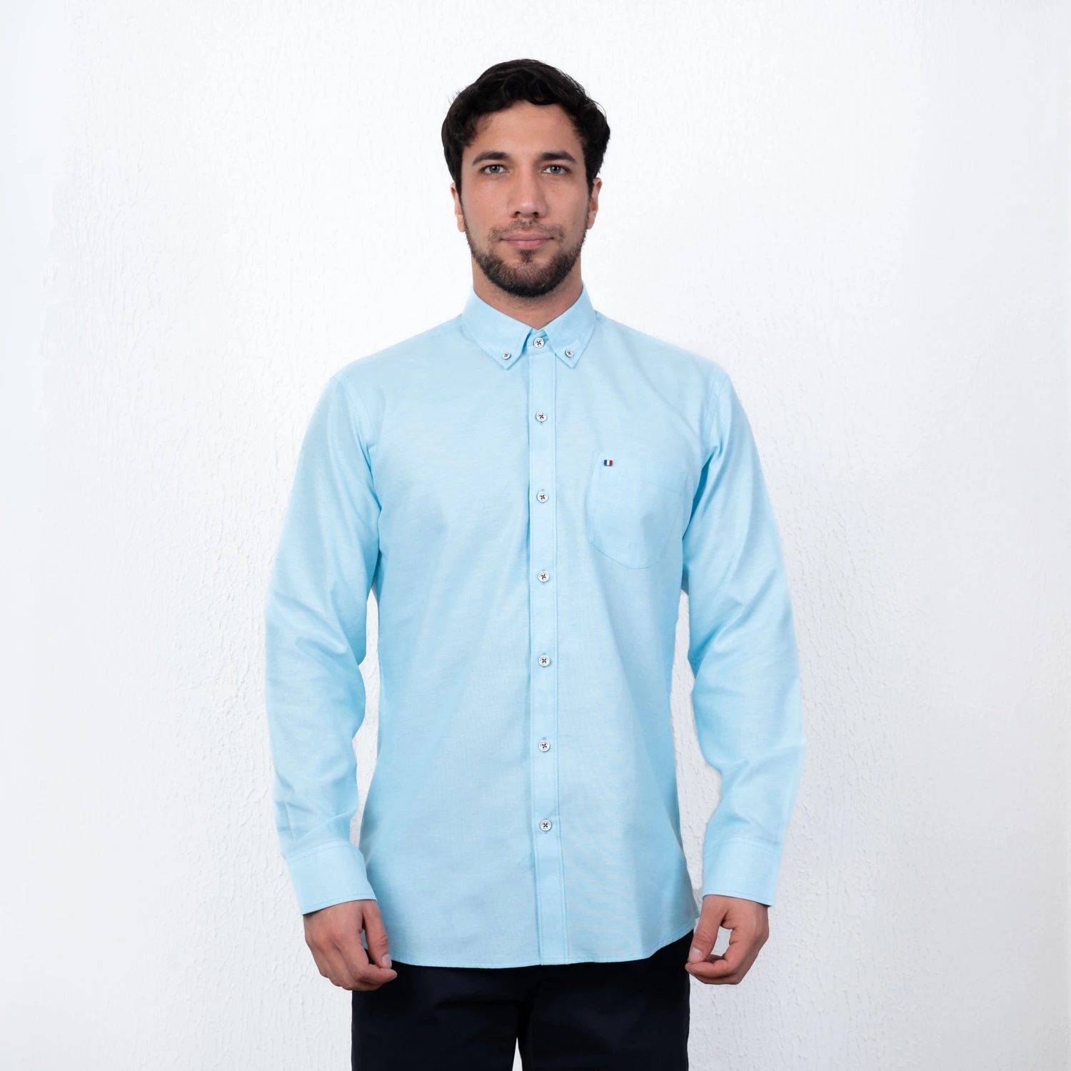 Camisa Oxford ML Color Entero Etiqueta Azul con diseño Francés.| Composición 62% Algodón y 38% Poliester.| Tela con diseño color entero.| Botones personalizados en contraste.| Aplicación de bandera francesa metalica en el bolsillo.| Cuello Buttondown| Aplicación de tela mil rayas en contraste al interior de la media luna y los puños.| Tela Oxord.| Apertura de puños con 2 botones.| Aplicación de cinta Tipping en el cuello en contraste.| Aplicación de hilo en contraste en los botones.