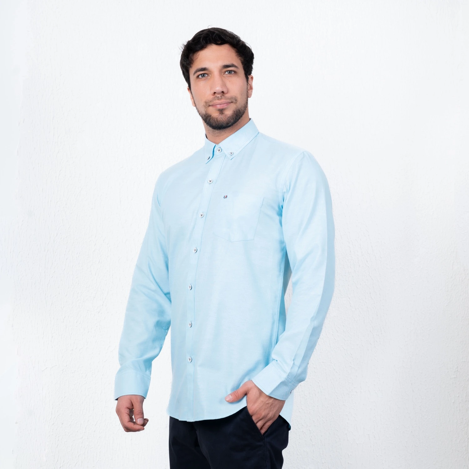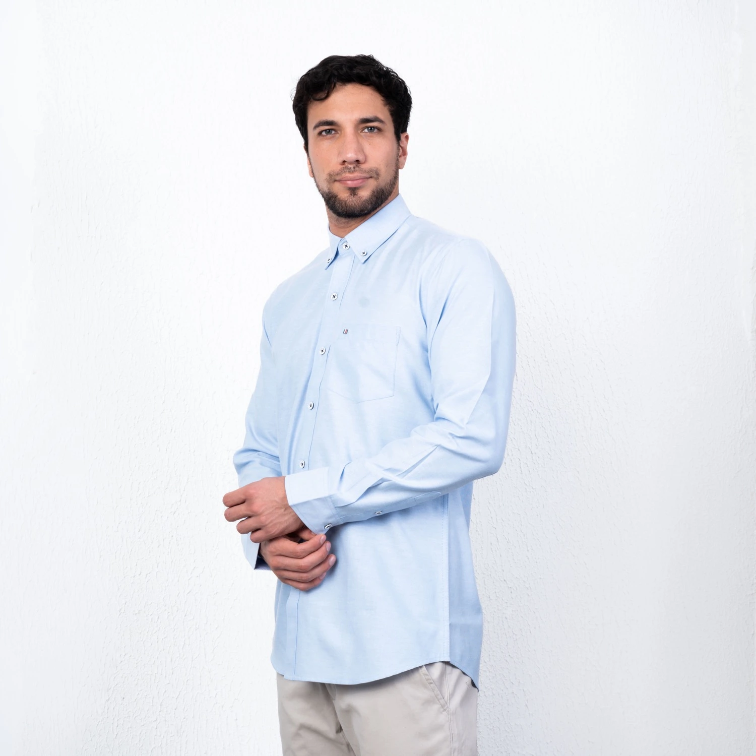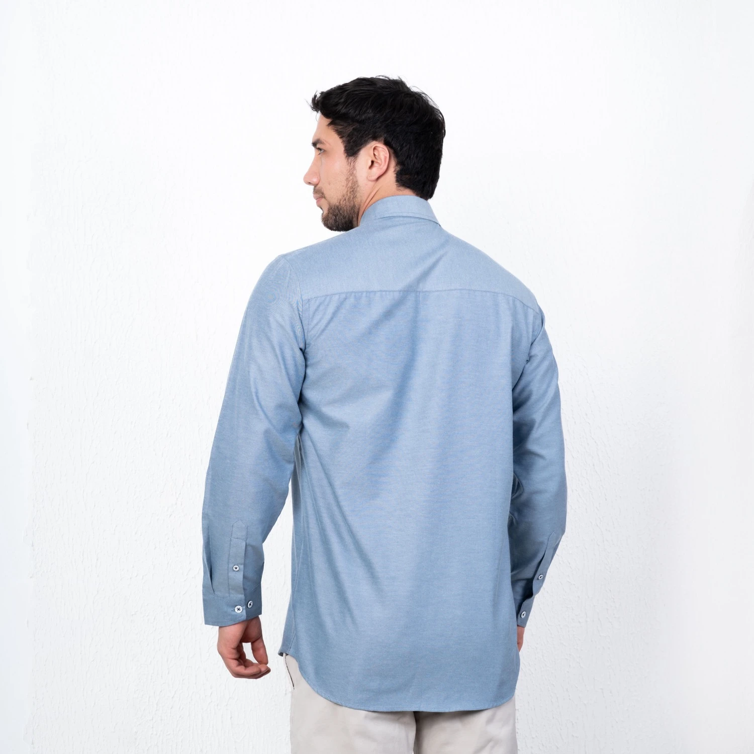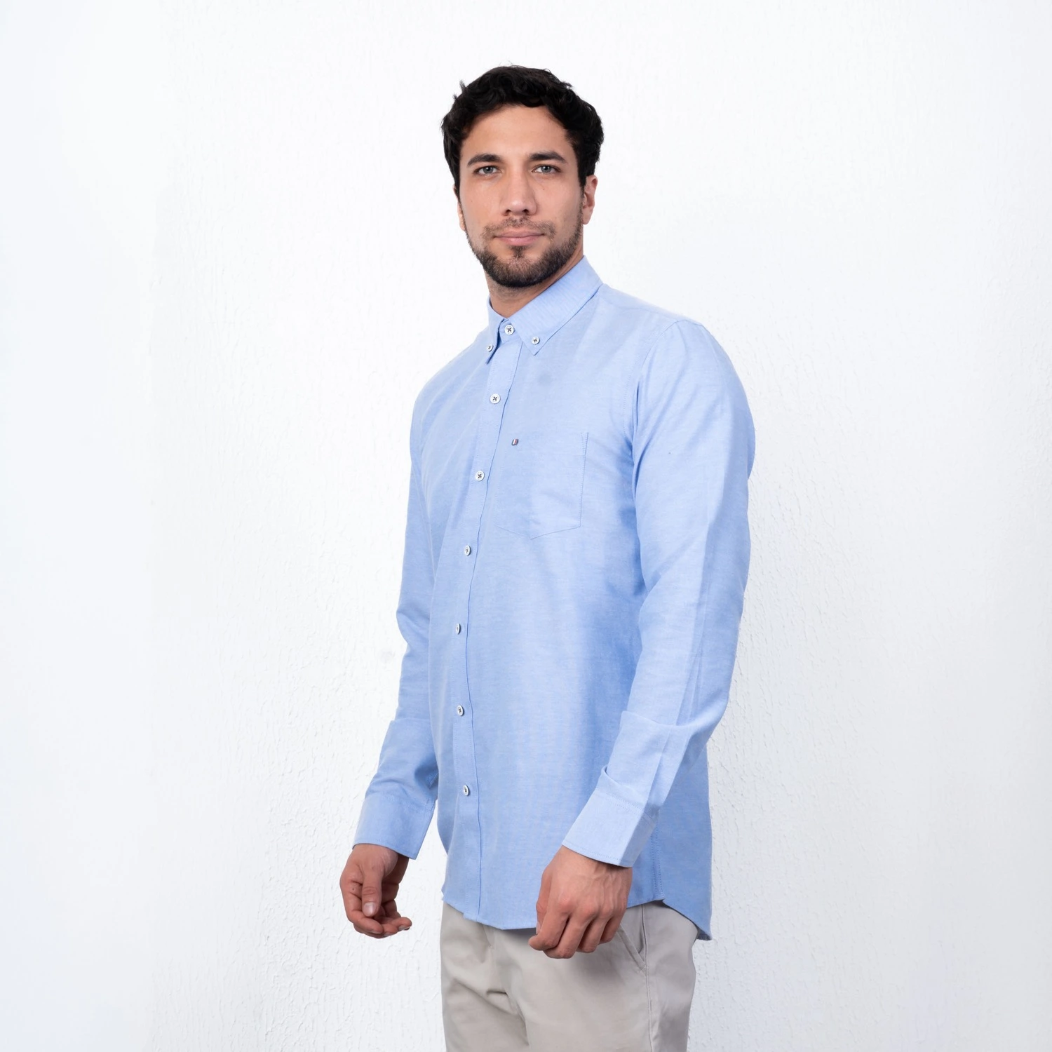 Camisa Oxford ML Color Entero Etiqueta Azul con diseño Francés.| Composición 62% Algodón y 38% Poliester.| Tela con diseño color entero.| Botones personalizados en contraste.| Aplicación de bandera francesa metalica en el bolsillo.| Cuello Buttondown| Aplicación de tela mil rayas en contraste al interior de la media luna y los puños.| Tela Oxord.| Apertura de puños con 2 botones.| Aplicación de cinta Tipping en el cuello en contraste.| Aplicación de hilo en contraste en los botones.