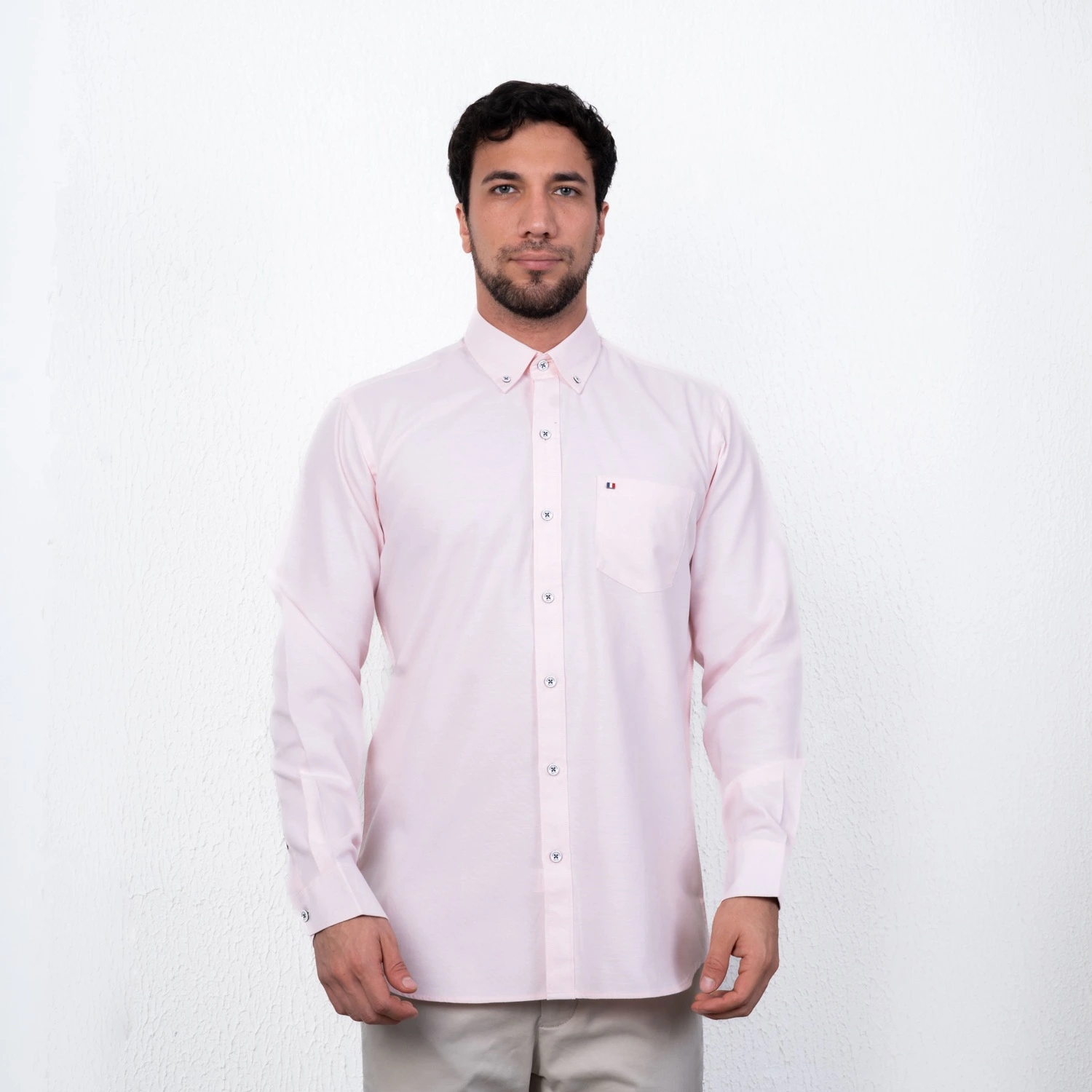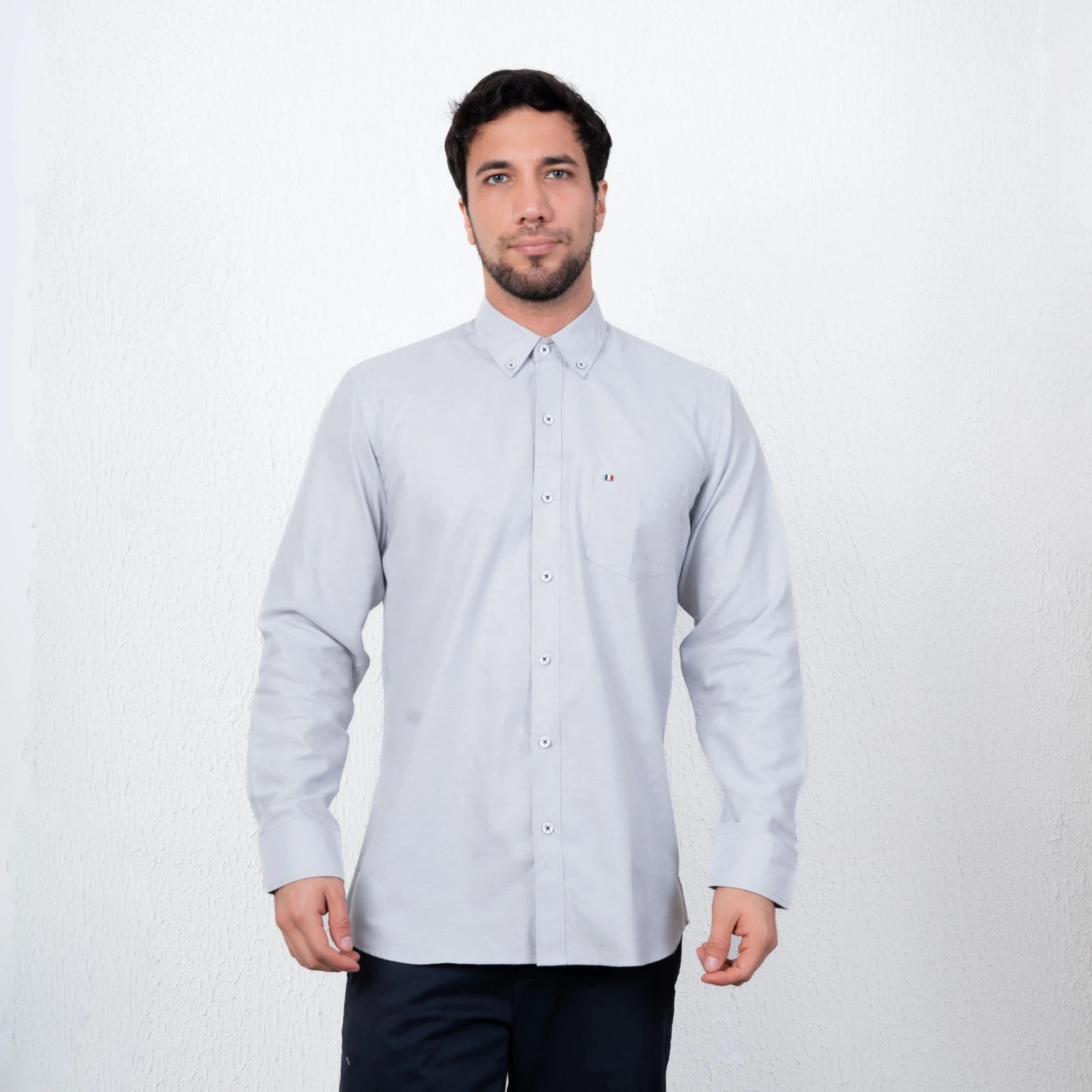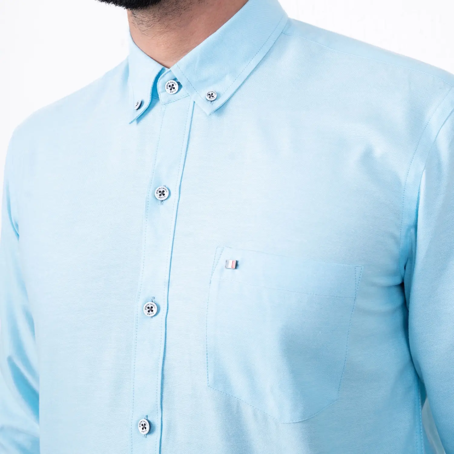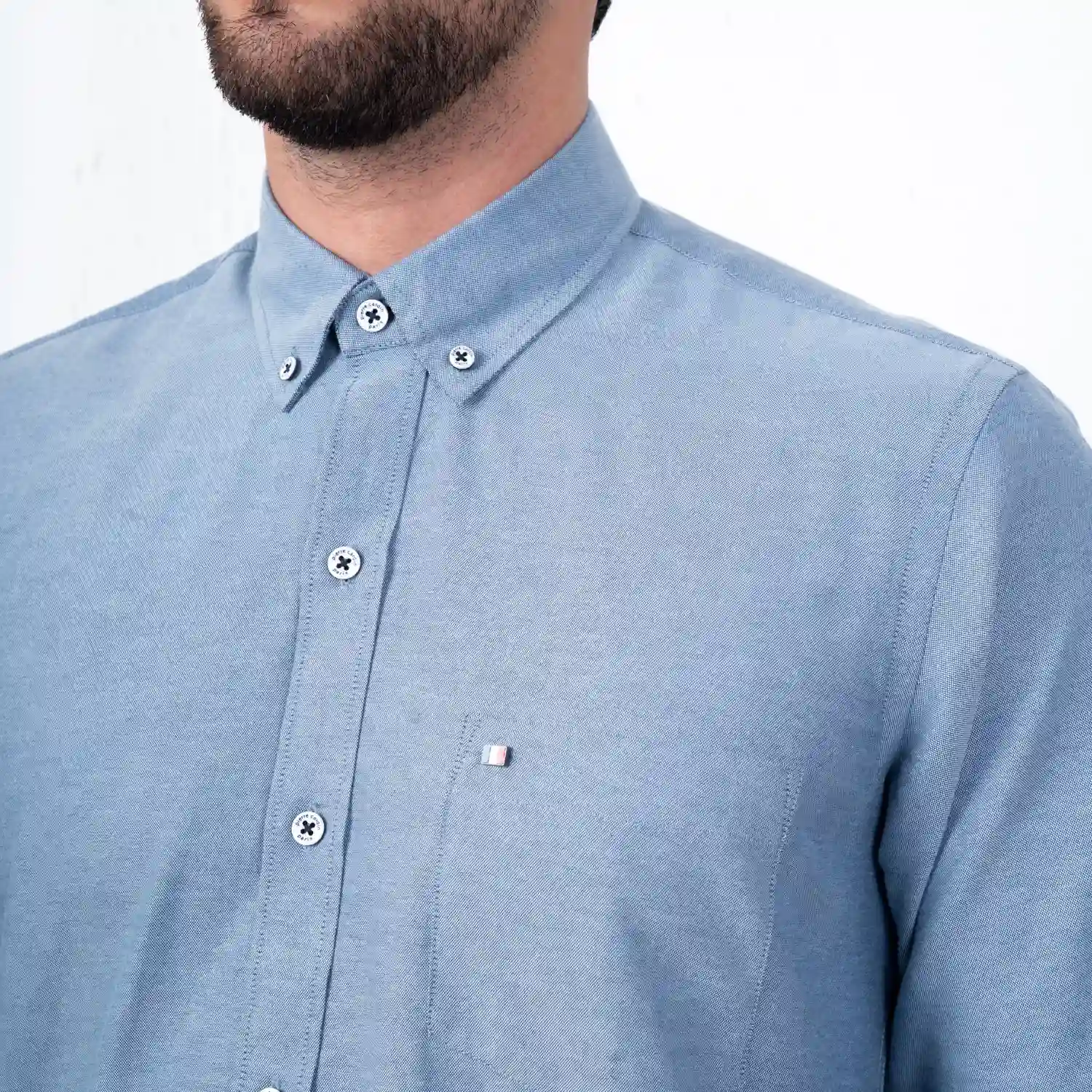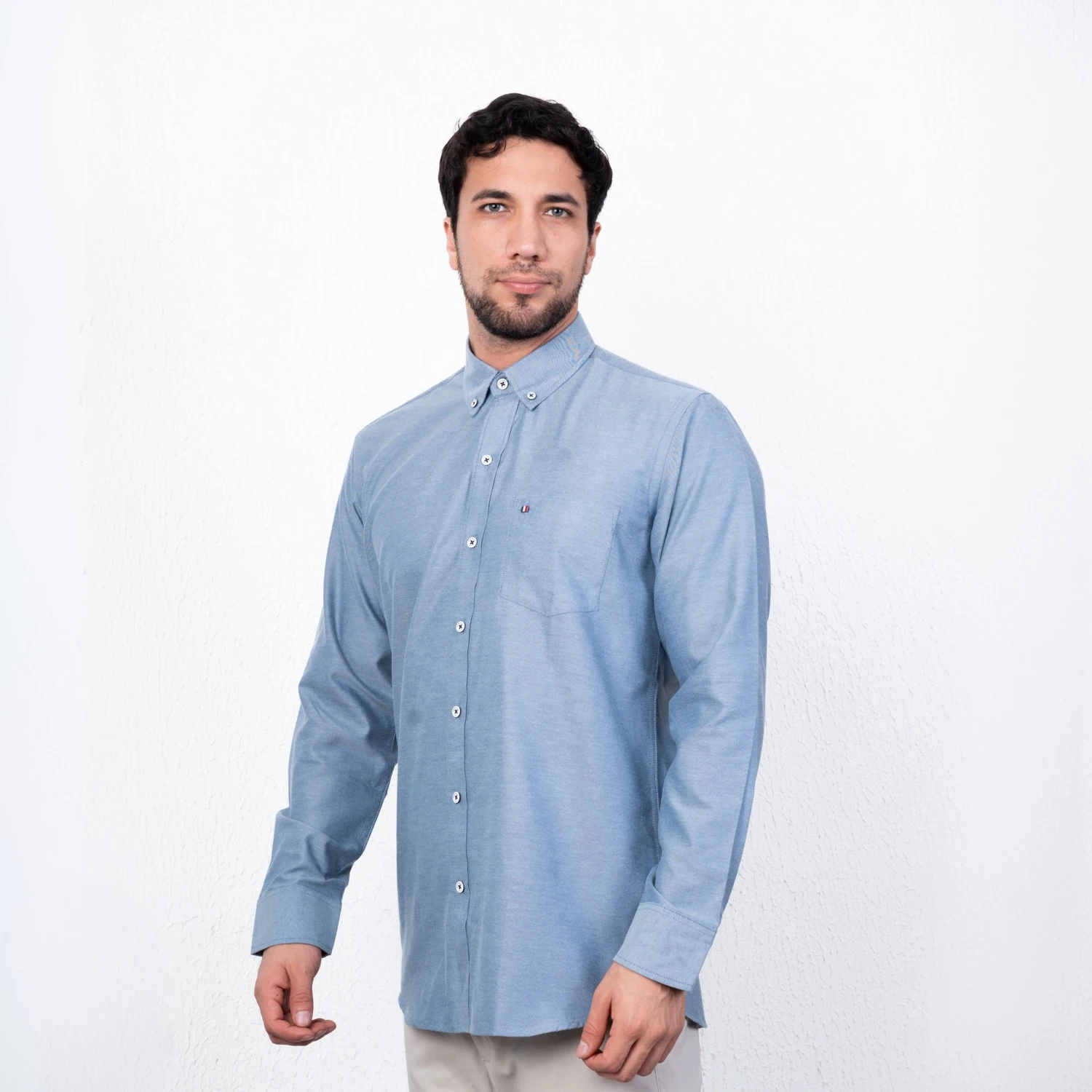 Camisa Oxford ML Color Entero Etiqueta Azul con diseño Francés.| Composición 62% Algodón y 38% Poliester.| Tela con diseño color entero.| Botones personalizados en contraste.| Aplicación de bandera francesa metalica en el bolsillo.| Cuello Buttondown| Aplicación de tela mil rayas en contraste al interior de la media luna y los puños.| Tela Oxord.| Apertura de puños con 2 botones.| Aplicación de cinta Tipping en el cuello en contraste.| Aplicación de hilo en contraste en los botones.