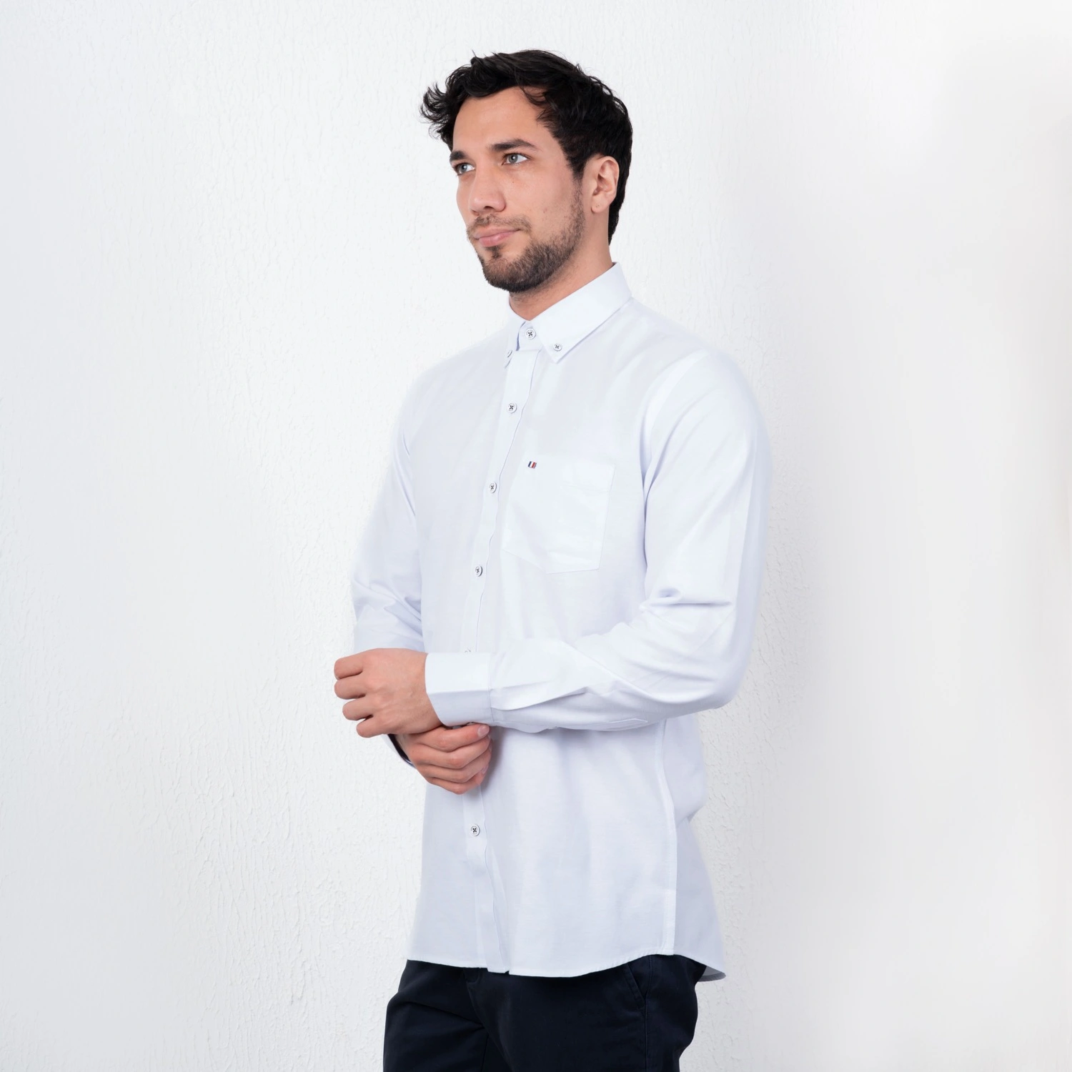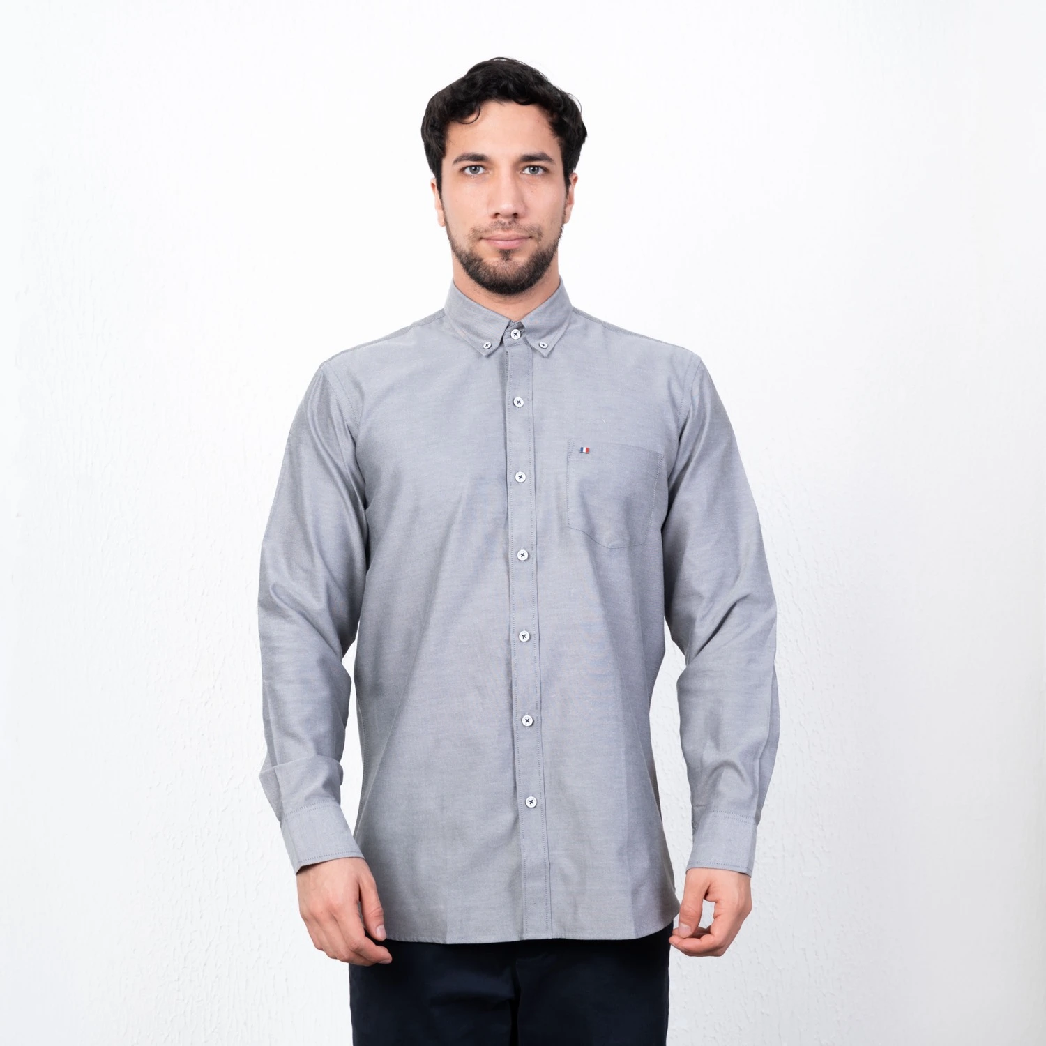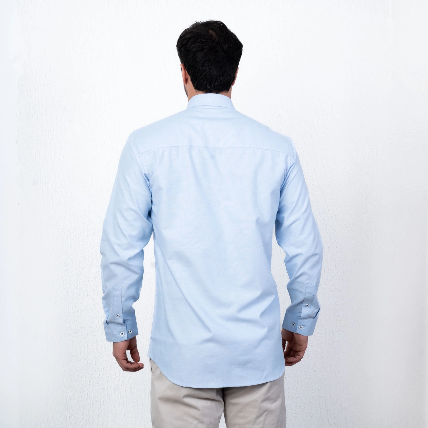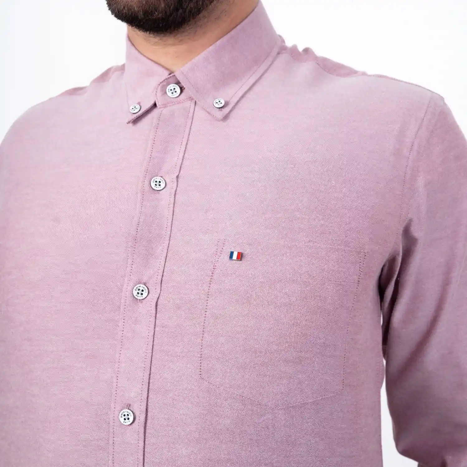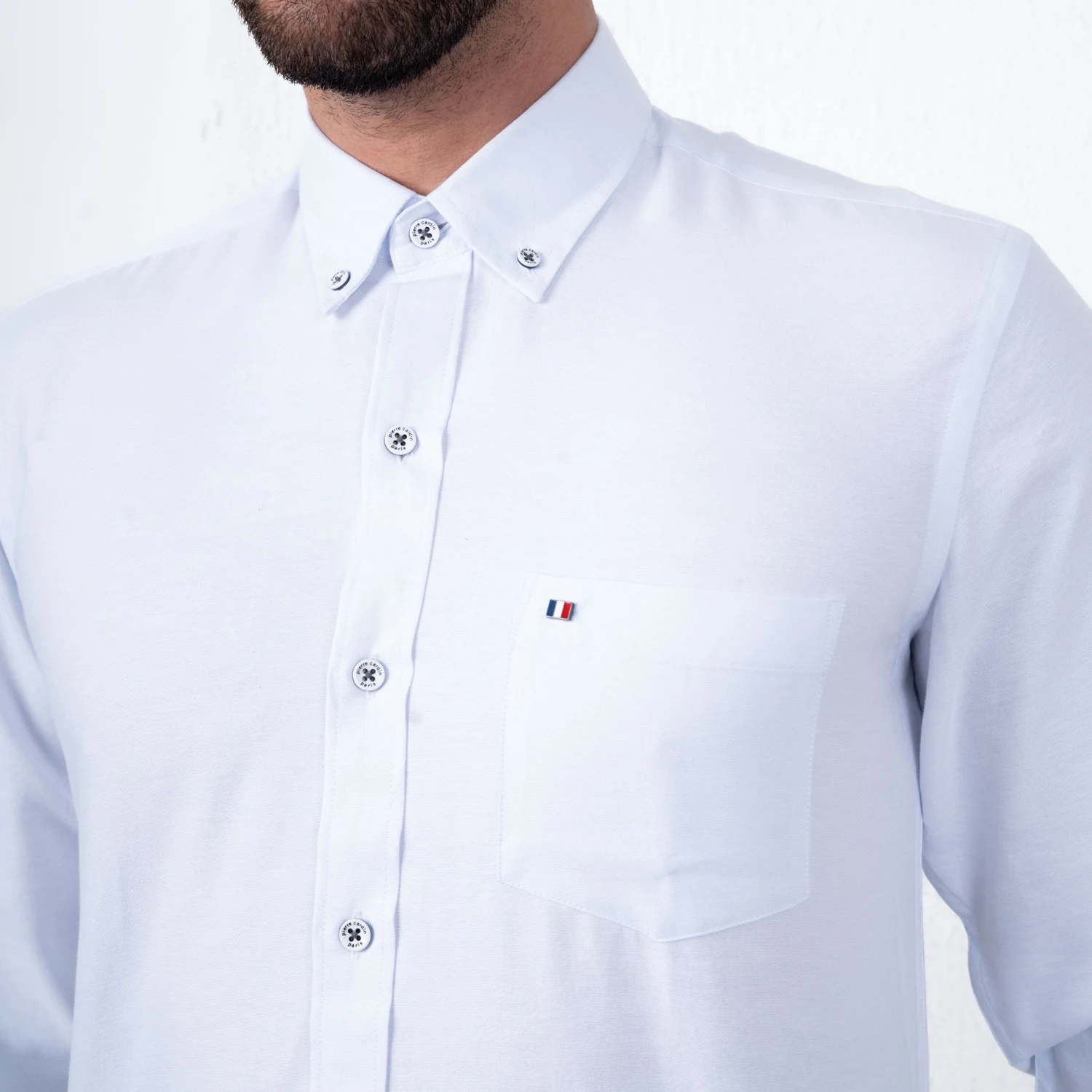 Camisa Oxford ML Color Entero Etiqueta Azul con diseño Francés.| Composición 62% Algodón y 38% Poliester.| Tela con diseño color entero.| Botones personalizados en contraste.| Aplicación de bandera francesa metalica en el bolsillo.| Cuello Buttondown| Aplicación de tela mil rayas en contraste al interior de la media luna y los puños.| Tela Oxord.| Apertura de puños con 2 botones.| Aplicación de cinta Tipping en el cuello en contraste.| Aplicación de hilo en contraste en los botones.